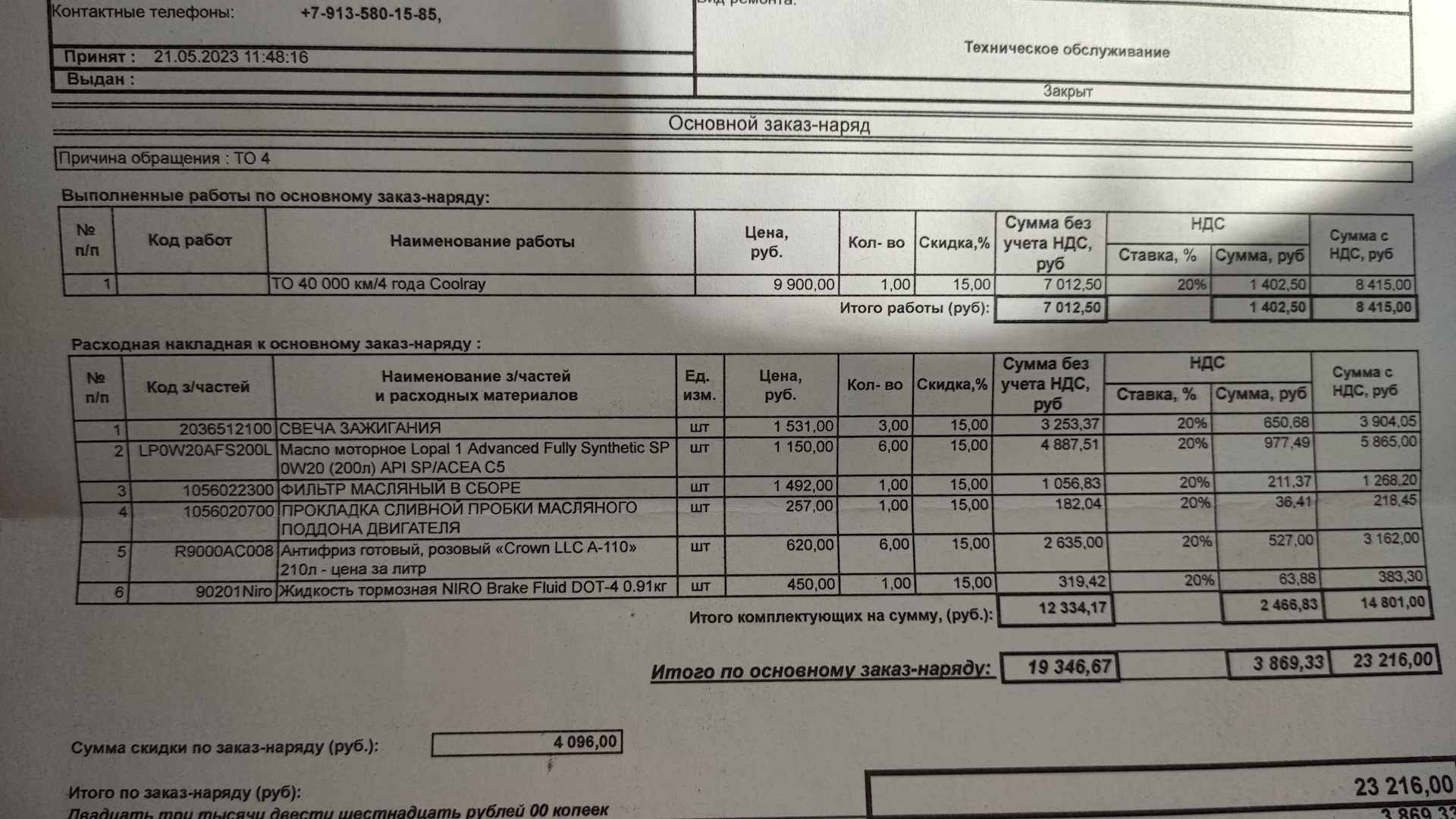 Салонный и воздушный фильтр привёз свои. Заменили свечи, масло, антифриз, тормозуху. Дали скидку какую-то, получилось бюджетно — 23200р. Думал будет хуже.