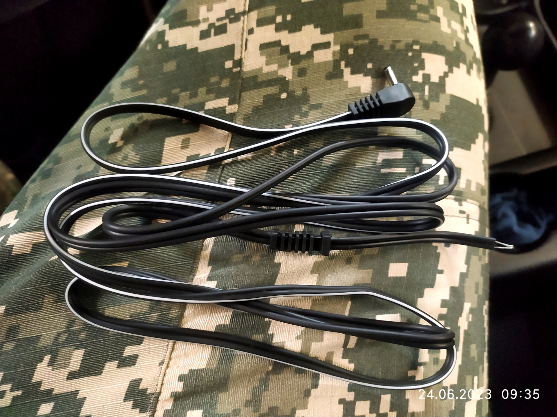 3. Прокладываем от розетки (прикуривателя) кабель до кронштейна (я временно проложил по стойке) длины хватает с запасом! В дальнейшем сделаю скрытую линию питания через реле от замка зажигания, уже ЗДЕСЬ заказал отдельно шнурок с разъёмом 3,5мм.