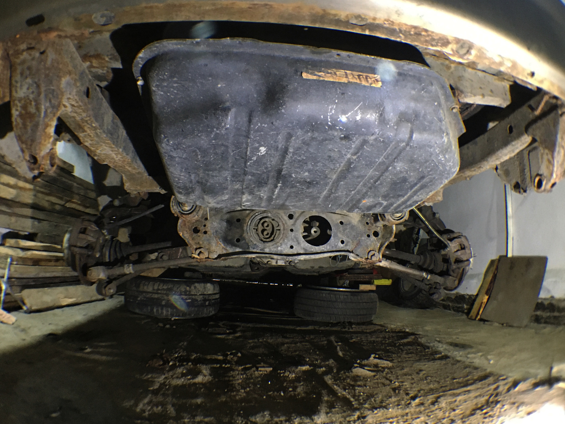 Итак, после зимовки автомобиль(хе-хе) — я так и не запускал, т.к. акунамататор зиму не пережил — пока не езжу — покупать новый я не стал, а брать б.у — который проживет неизвестно сколько — желания уже не возникает, поэтому решил пока заниматься так, перекатывая машину, если нужно. Но вот незадача, при первой попытке столкнуть его с места — я потерпел фиаско. Краун не двигался вообще никак, осмотрел все что мог — под колесами ничего нет, в колеса качнул по 3атм, чтобы максимально уменьшить сопротивление, упираюсь ногами в стену — не идет, понимаю, что явно что-то не так, пытаюсь залезть и посмотреть что может мешать, обнаруживаю, что подрамник лежит на приводе — прижав его: