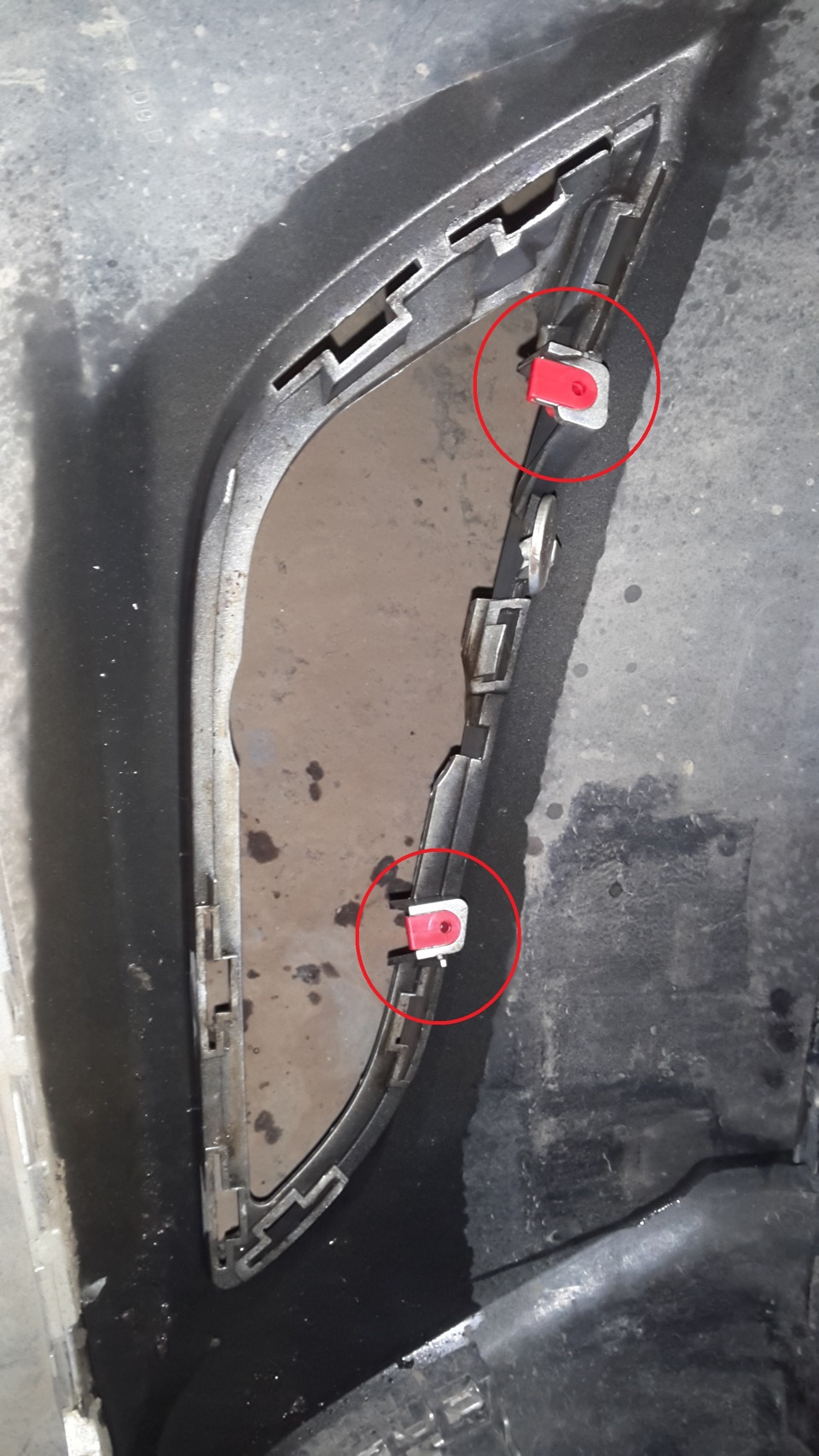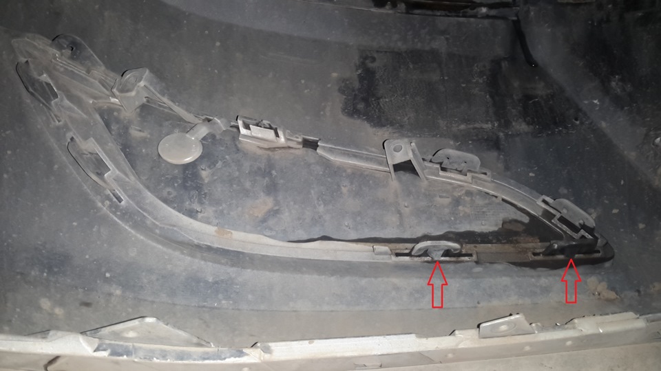 Ну начинать надо с старых решеток, обрызгал вокруг wd40, чтоб легче снимались. Снимаются достаточно просто, нажимаем на язычки и толкаем решетку, и она по-тихоньку выходит (снимать намного удобнее на машине их, если конечно на яме будет машина стоять). Затем одел зажимы на уши креплений, приложил ПТФ, и прикрутил)