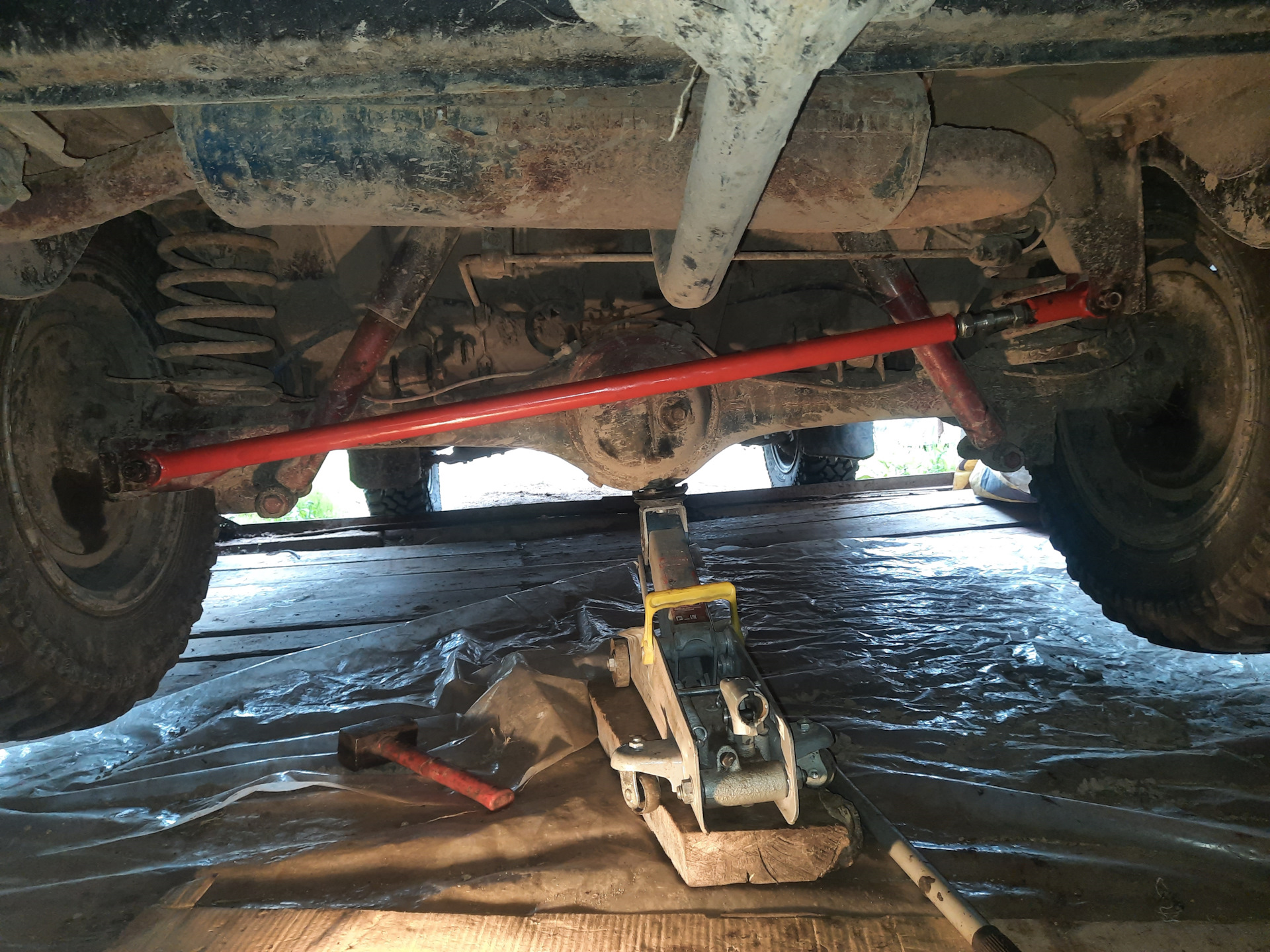 Заметил, что задние колеса чуть стоят не напротив передних, ну подумал из за колес, проставок под пружины чуть мост ушел. Уже хотел сварганить самодельную, но увидел, что на озоне готовая 1000р, а купить в магазине необходимые детали вышло бы на 600р плюс некоторый гемор. Поэтому купил на озоне, в целом неплохо сделано. И по итогу родную где то погнул.