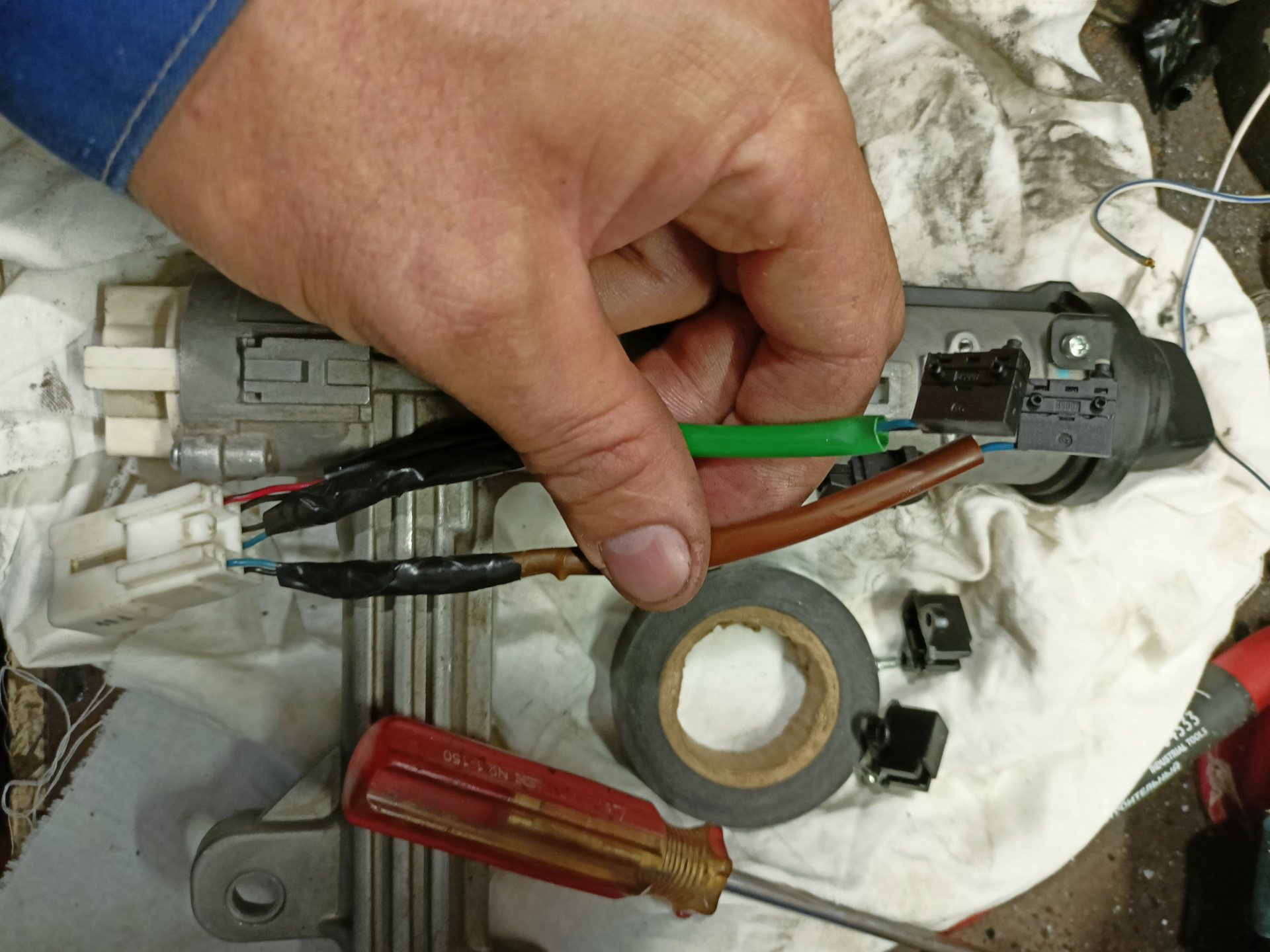 Итак, снял я замок зажигания, маленьким зубильцем открутил два болта, вытащил замок зажигания, а на нем висят два провода от сигнализации, их было совсем не видно, когда снимал разъемы, они были припаяны к замку. И могли замыкать на корпус. Провода шли от концевиков, на замке стоит два концевика, один срабатывает при нажатии на личинку, второй, наверное, отвечает за выключенное положение.