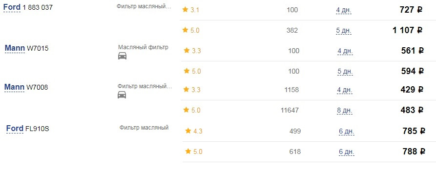 Взамен mann 7015 старого образца заказал сначала один фильтр motorcraft (он же fl-910s) на автодоке. Артикул и цены видно на фото. Подошёл идеально. Недолго думая заказал ещё один на запас. Заказывал именно с направления дилер (шанс подделки минимален). Пришли оба оригинал. Продаются в основном дороже 1000р, но можно урвать дешевле.