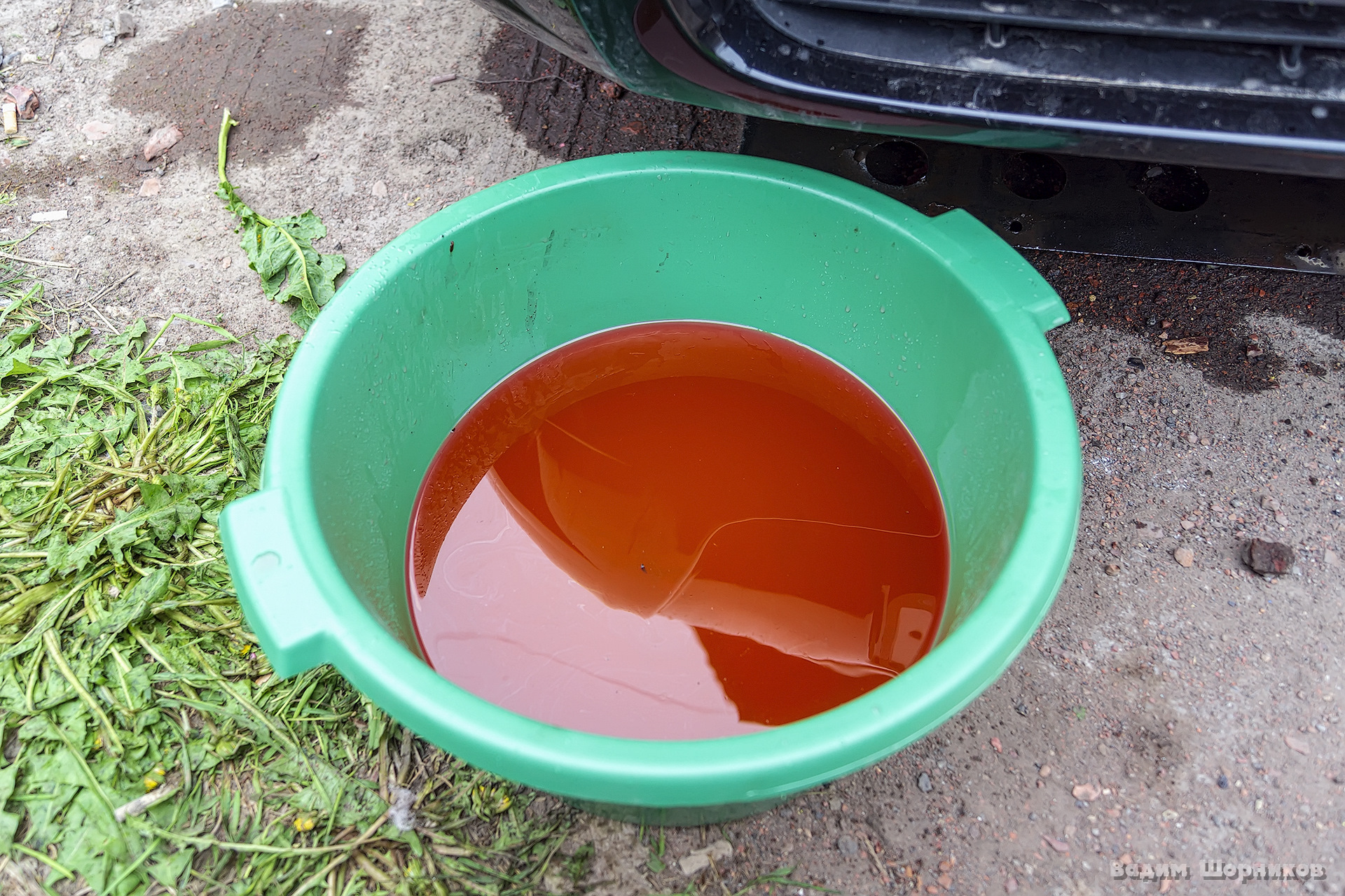 Слил старый антифриз, закрутил пробки, взбултыхал флакон №1 с кислотной составляющей промывки Лавра, вылил его в расширительный бачок и залил дистилированную воду. Прогрел двигатель, по мере развоздушивания системы, доливал в бачок водичку. Дал двигателю поработать 30 минут. За это время пару раз срабатывали вентиляторы радиатора. Потом включил печку на полную для того, чтобы быстрее расхолодить двигатель. С работающей печкой температура антифриза снизилась до 77°. Заглушил двигатель и ждал около часа, когда двигатель остынет до температуры ниже 50°. Слил воду с первым компонентом промывки. Какая грязь оттуда слилась! Это при том, что антифриз регулярно менял. Смутили масляные разводы на поверхности антифриза. Откуда масло? Может с блока цилиндров смыло?