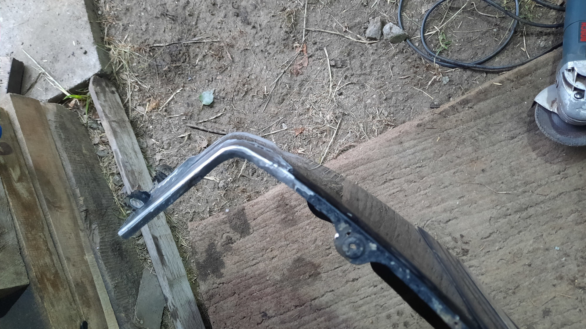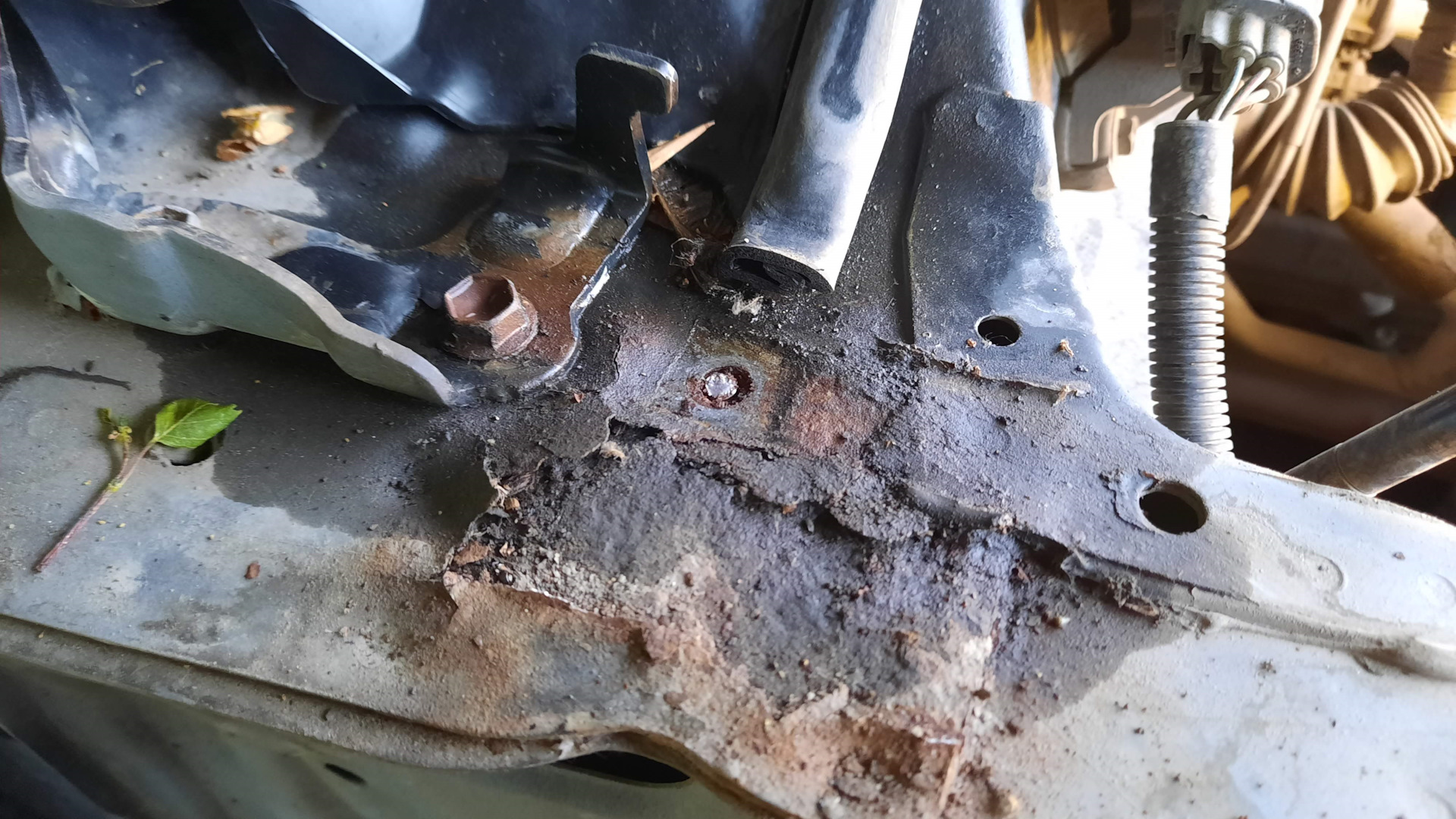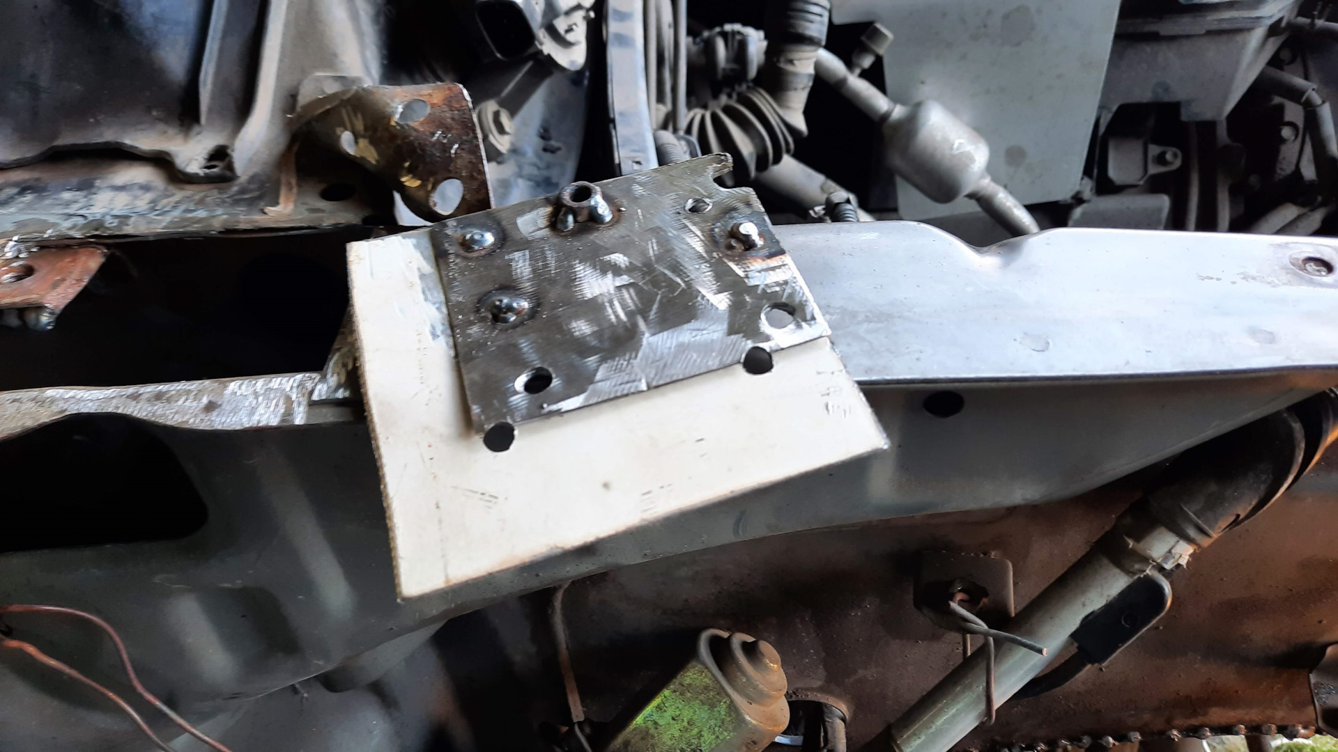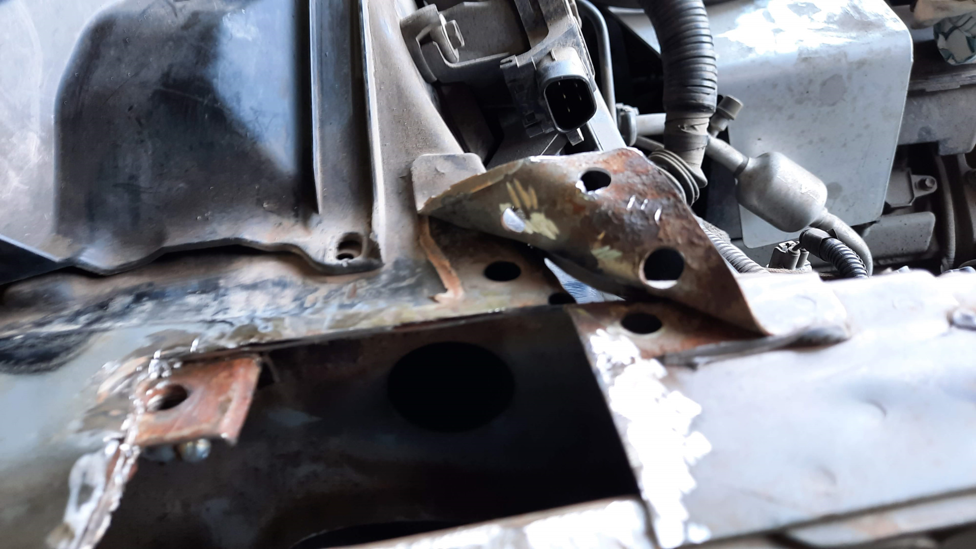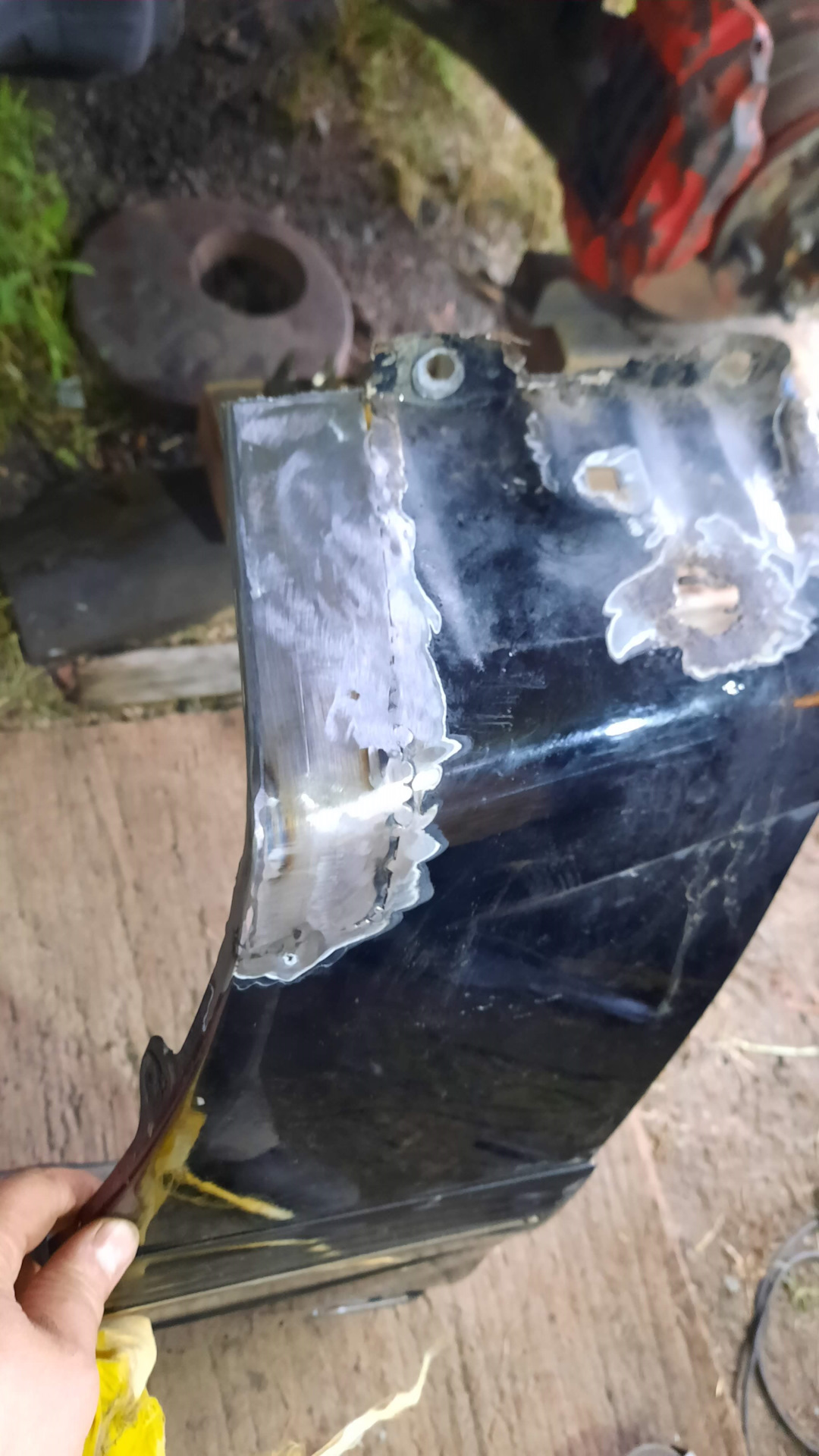 Далее были не вошедшие в кадр небольшая дыра в передней части арки крыла над бампером, ремонт подбитого угла усилителя переднего бампера, были выкручены большинство заломышей, в помощь пошла газовая горелка, а невыкрутившиеся, были высверлены, подварены новые гайки взамен просверленных, изготовлен новый кронштейн крепления крыла и подправлен один из старых. Отремонтированы крепления подножки.