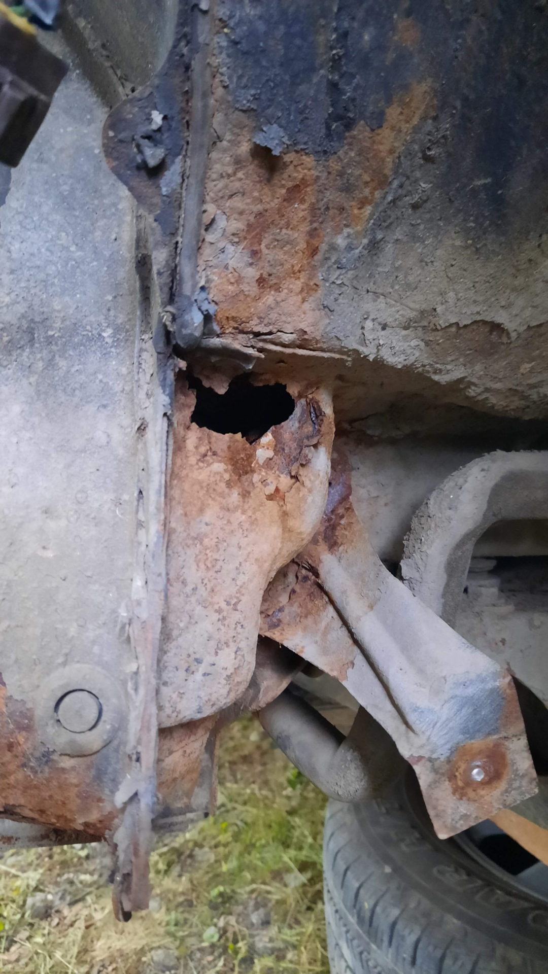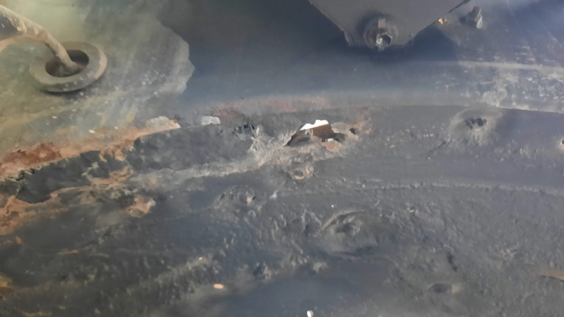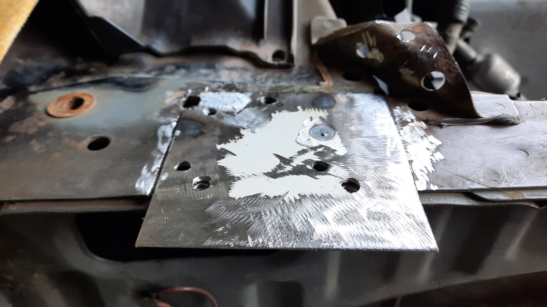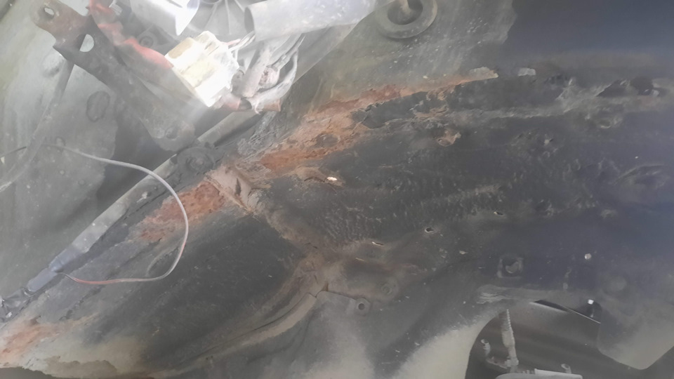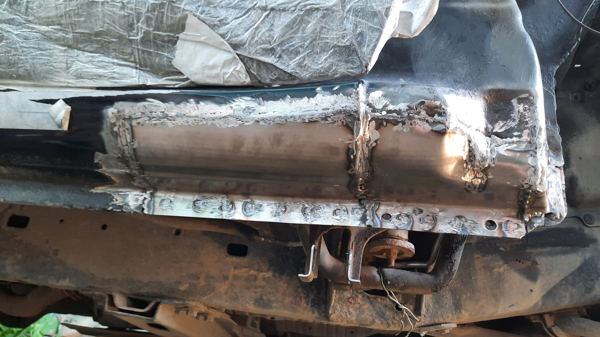 На следующий день распотрошил передний угол правого порога. Опять, фоток вскрытого порога не сделал. Снова три слоя металла, в ход пошел ремонтный порог, вырезал его под косым углом, чтобы сформировать расширение, выкроил из порога и холодильника сложные заплаты под углом крыла. Карман к усилителю упростил. На это ушло два дня.