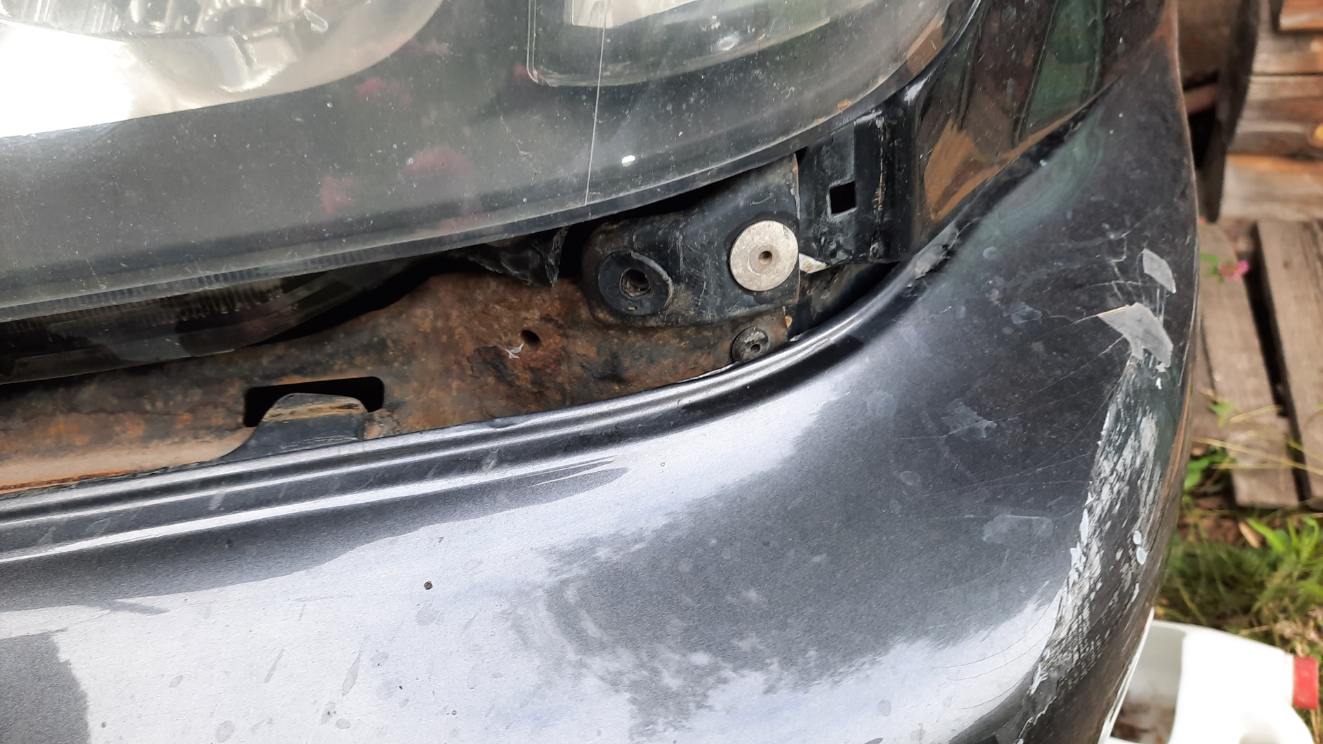 Сняли капот и, снимая петлю, сломал еще один болт М8. Снял воздушный фильтр, отсоединил проводку, открутил фару и бампер. На этом первый день закончился.
