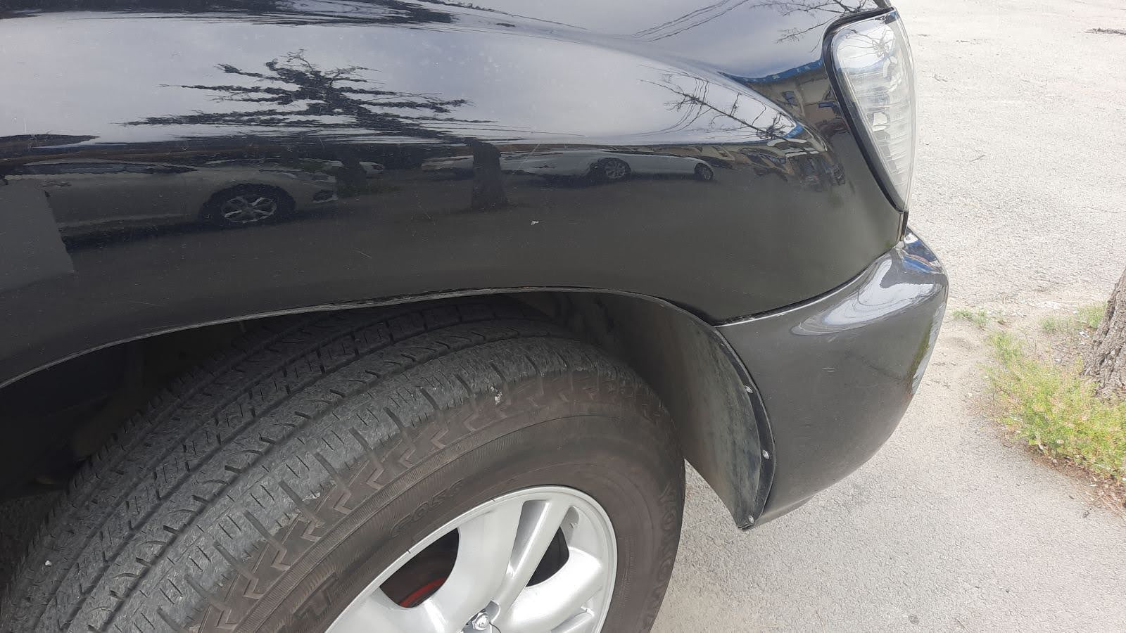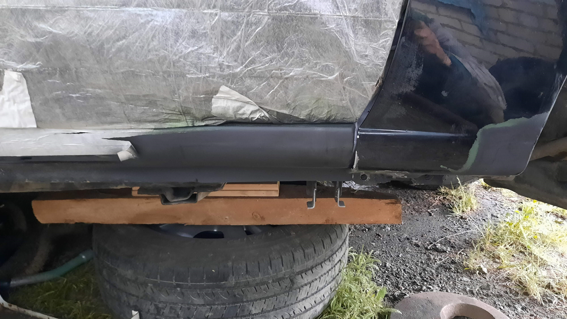 Потом зашпатлевал порог, поставил крыло на место, поставил правильно на место резиновый брызговик на крыло. Новые задние ремонтные арки даже не расчехлял. Временно закрасил места ремонта краской из баллончика. Все работы сделали вдвоем, сын на подхвате, за 9 дней, с 20 по 28 июня. Самое долгое, это изготовление и подгонка заплат, наверное, две трети всего времени работы(((.