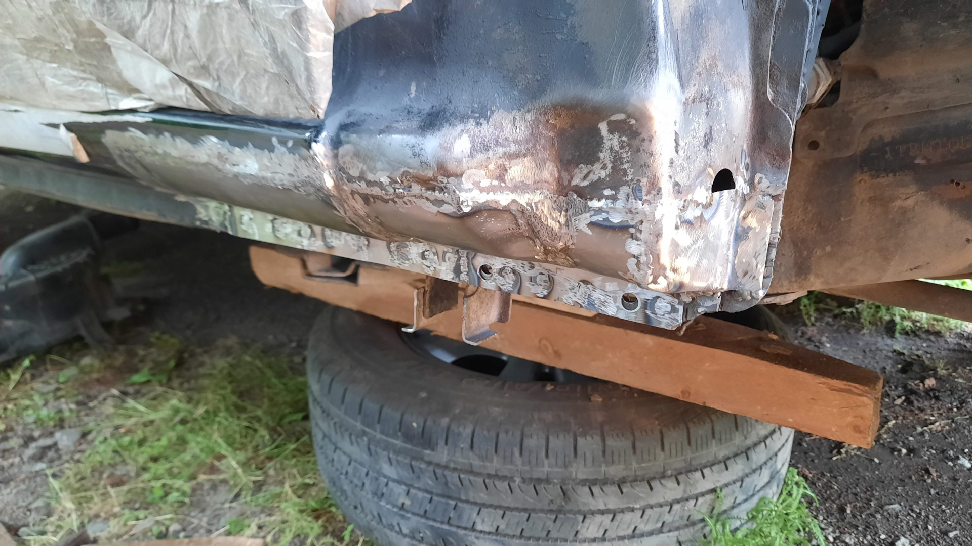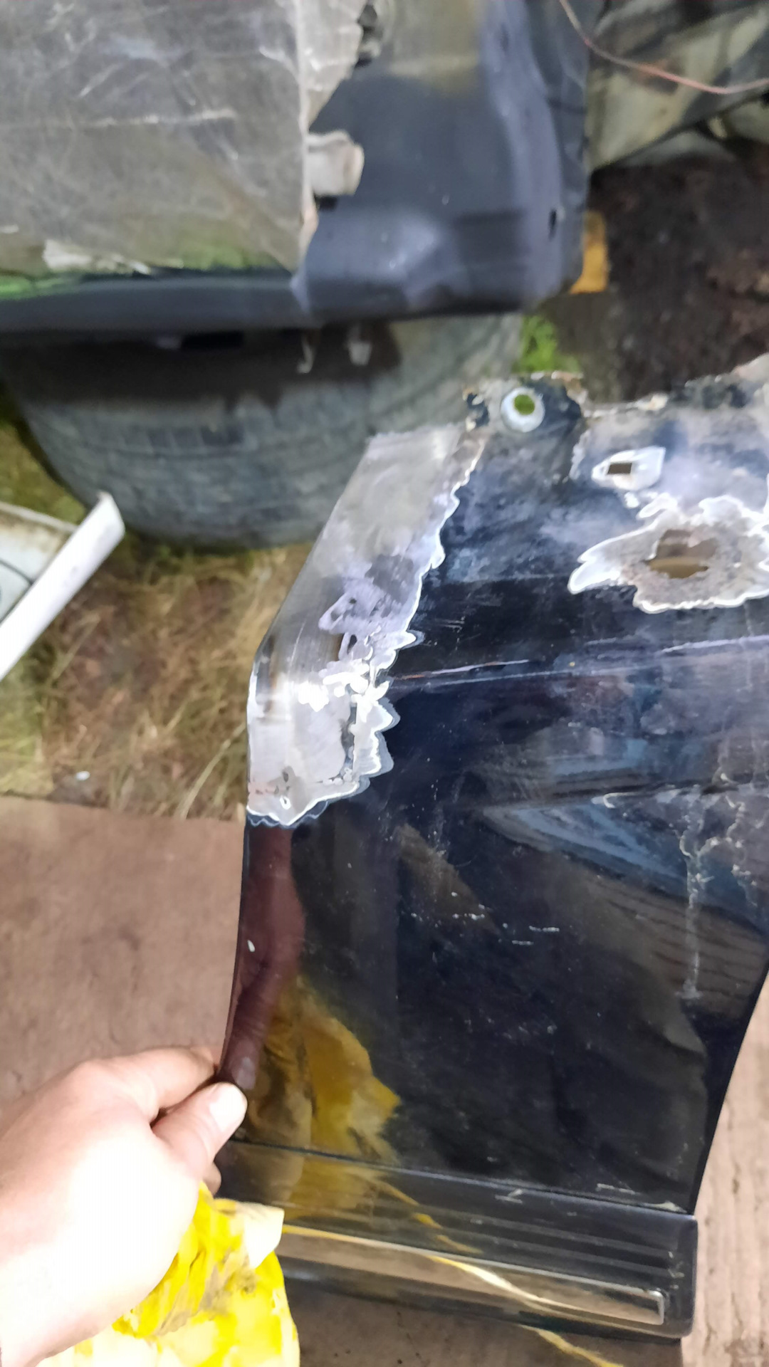 Наутро начал я с брызговика, так всё равно ничего потом не видно будет, вырезал гниль, подготовил заплаты из куска холодильника. Ну, с Богом приступим, подумал я и началось. Приваривал по точке, подбивал молотком, и так по периметру. Фоток этого момента почему-то не сделал.