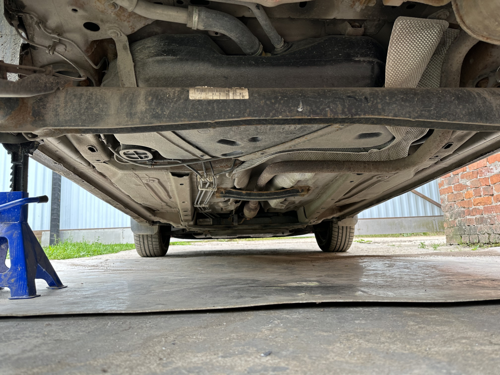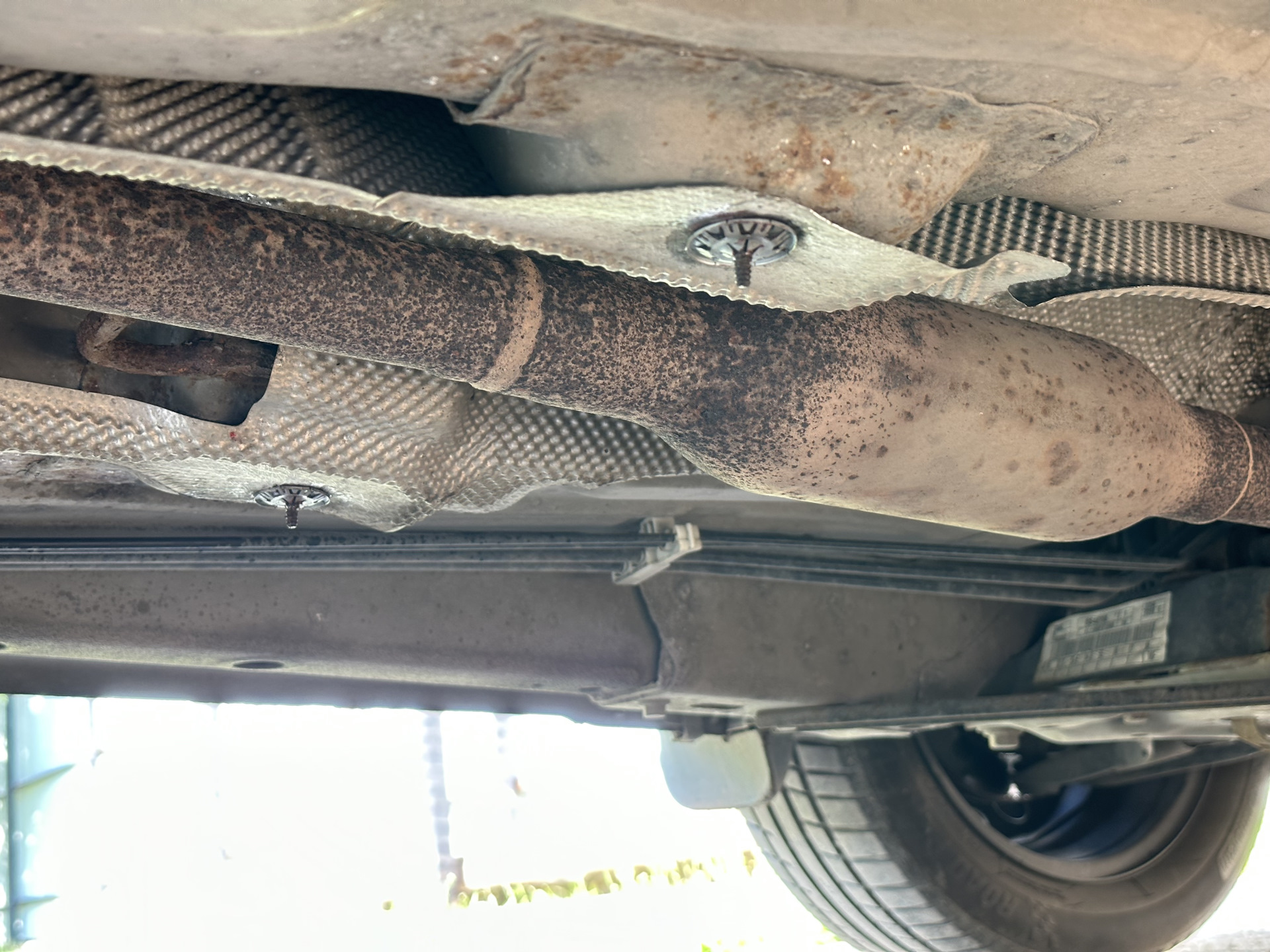 Установил автомобиль на страховочные опоры, отключил клемму с аккумулятора, снял с подвесов заднюю часть выхлопа, открутил крепежи теплозащитного экрана.