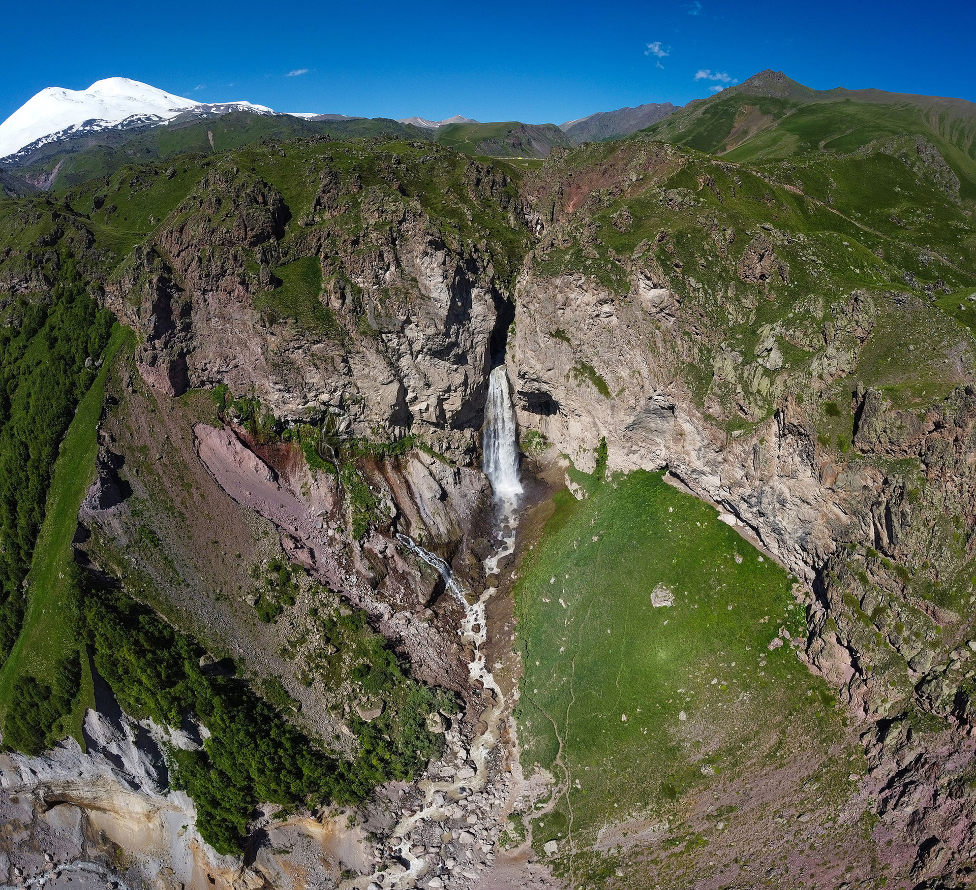 У меня была цель полетать вокруг водопада, залететь выше него и посмотреть что с той стороны (я знаю, что там альплагерь и туда дорога идет прямо по краю горы). Хотелось Эльбрус поснимать с разных ракурсов.