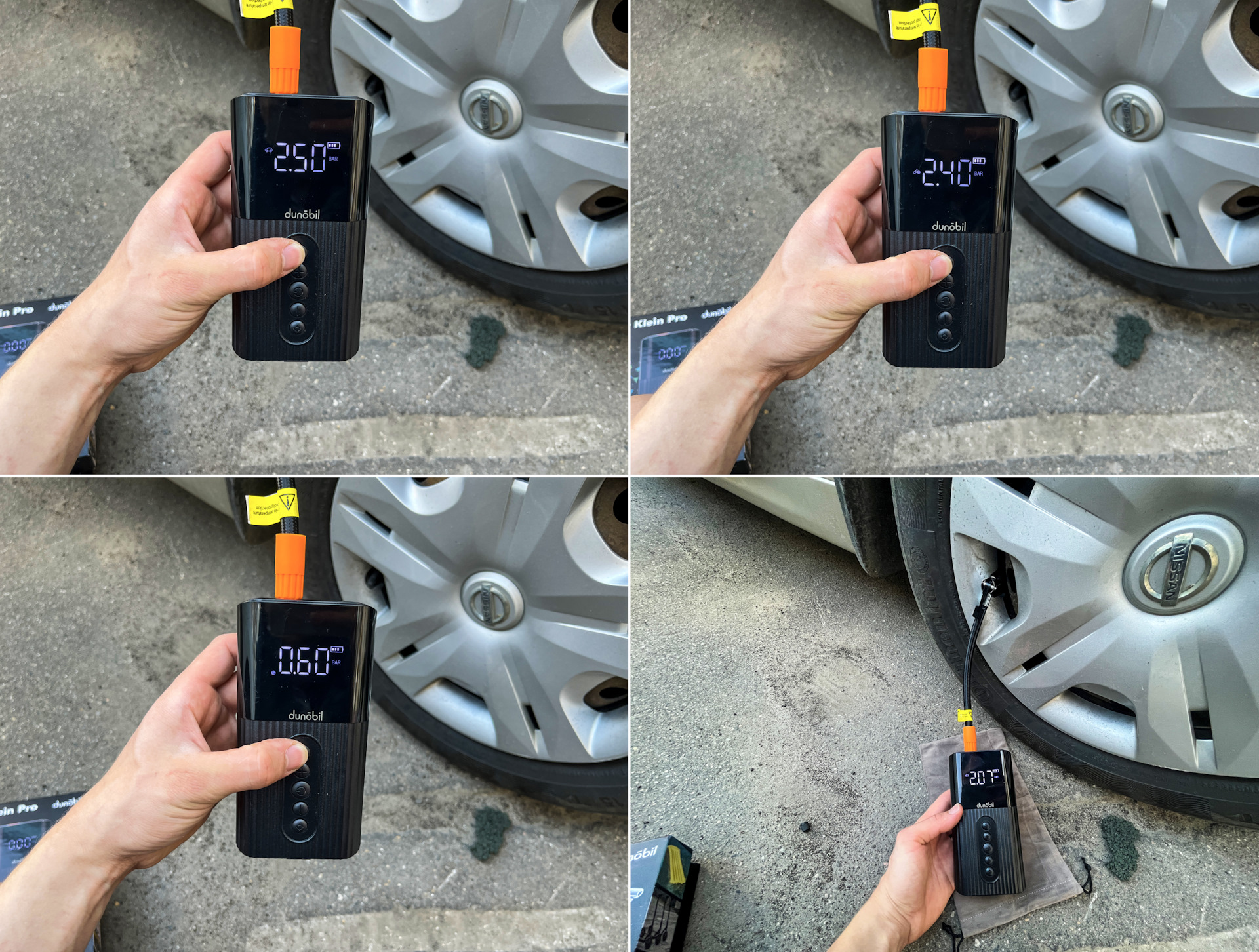 Перед началом – устройство было полностью заряжено до 100%. Затем я спустил первое колесо, включил устройство, и параллельно спускал следующее. Время накачки одного колеса 15 диаметра, с 0ого значения до значения в 2.5 Bar, составило менее 6 минут. Для автомобильного компрессора аккумуляторного типа – это более чем адекватный показатель, чем и порадовал меня. Далее, накачав второе колесо – устройство нагрелось, и время непрерывной работы составило около 11 минут. В связи с этим я решил сделать паузу, и продолжить тест на следующий день. После накачки двух колес – заряд устройства был на уровне 3 из 4х делений. На следующий день, также спустив колесо и подключи компрессор, уровень заряда снизился до 2х из 4х делений, что в принципе было похоже на реальную картину. С легкостью накачав третье колесо, я сразу подключи устройство для накачки четвертого пустого колеса, и накачав примерно 0.9 Bar – устройство выключилось, аккумулятор полностью разрядился.