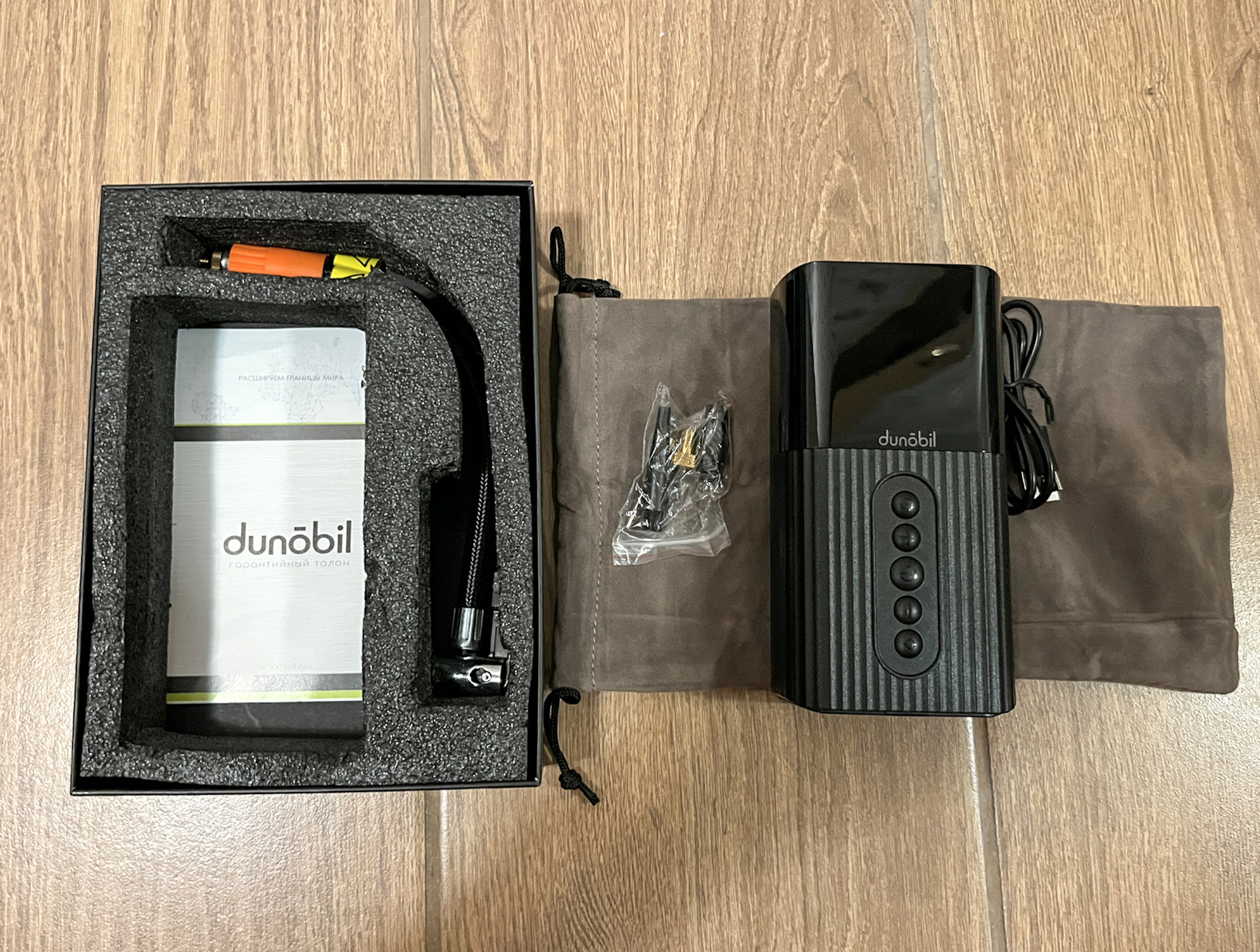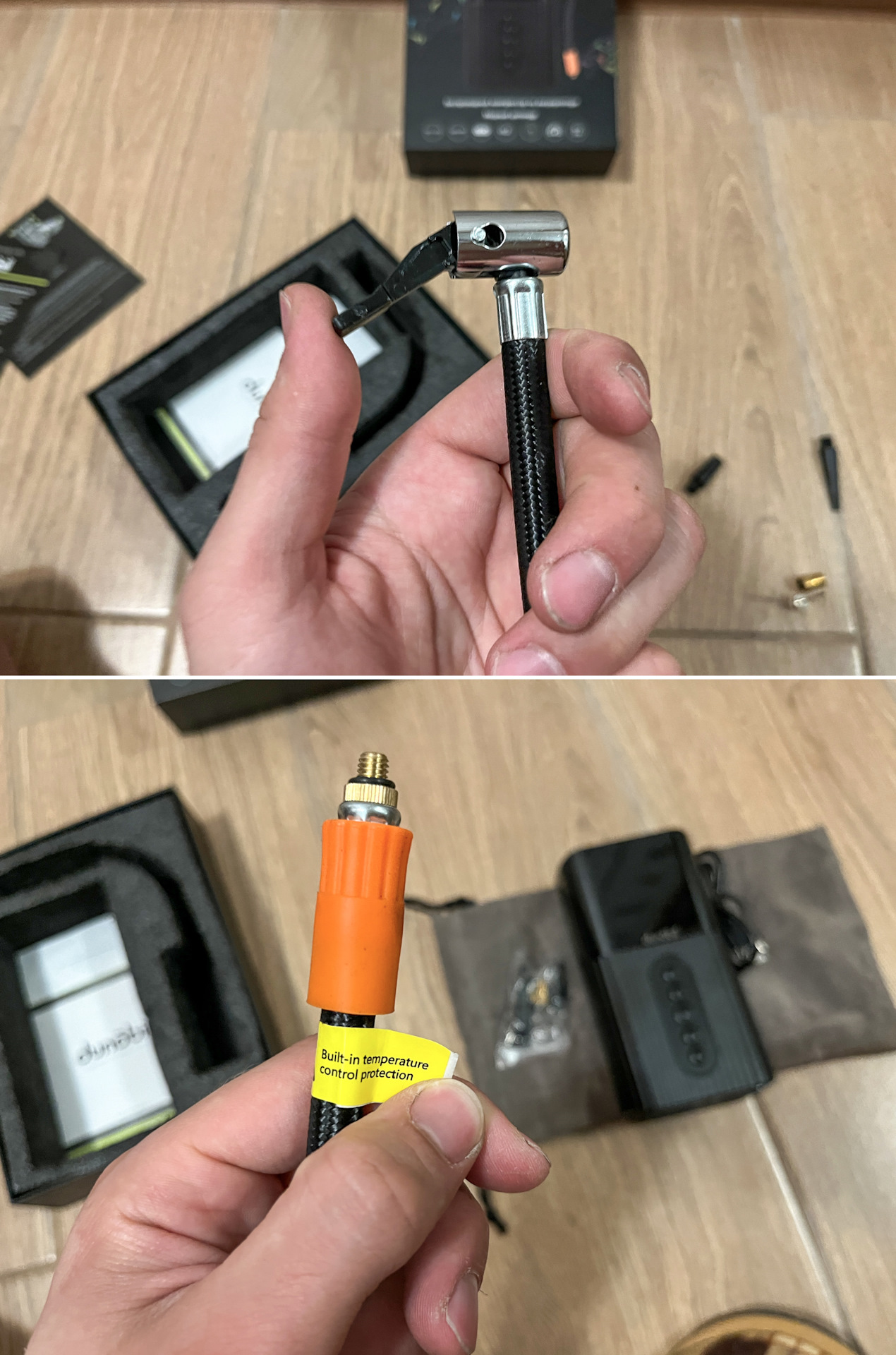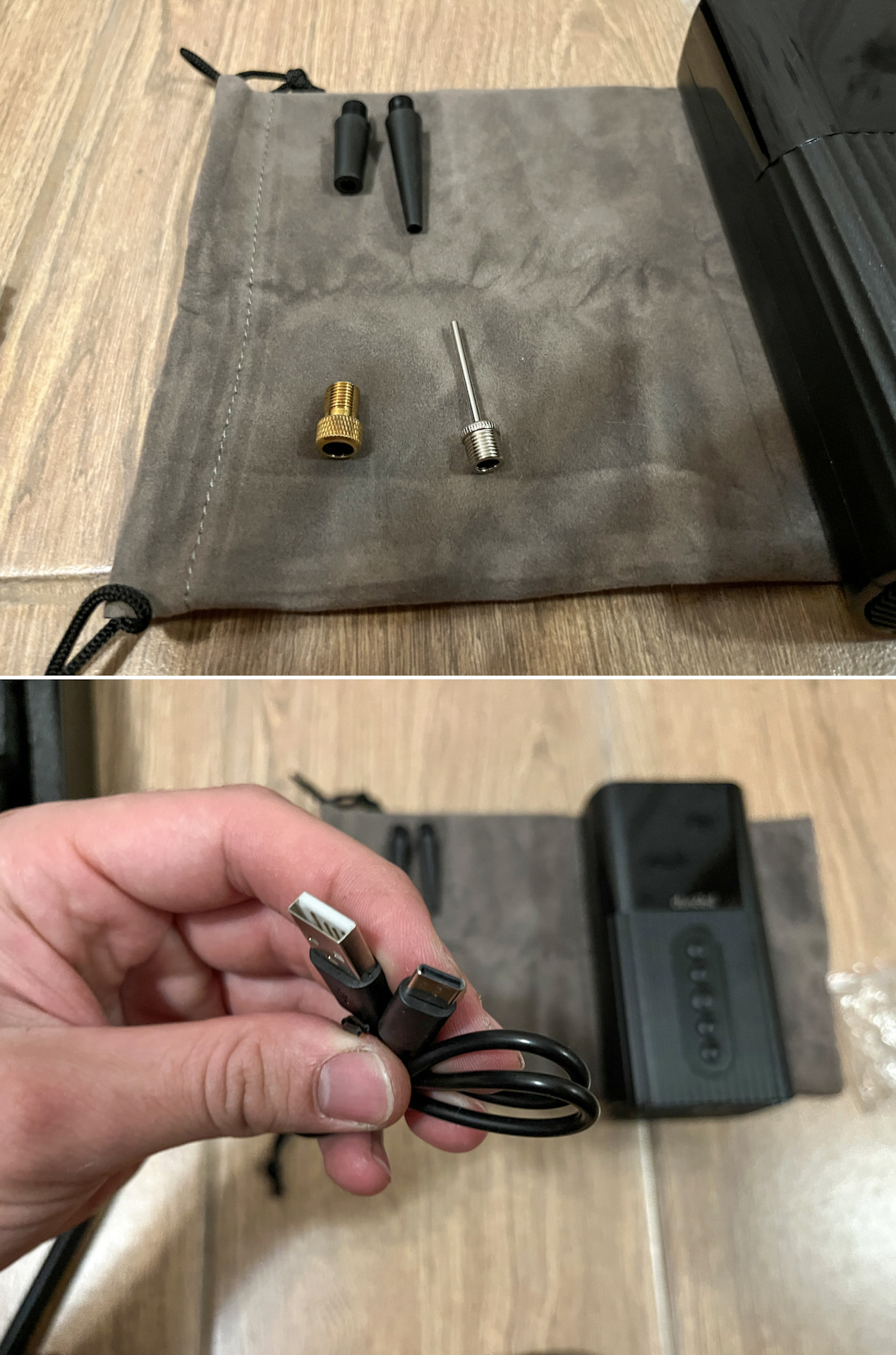 В комплектацию устройства входит сам компрессор, шланг с быстросъемом длинной 20 см, зарядный кабель USB A/Type C, 3 игольчатых адаптера, 1 клапан presta (это что-то на велоспортивном), мягкий мешочек для всего набора и документация.