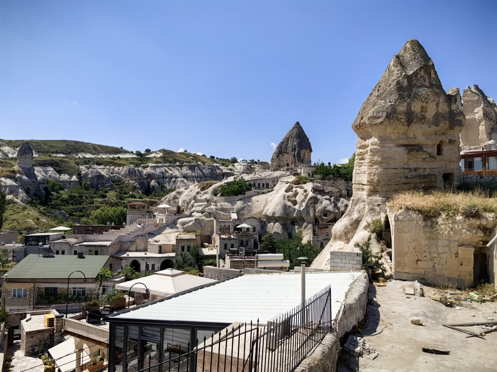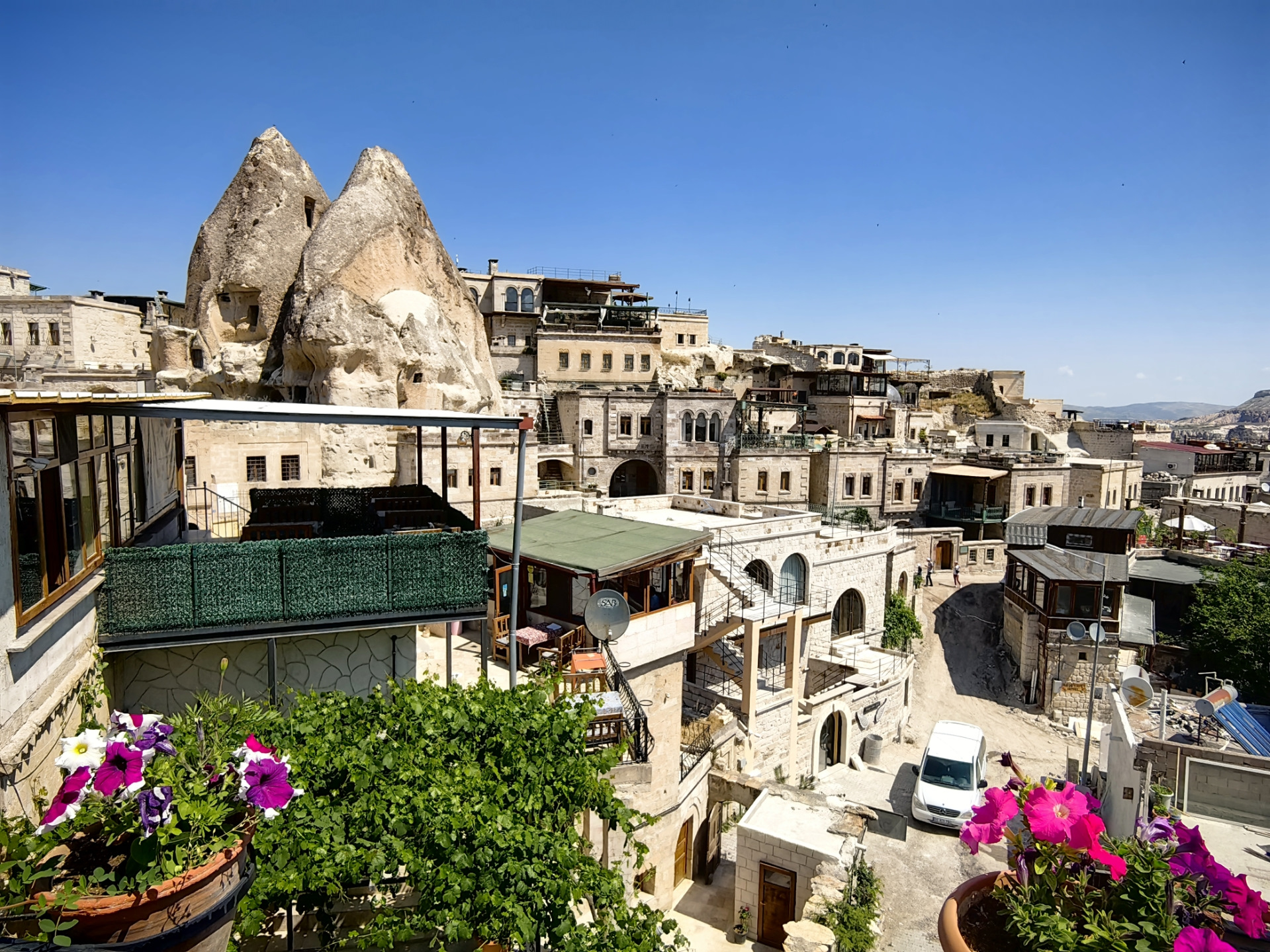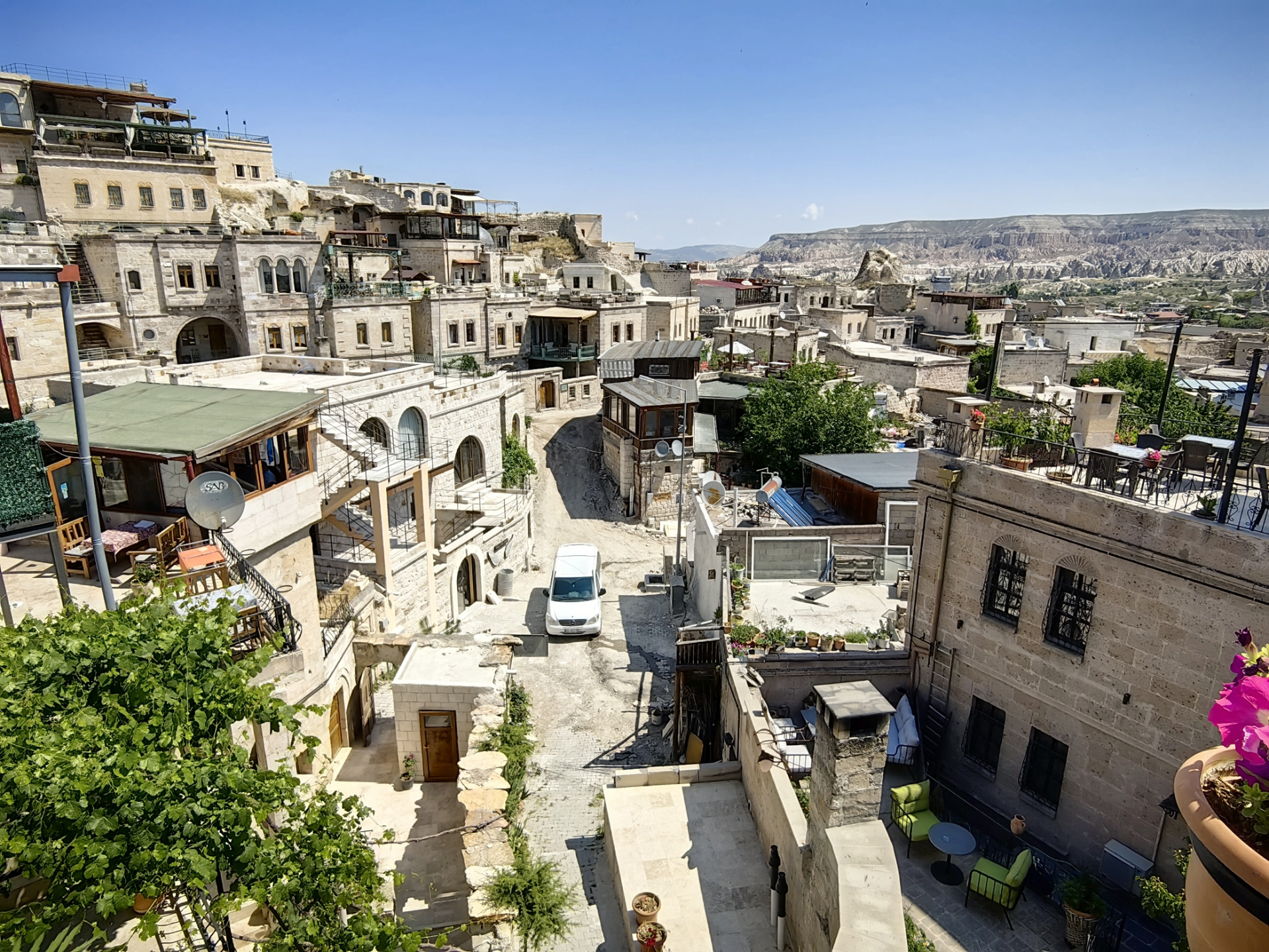 Отель забронировали на booking Emin Gave hotel, обошёлся в 13000 руб. за 2 ночи на троих с завтраками. Отель небольшой но очень уютный и хороший. Две террасы для завтраков с отличными видами.