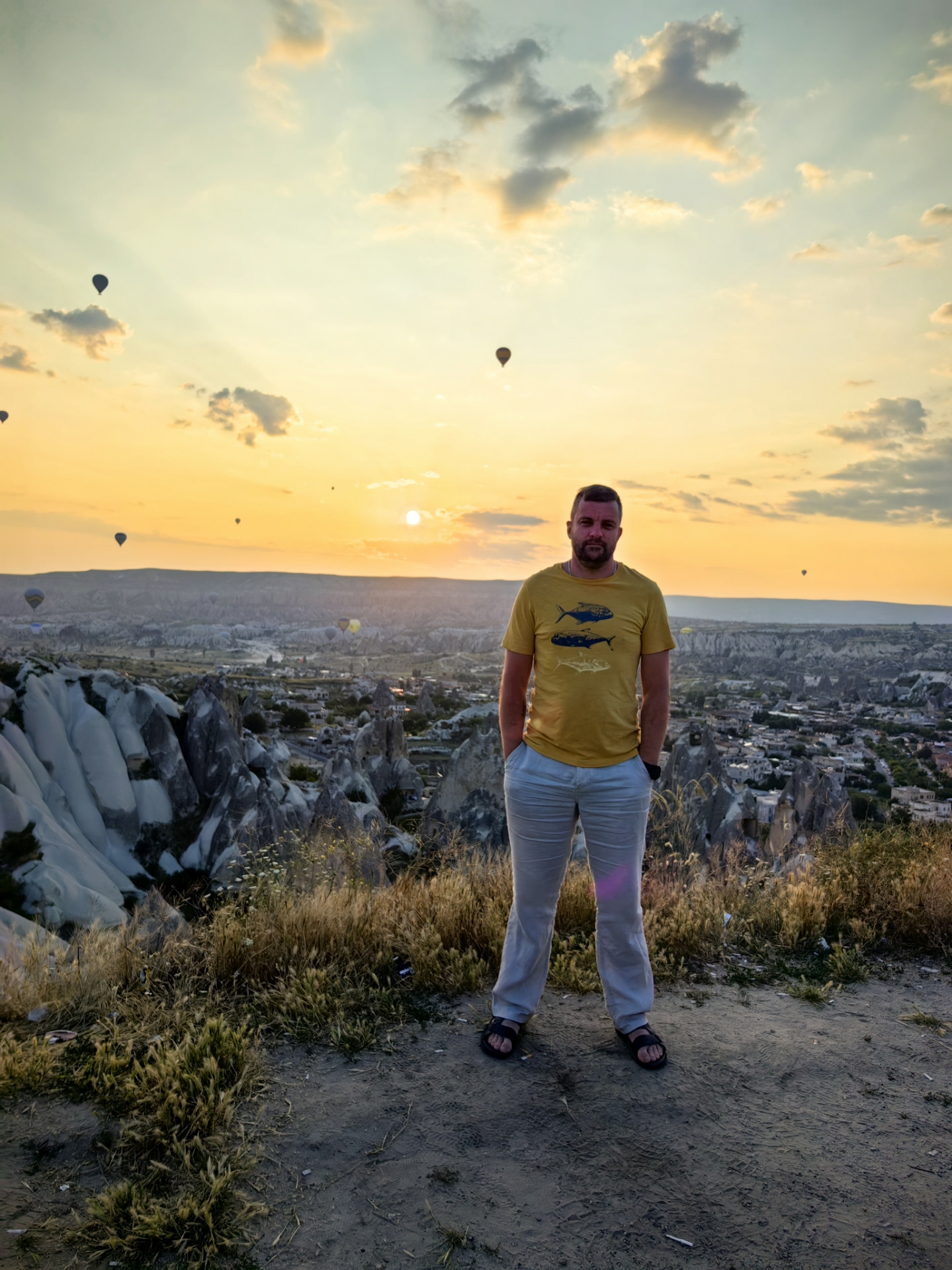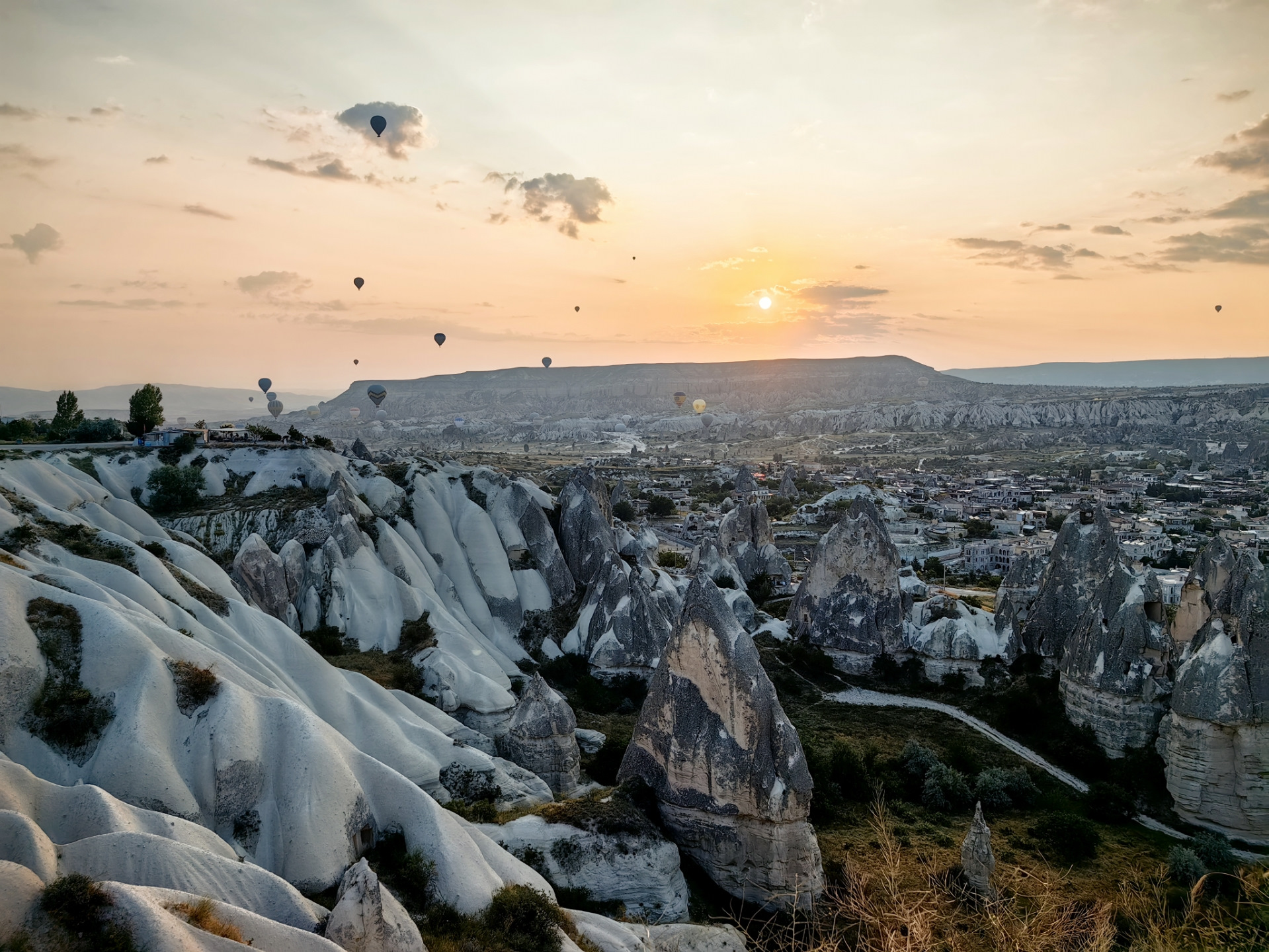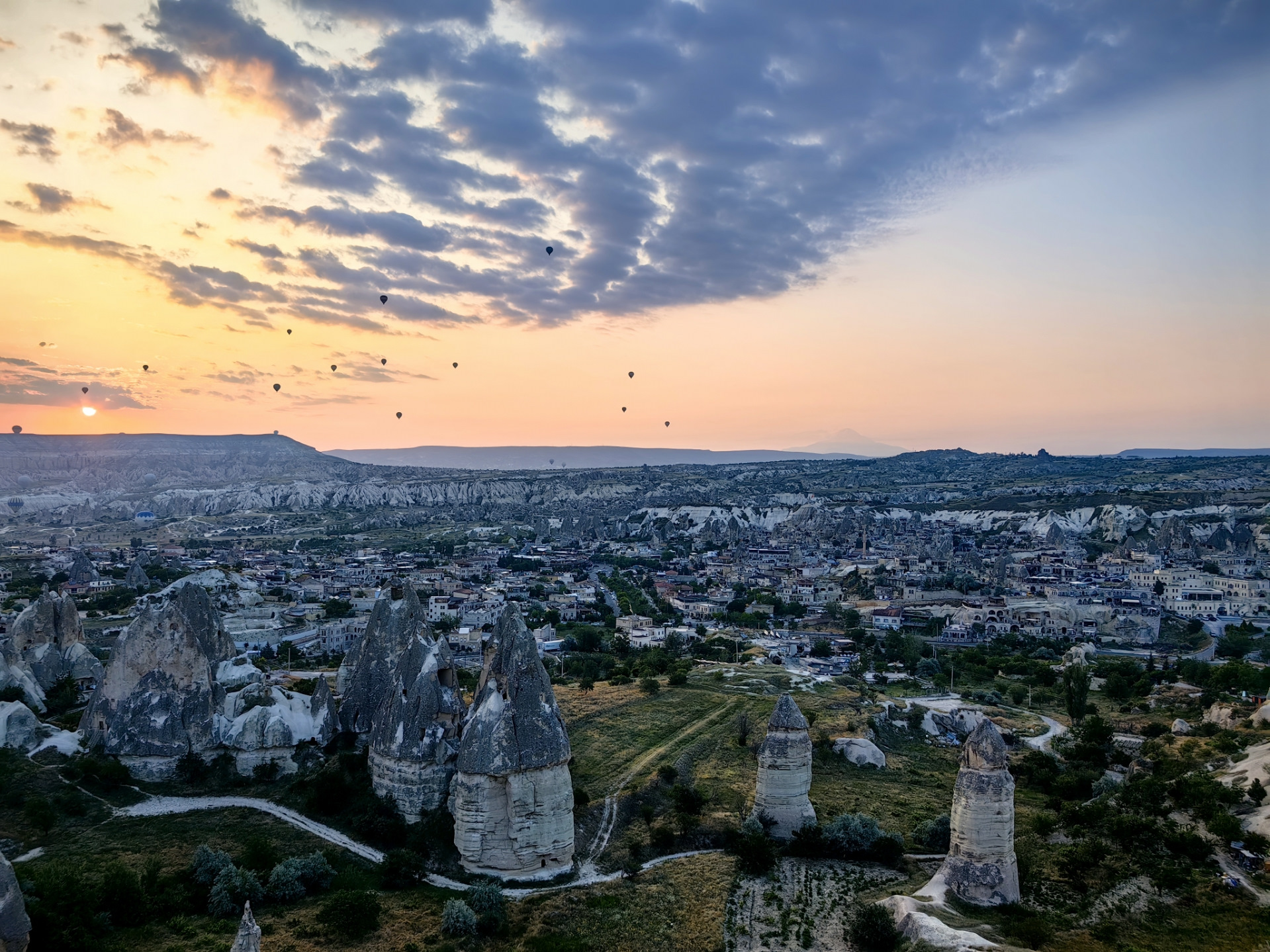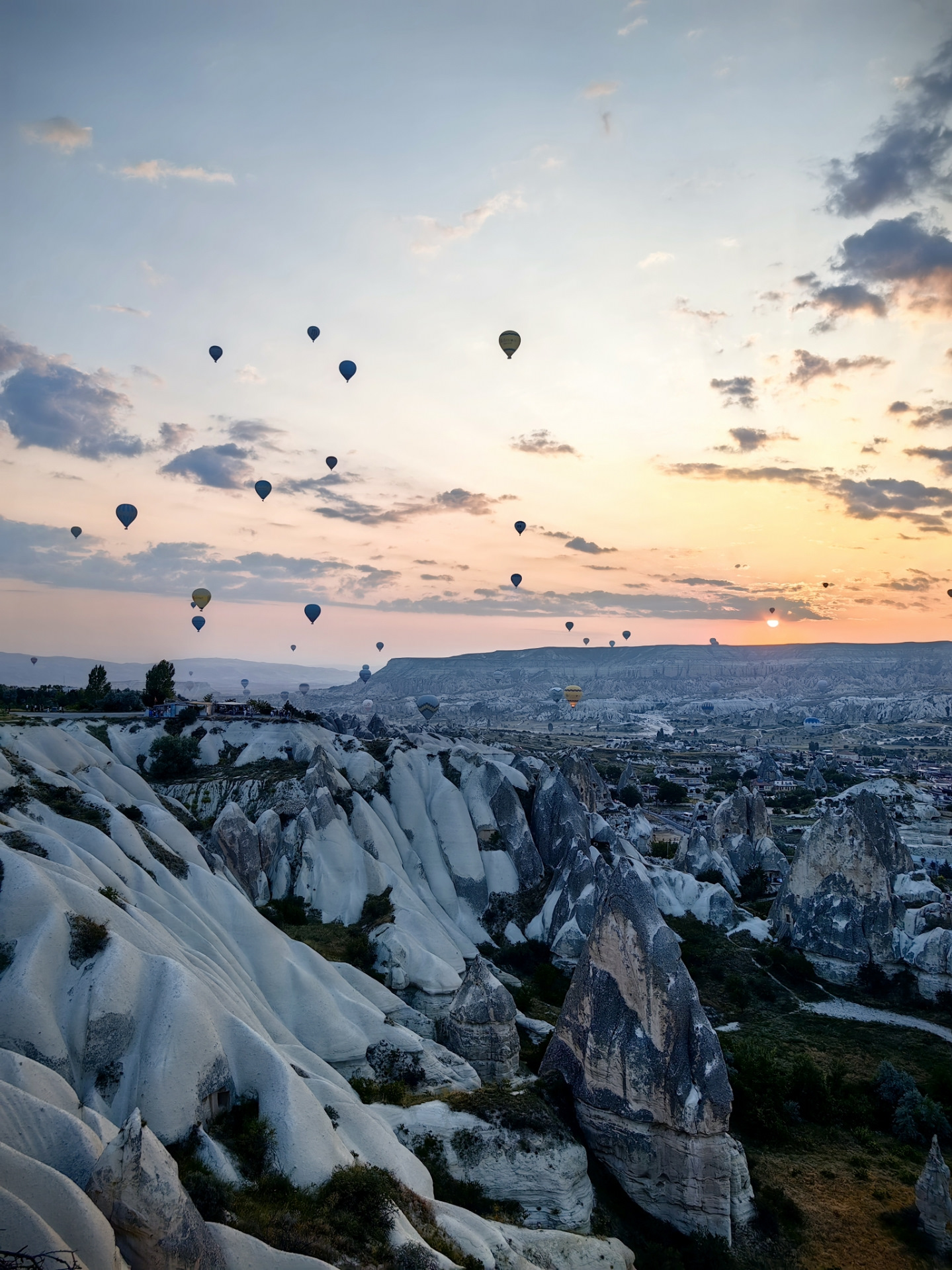 Ещё одно очень популярное развлечение в Каппадокии — это полёт на воздушном шаре на рассвете. Цены начинаются от 180$ с человека, в корзину с шаром сажают по 18-24 человека и на рассвете 5-30 шары начинают взлетать. От полёта решили отказаться, а вот сами полёты мы посмотрели на одной из многочисленных смотровых площадках. Очень красиво.