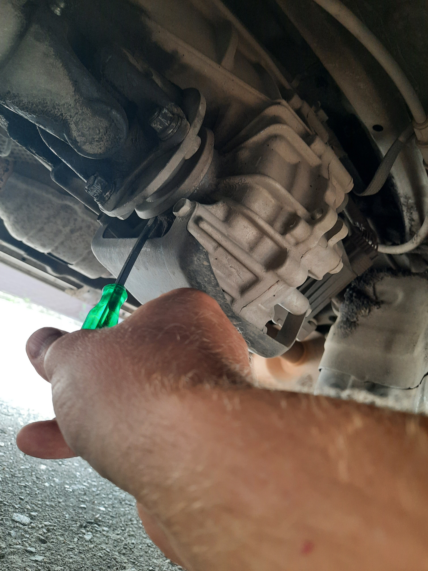 Добавил фотку. Только упираемся отвёрткой не в защиту раздатки, а в болт которым она прикрученна, и не стесняемся отгибать посильнее.