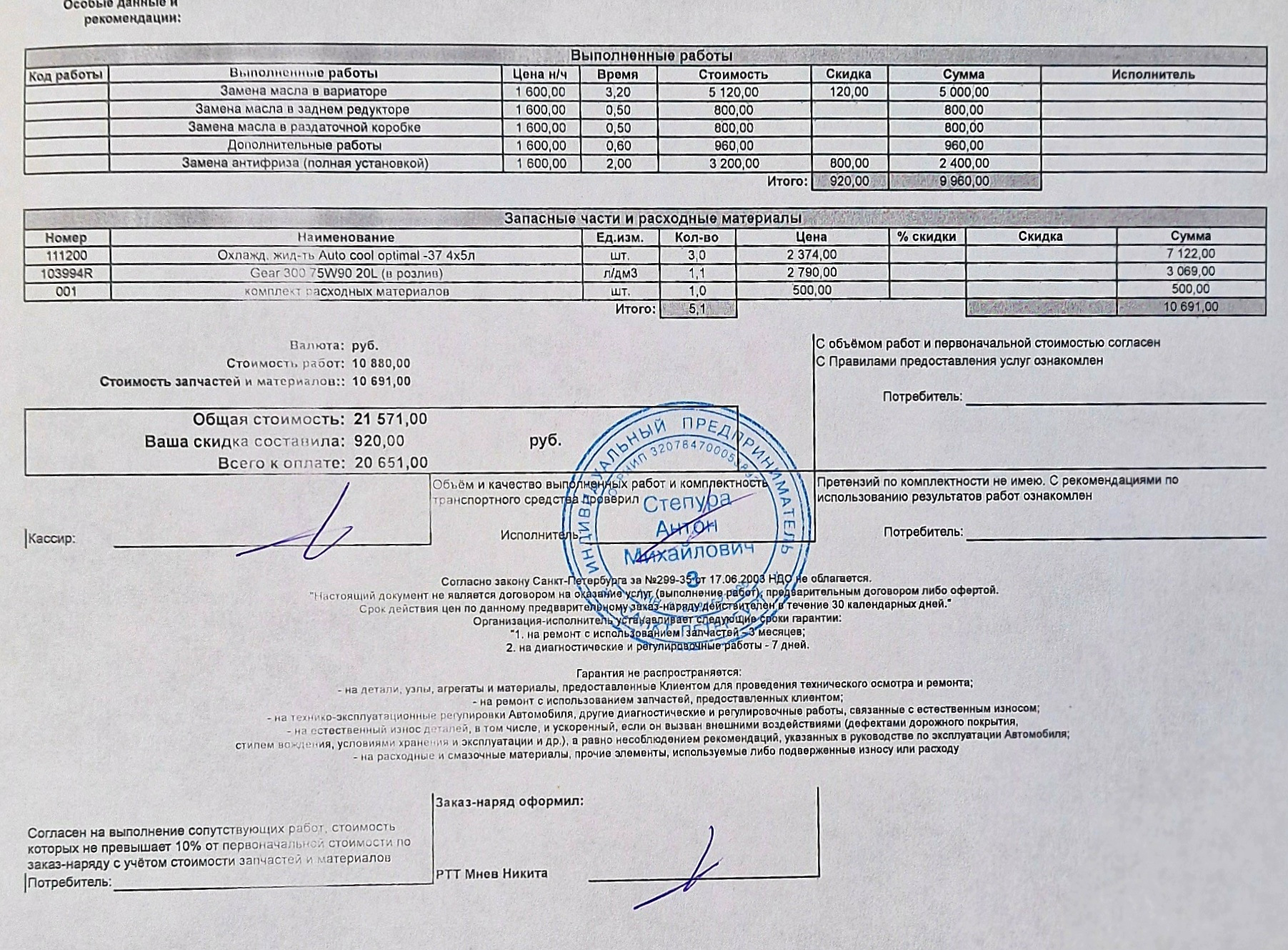 Итого все 3 пункта материалы + работа вариатор+задний редуктор и раздатка +антифриз Motul Garage =16864 + 20651 ₽ = 37515₽