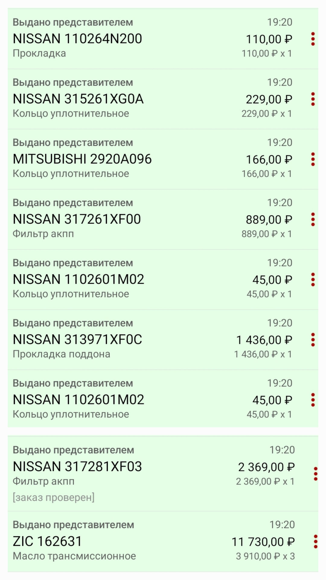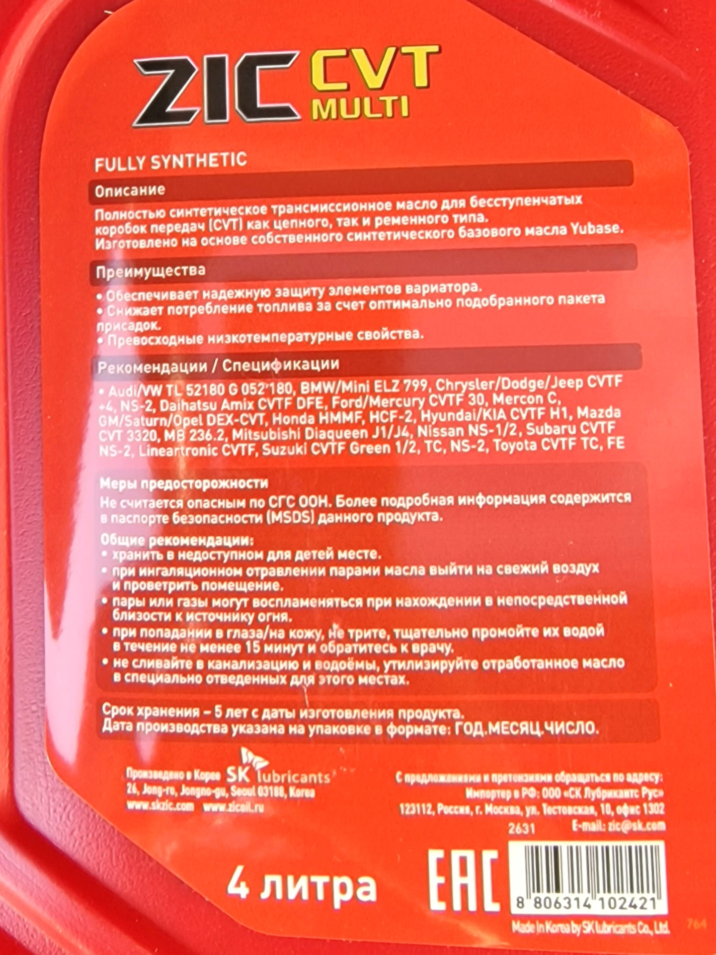 7. ZIC CVT Multi 162631 12л для замены и промывки вариатора (направление Дистрибьютор, чтоб по возможности не левак — были и дешевле, масло все проверки по таре прошло) 3 910,00 ₽ × 3 = 11730₽