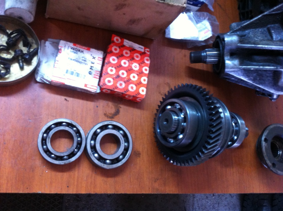 При эксплуатации автомобиля зимой на полном приводе, был слышен сильный гул раздатки. Вскрытие КПП показало, что 2 подшипника пришли в негодность. Один подшипник был заказан заранее, а другой быстро нашел после разбора КПП. Также заменены сальники фланцев карданов.