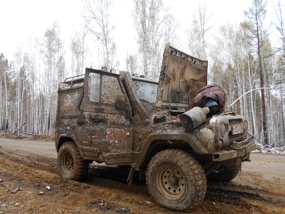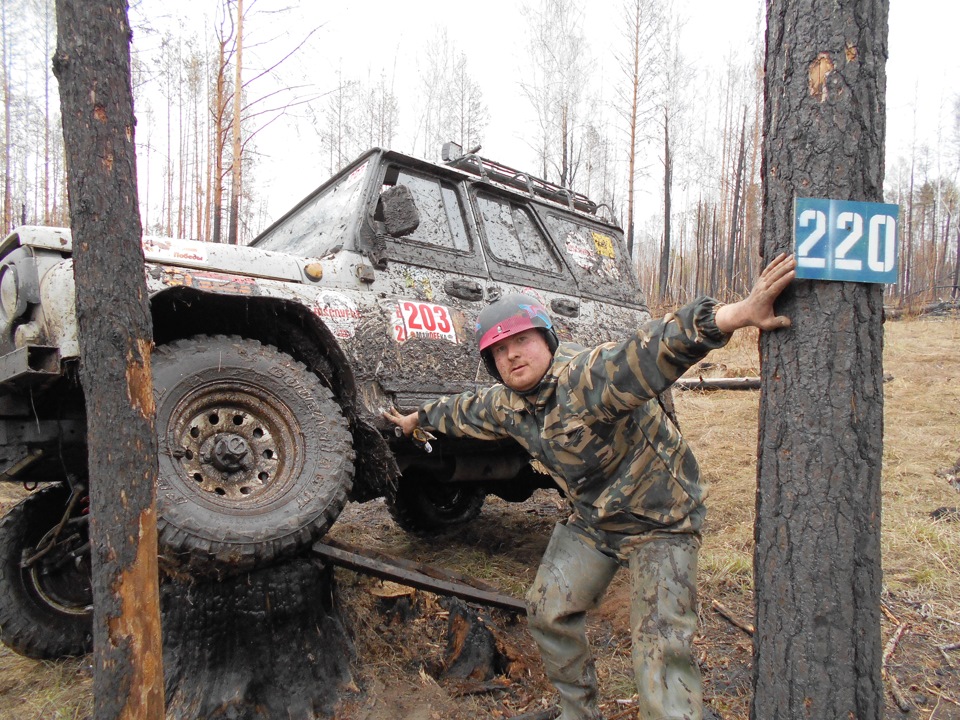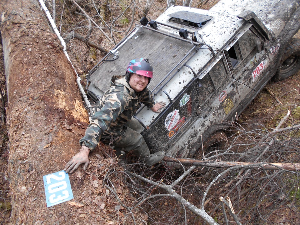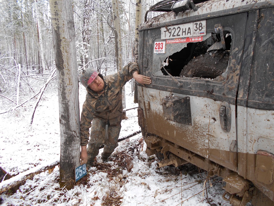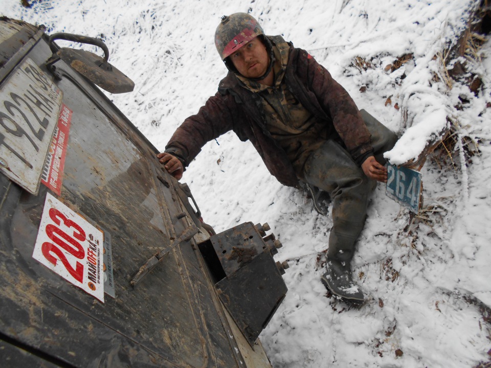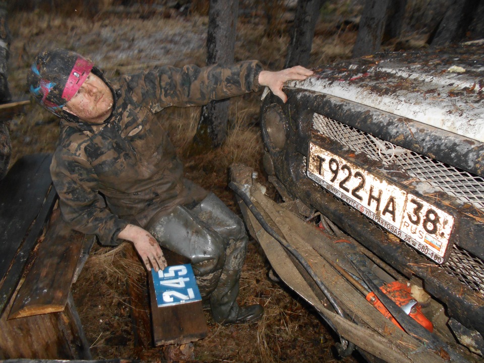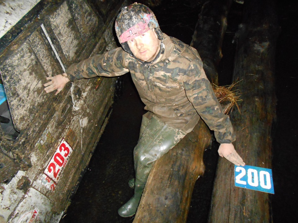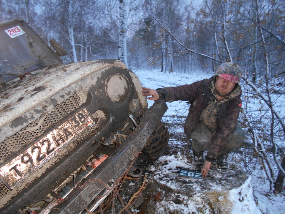 В ожидании старта.Ездить предстояло по вот таким болотам. Крайне не хватало блокировок, и более широкой резины, машина ехала только по сендтракам, либо на лебедке.Точка с обременением:Опять сендтрак помогБлиже к вечеру пошел снегШтурман приуныл…Вода по порог, салон остался сухимк утру все завалило снегомНа этой точке был очень большой крен, заднее колесо повисло в воздухе примерно на пол метра.потом случилась неприятность… осина сзади дорогу перебежала.Пропала зарядка. Заклинил подшипник на натяжном ролике генератора, сам ролик сплавился и ремень слетел. Без зарядки еще немного поездили бы(два аккамулятора общей емкостью 175 а/ч помогли бы, но на этом же ремне находится помпа… мы остались без охлаждения. Начали ремонт, все ключи лежат в ящике в багажнике под запаской, а дверь задняя погнута и не открывается… Через салон все-таки добрались до инструмента. Запасной ролик есть в запасе. Не без проблем сняли старый ролик, поставили новый… а ремень не натягивается, оказалось что ролики были с разным диаметром. Переделав на месте крепление генератора, и натяжной механизм ролика-натяжителя, удалось таки натянуть ремень. Одевать второй ремень (абсолютно не были уверены в надежности сделанной нами залипухе) не стали полетели прямиком до финиша без ГУРа.В такой позе провел около 2 часов. Финишировали через 20 часов 43 минуты (на 5 часов раньше закрытия финиша) заняли 8 место.Вот такими въехали в город.