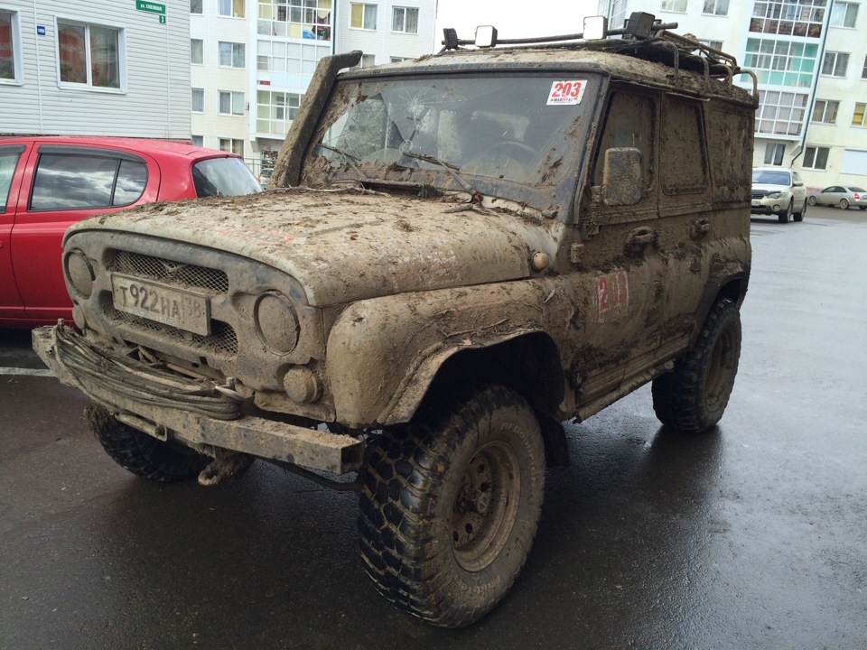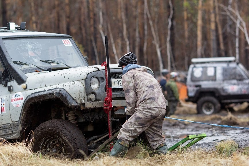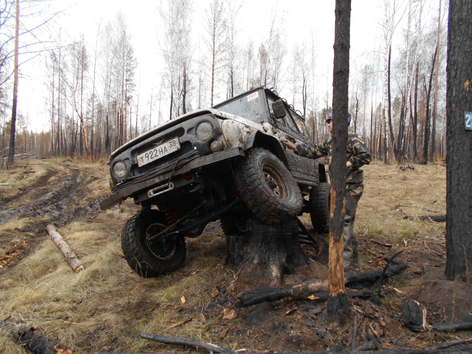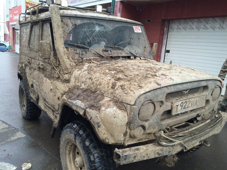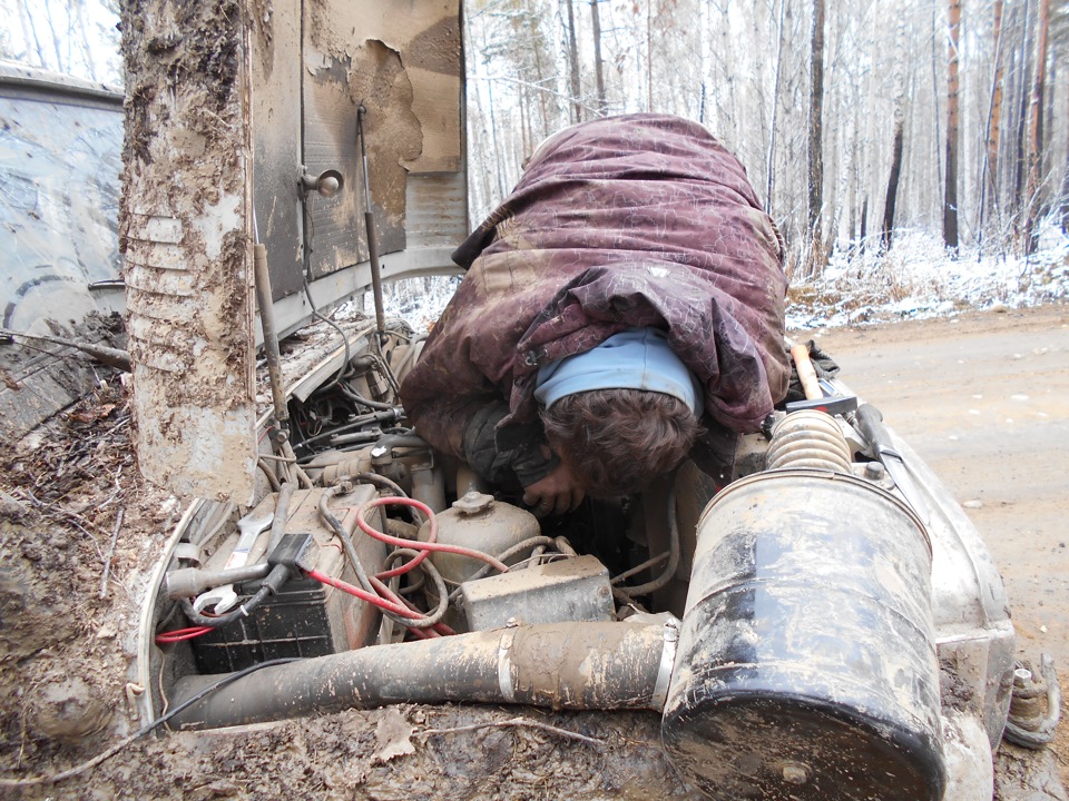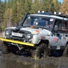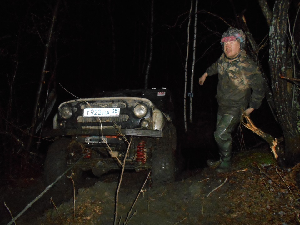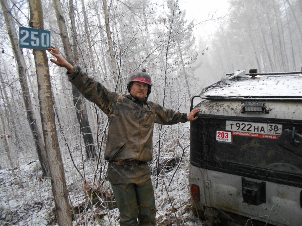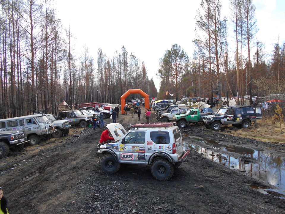 В ожидании старта.Ездить предстояло по вот таким болотам. Крайне не хватало блокировок, и более широкой резины, машина ехала только по сендтракам, либо на лебедке.Точка с обременением:Опять сендтрак помогБлиже к вечеру пошел снегШтурман приуныл…Вода по порог, салон остался сухимк утру все завалило снегомНа этой точке был очень большой крен, заднее колесо повисло в воздухе примерно на пол метра.потом случилась неприятность… осина сзади дорогу перебежала.Пропала зарядка. Заклинил подшипник на натяжном ролике генератора, сам ролик сплавился и ремень слетел. Без зарядки еще немного поездили бы(два аккамулятора общей емкостью 175 а/ч помогли бы, но на этом же ремне находится помпа… мы остались без охлаждения. Начали ремонт, все ключи лежат в ящике в багажнике под запаской, а дверь задняя погнута и не открывается… Через салон все-таки добрались до инструмента. Запасной ролик есть в запасе. Не без проблем сняли старый ролик, поставили новый… а ремень не натягивается, оказалось что ролики были с разным диаметром. Переделав на месте крепление генератора, и натяжной механизм ролика-натяжителя, удалось таки натянуть ремень. Одевать второй ремень (абсолютно не были уверены в надежности сделанной нами залипухе) не стали полетели прямиком до финиша без ГУРа.В такой позе провел около 2 часов. Финишировали через 20 часов 43 минуты (на 5 часов раньше закрытия финиша) заняли 8 место.Вот такими въехали в город.