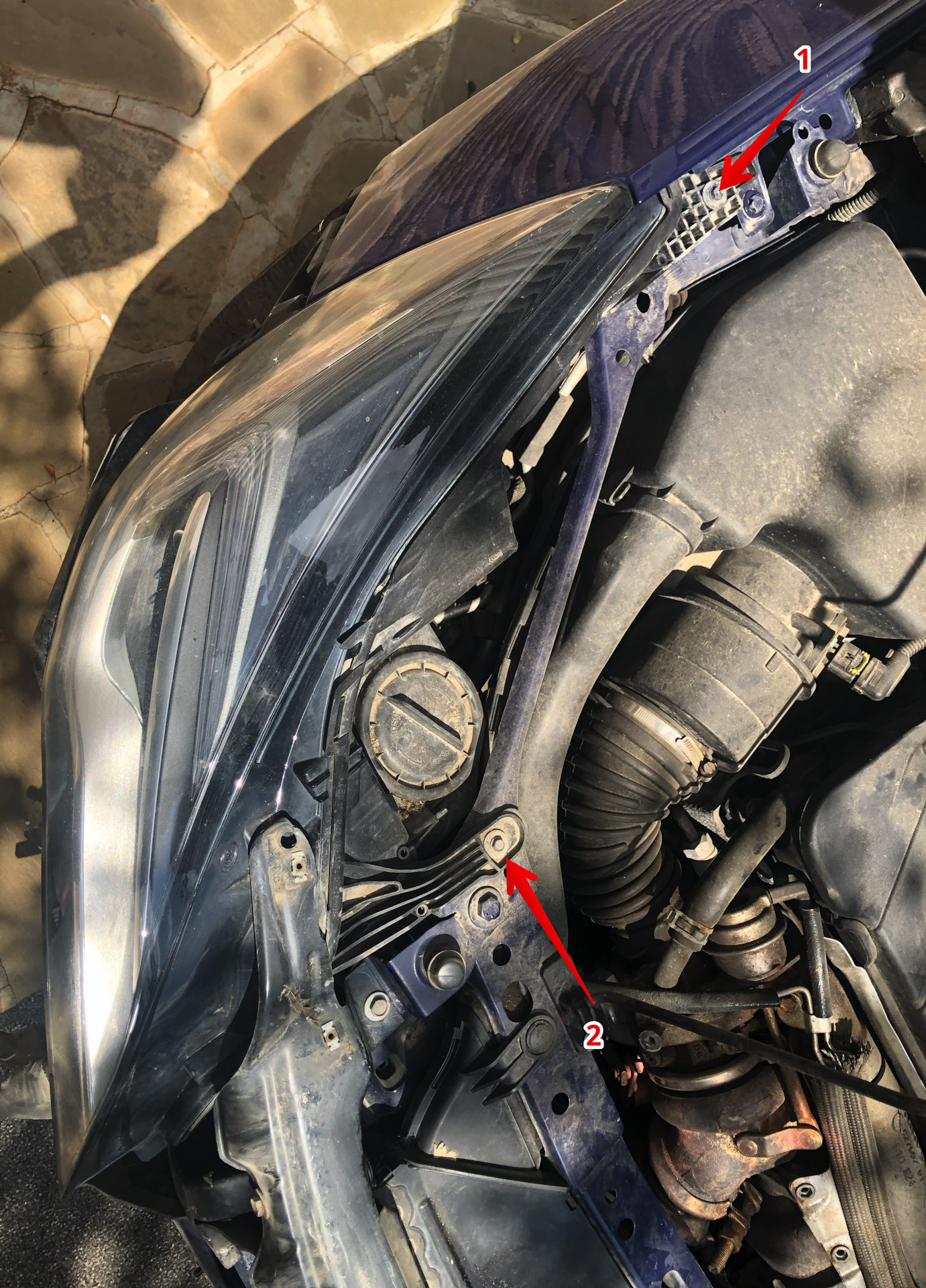 Сами фары закреплены на 4 болтах: 2 сверху, 1 возле подкрылка и 1 снизу посередине фары. Вытаскиваем фары отключив их разъемы. Также придется разомкнуть пластиковый усилитель, на котором лежит фара. Иначе направляющие не дадут вытащить ее.