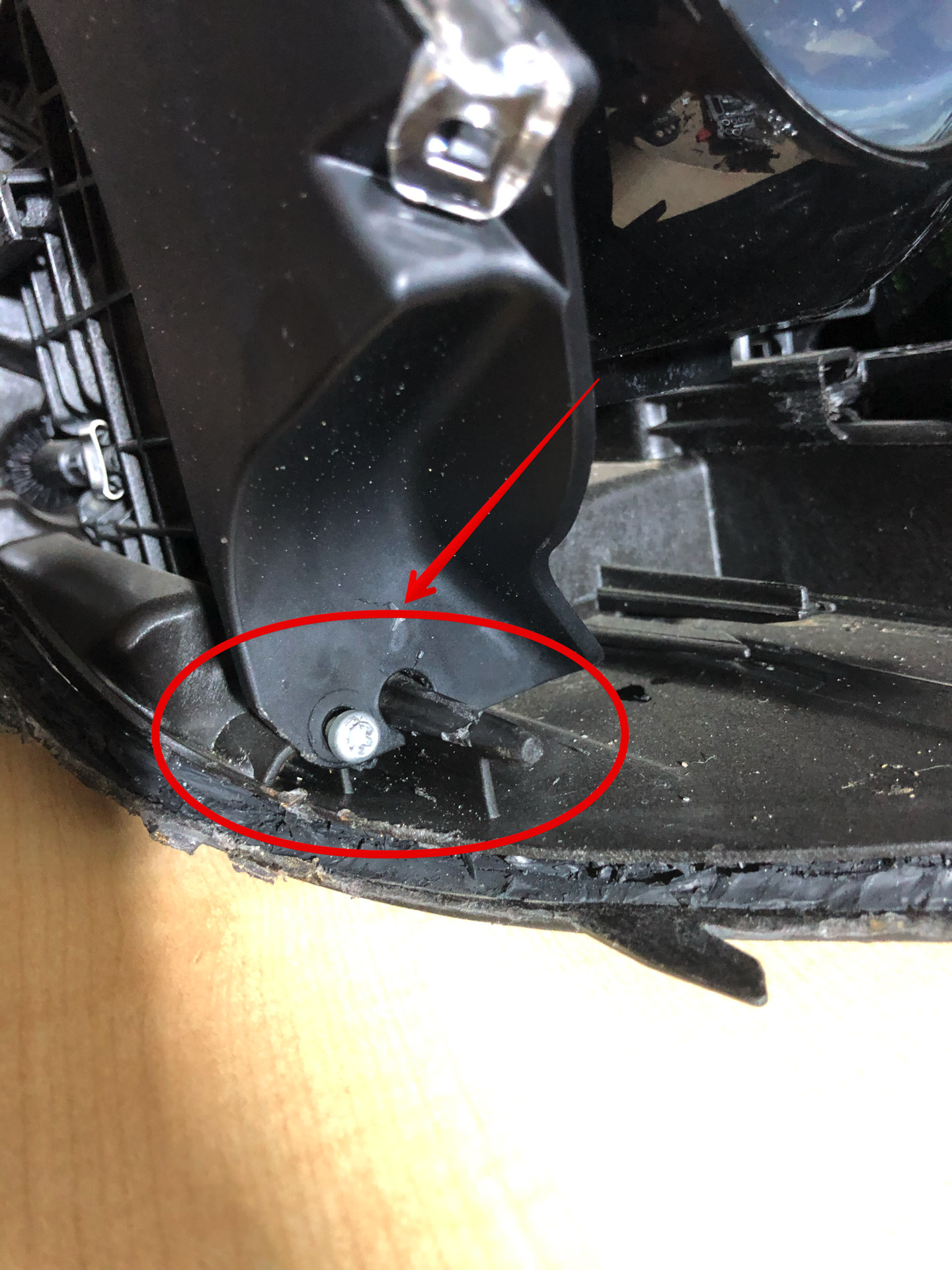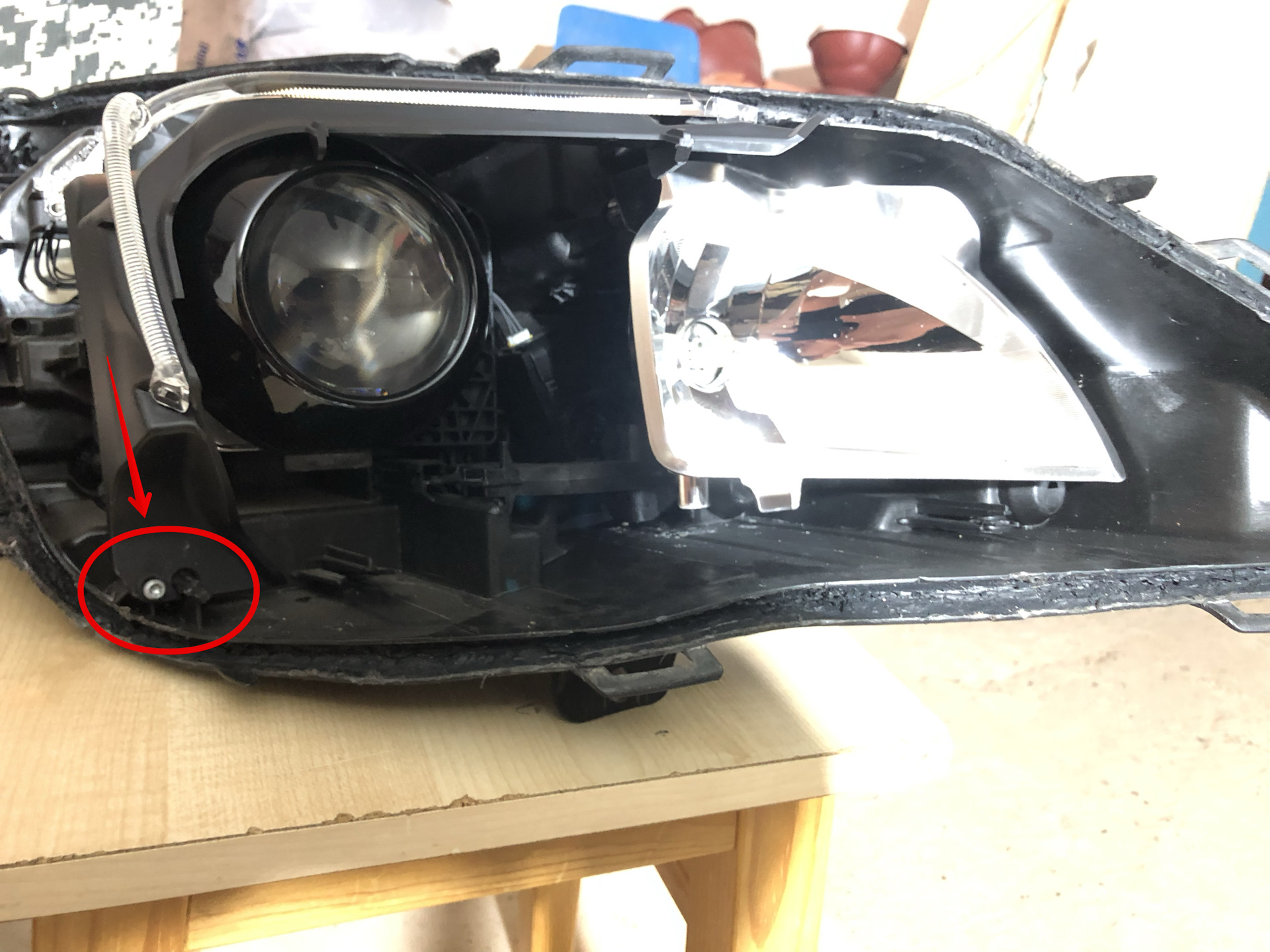 Весь процесс описывать не буду, но вкратце, сидим проливаем жидкостью герметик и долго долго пытаемся отделить половинки фары с помощью отвертки. Герметик очень хороший и не поддается от слова совсем. Есть один нюанс, маска фары не отделяется от стекла и имеет крепление на болт к корпусу фары. Такого знать было нельзя и на первой фаре это ушко было сломано. На второй уже было сделано техническое отверстие для выкручивания злосчастного болтика. Собственно сам болт на фото ниже.