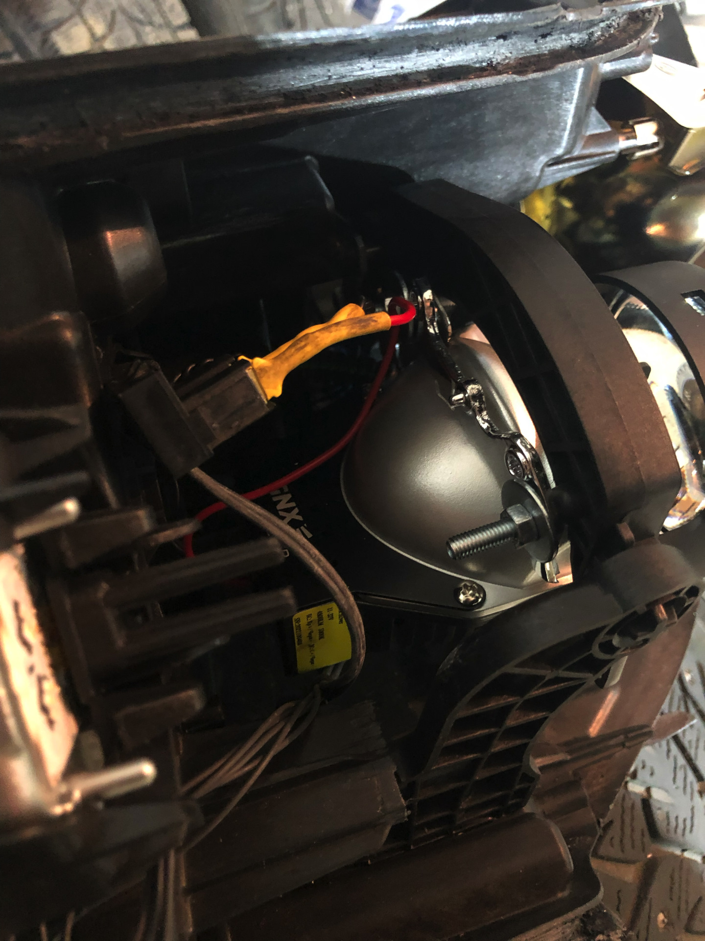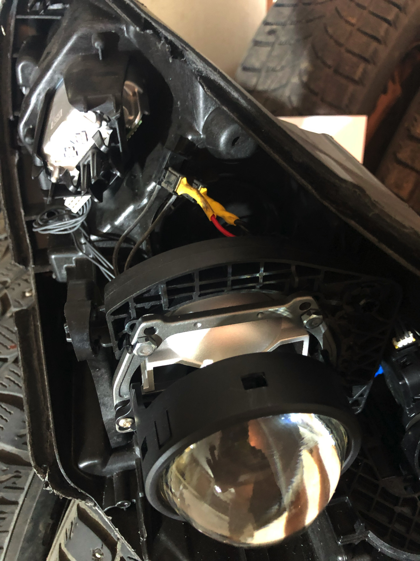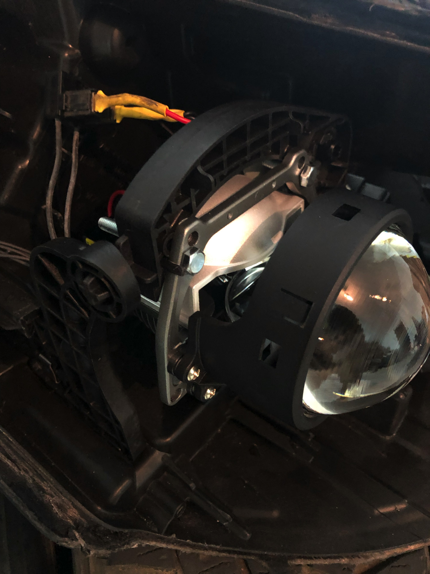 Третий этап — установка новой линзы. После вскрытия все достаточно просто. Снимаем все элементы фары, устанавливаем новую линзу через переходную рамку (спасибо хендай i40, который выступил донором рамок для новых линз). Крепление полностью кастомное, спасибо glyk98! Затем черед проводки, берем питание со штатных разъемов. Немного фото установленной линзы ниже.