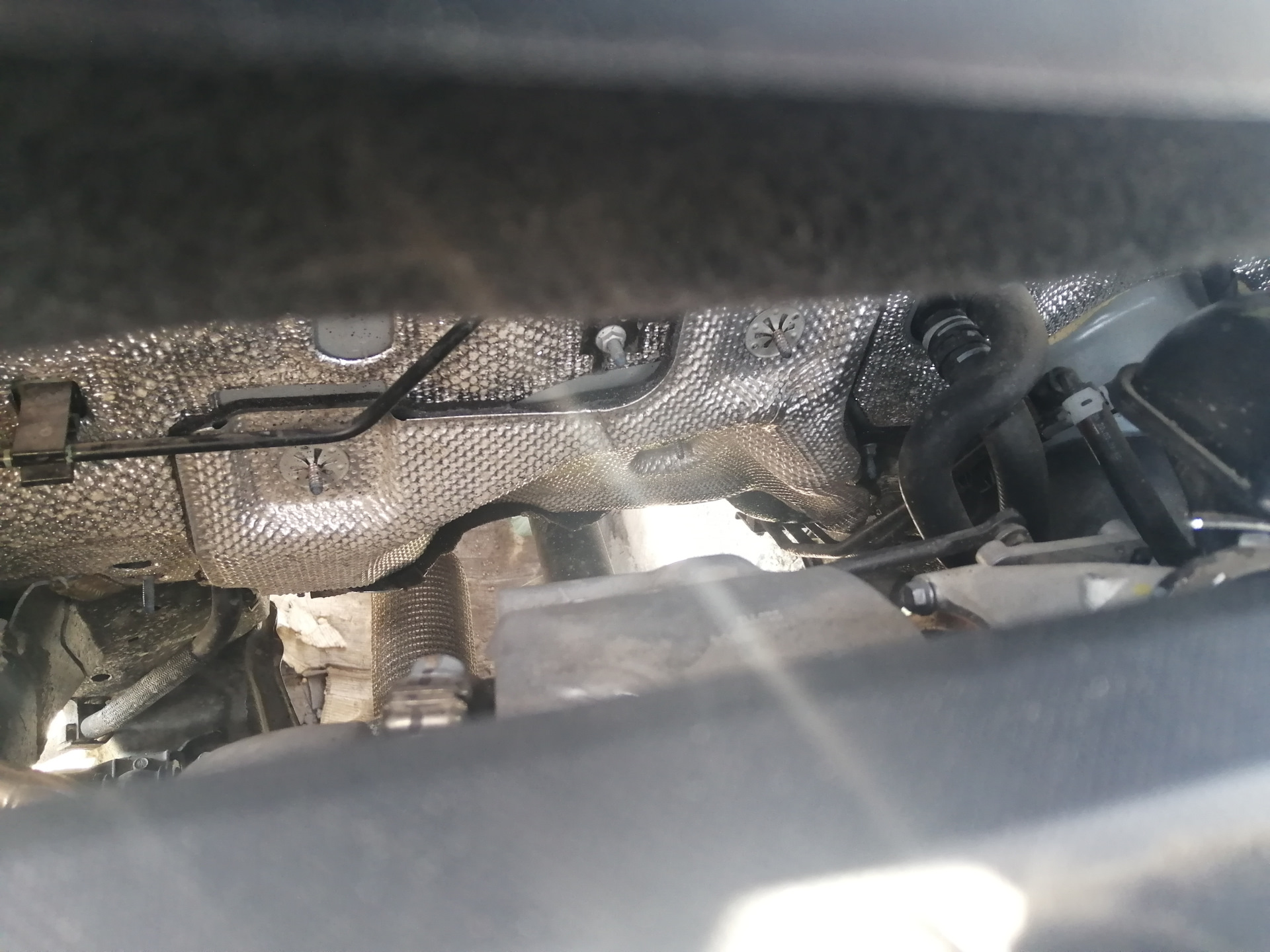 Решил, что сверчок спрятался внизу под панелью. Пришлось снять нижнюю часть панели под рулем, а потом и комбинацию приборов вытащить. Все зря. Честно говоря уже руки опускаться начали, но потом обратил внимание, что утром на холодной машине никакого скрипа нет и появляется только вечером на горячую. Полез смотреть, что там у нас около мотора и глушителя. Нашел жесткие тепловые экраны. У верхнего, который в моторный отсек заходит, болтался верхний крепеж. Подтянул и радостный поехал проверять… облоооом! Заехал на эстакаду, все потрогал — ничего не дребезжит/скрипит, блин. Уже от безысходности решил все равно снять нижний экран и прокатиться без него — скрип полностью не исчез, но очень сильно уменьшился. оппа… Тогда снял и верхний, обклеил оба изнутри противоскрипным битопластом и собрал назад. Тест…аллилуйя! Прям не поверил сначала. Два дня поездил — тишина! Видимо где-то эти экраны от нагрева или об кузов терлись или между собой. Так что если у вас есть звук как на моем видео, то есть смысл проверить экранчики)