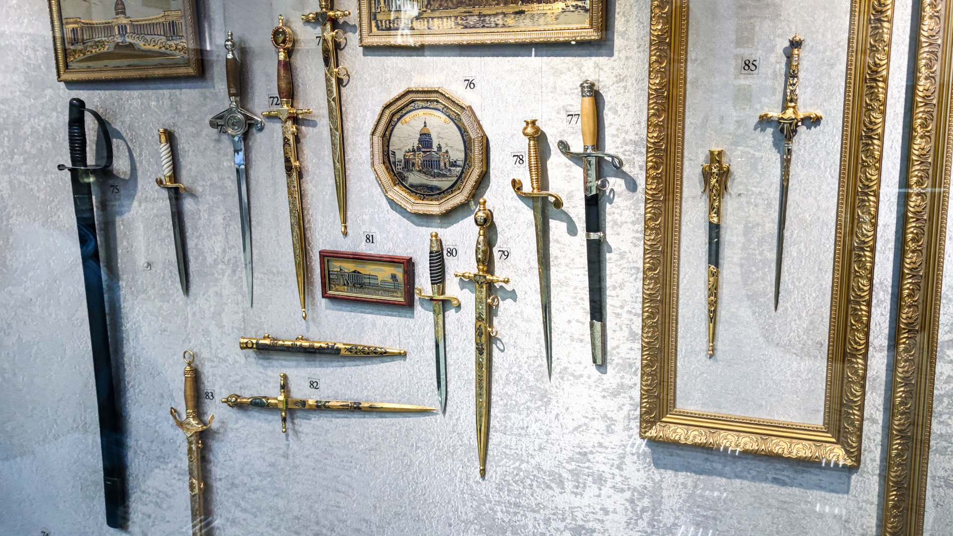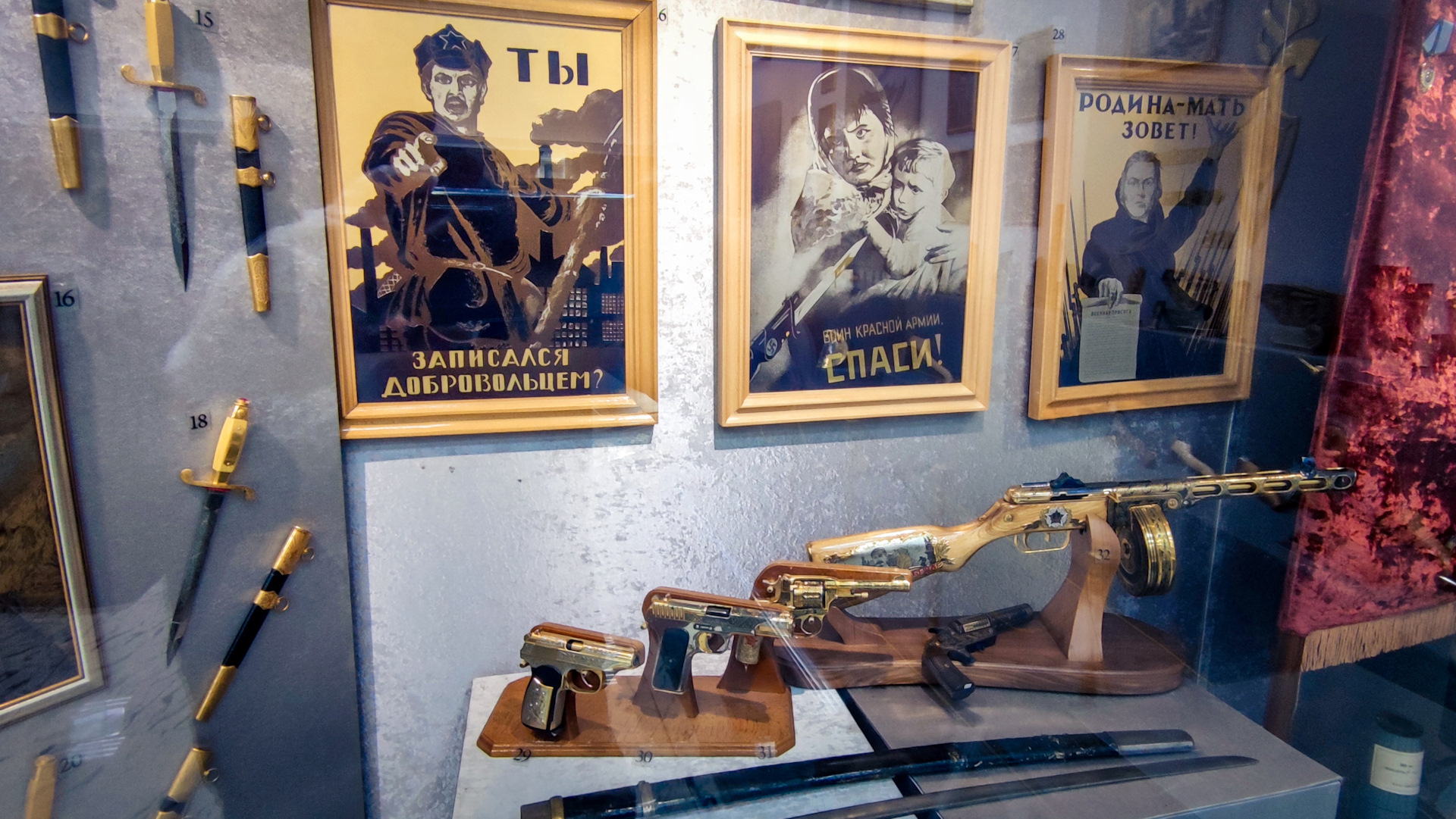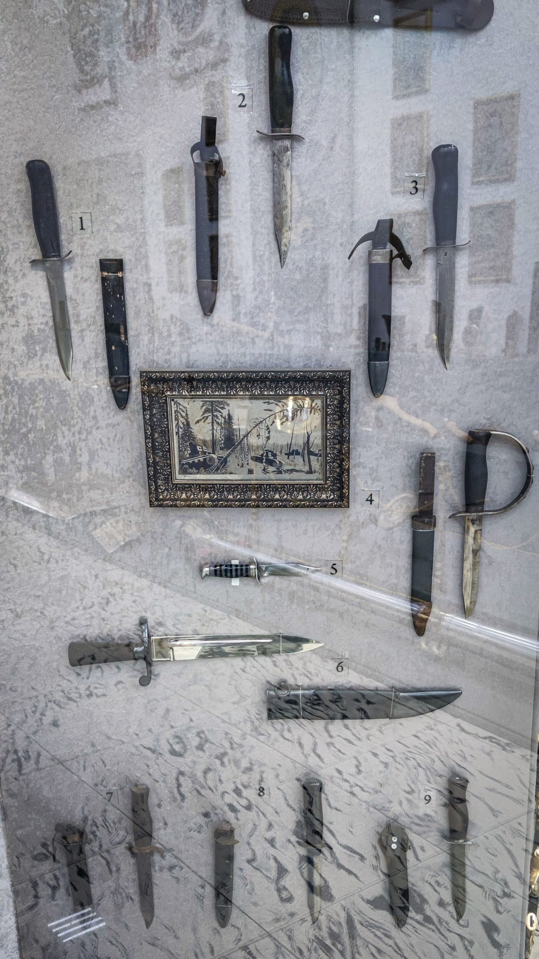 На одном из стендов представлена целая коллекция знаменитых черных ножей. Во время ВОВ на Урале был сформирован добровольческий танковый корпус. Бойцы этого корпуса были снабжены ножами финского образца из Златоустовской стали. Рукоять и ножны таких ножей имели чёрный цвет. Арматура ножен воронились, чтобы не было блеска на солнце. Именно поэтому в отчётах противника советский добровольческий танковый корпус называли «Дивизией чёрных ножей». Уральская «Дивизия чёрных ножей» наводила такой страх на фашистов, что вошла в историю, именно под таким названием.
