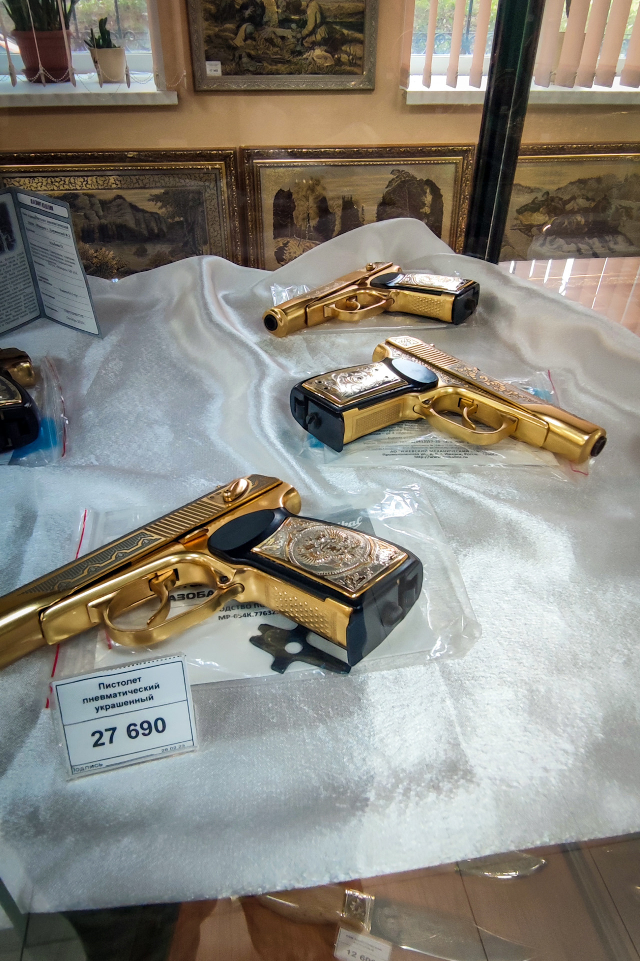 Интересно, кто-то вообще покупает эти золотые автоматы пулеметы? Я ради интереса спросил у кассирши — она сказала, что за 3 года ни одного автомата не было продано.