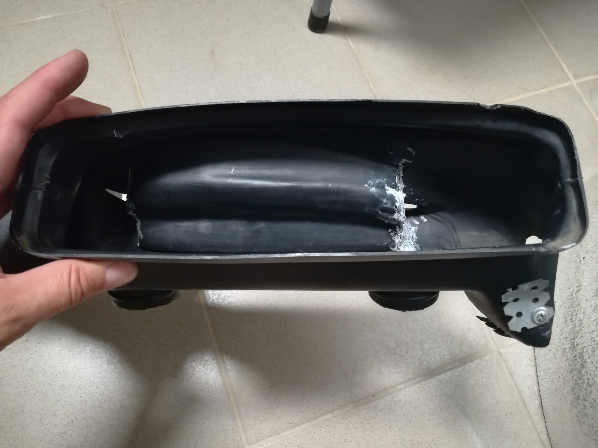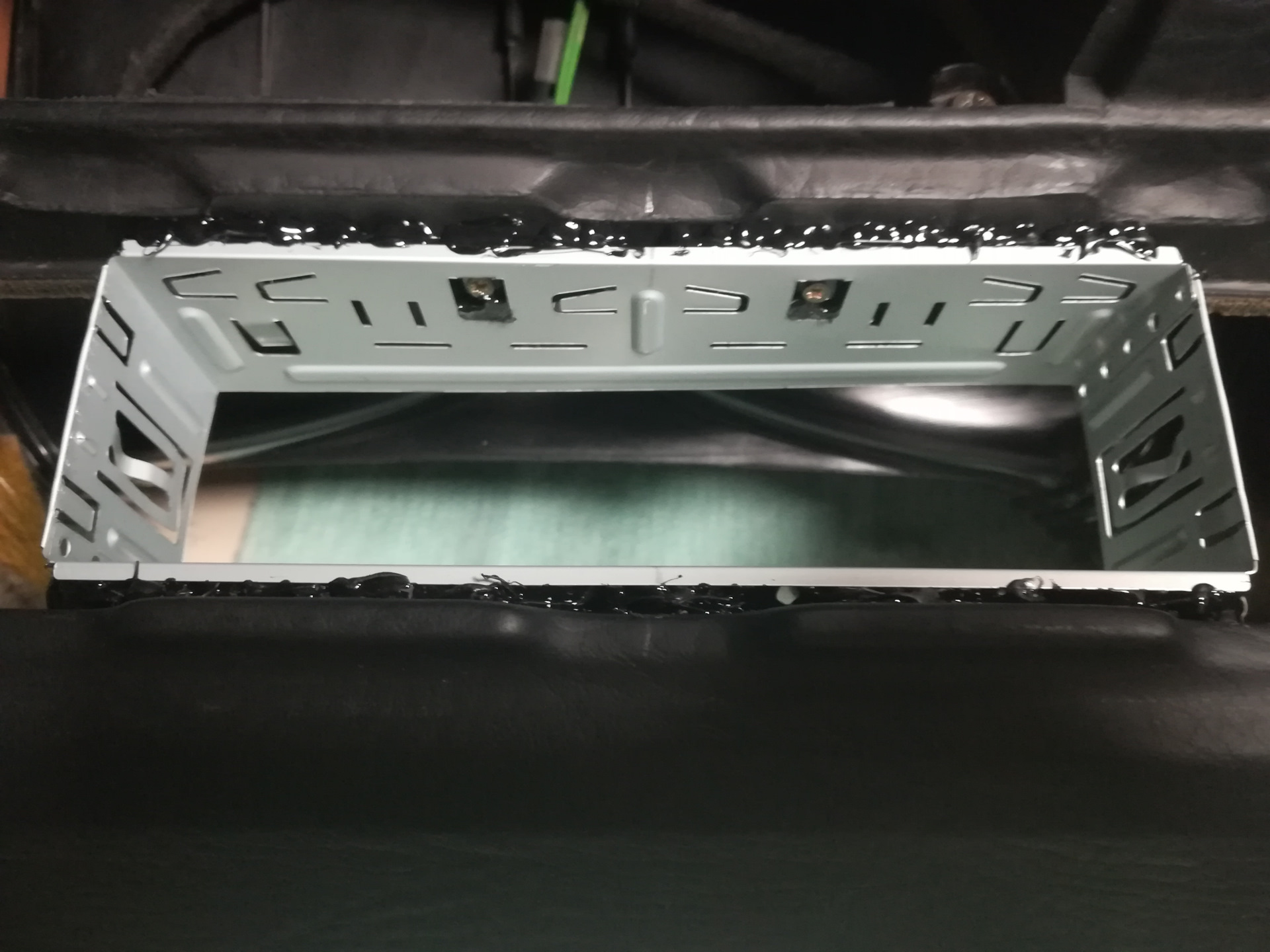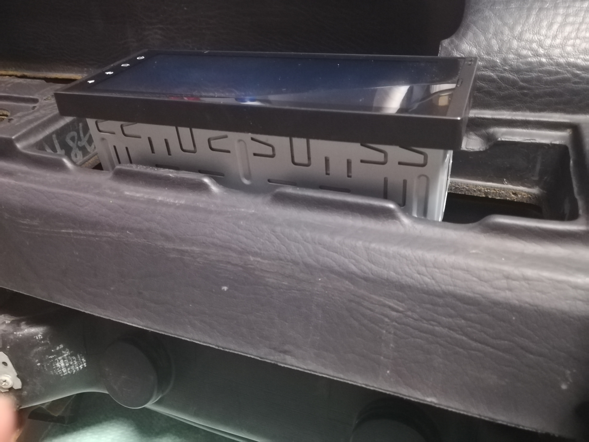 Далее принялся за накладку. Пришлось подпилить центральную часть где раньше крепились воздуховоды, получается так что накладка теперь стоит плотно к магнитоле, и не дает ей выскочить, для того чтоб не царапалась панель магнитолы на накладку наклеил мягкий материал. Видимая часть экрана не перекрывается.