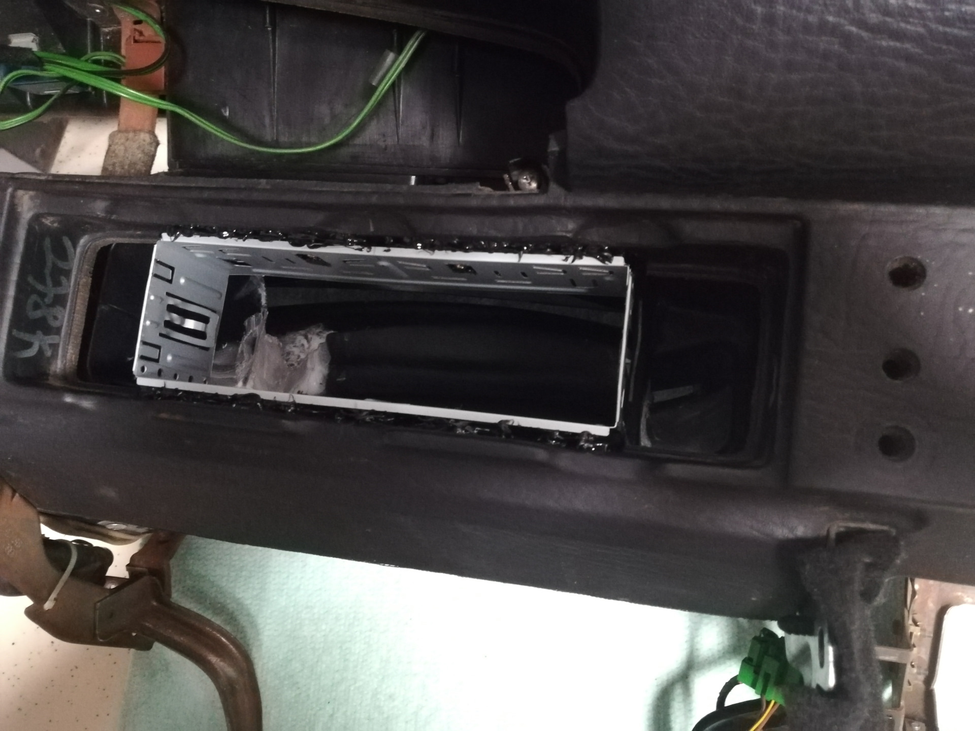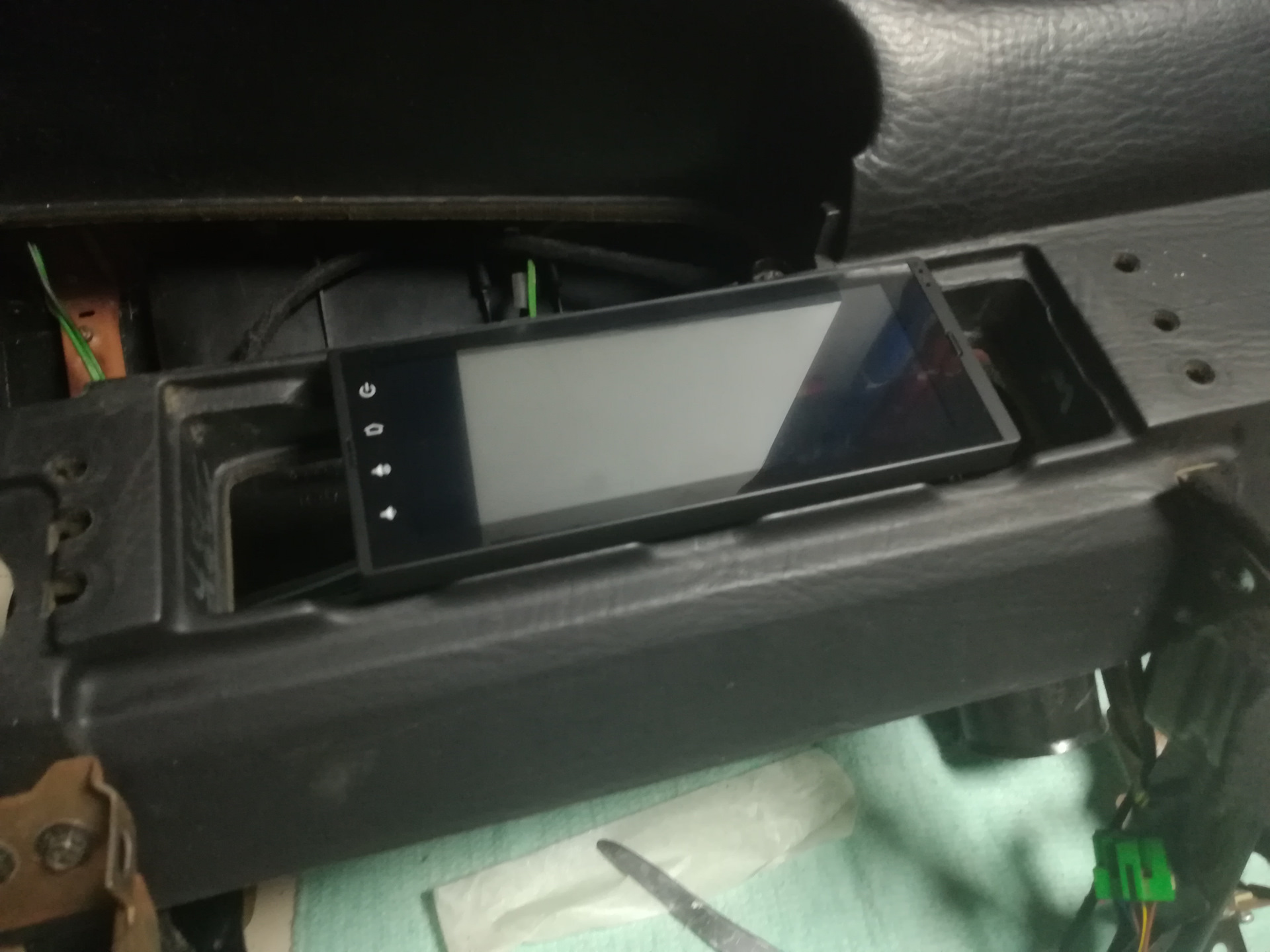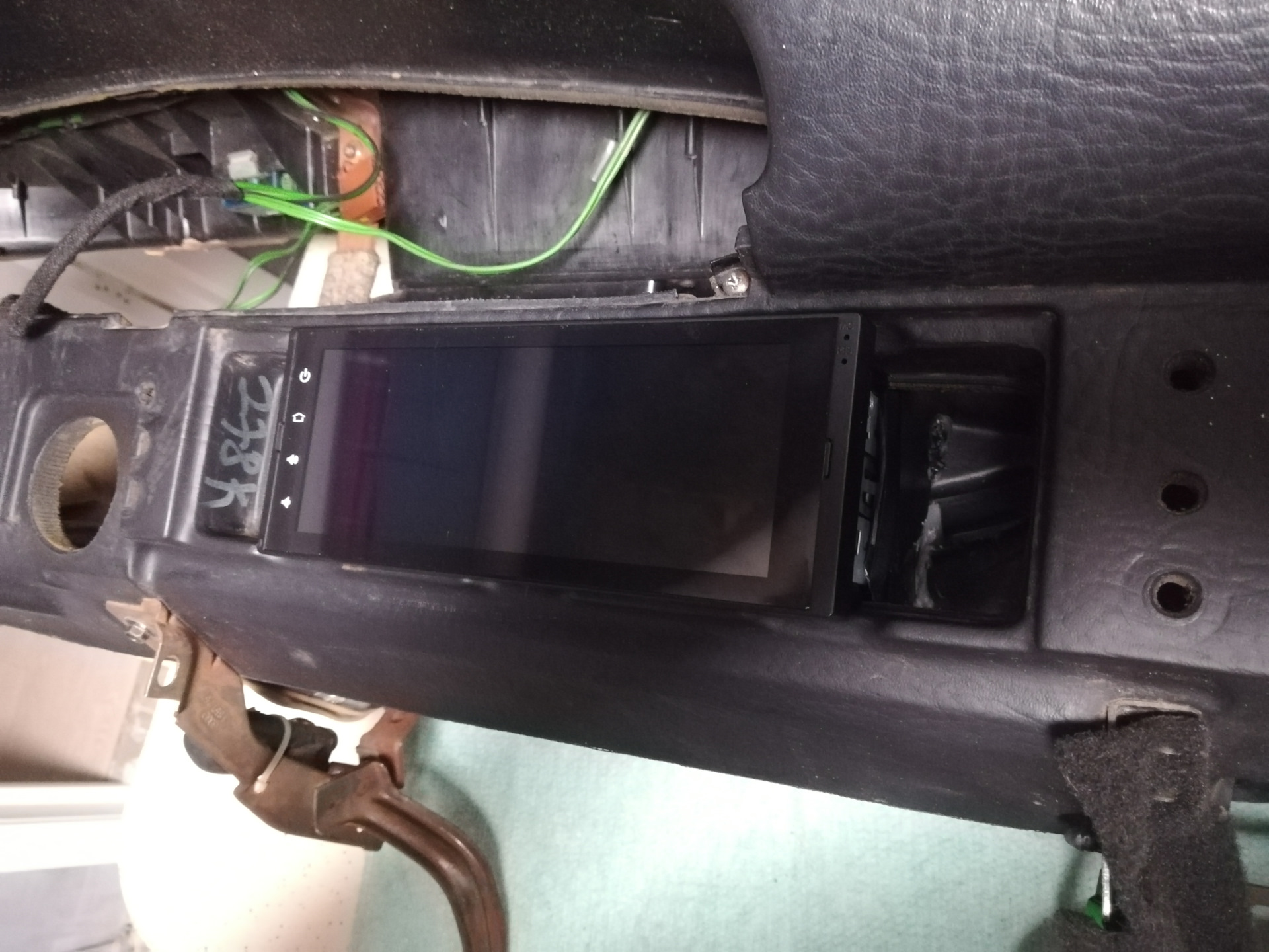 Далее принялся за накладку. Пришлось подпилить центральную часть где раньше крепились воздуховоды, получается так что накладка теперь стоит плотно к магнитоле, и не дает ей выскочить, для того чтоб не царапалась панель магнитолы на накладку наклеил мягкий материал. Видимая часть экрана не перекрывается.