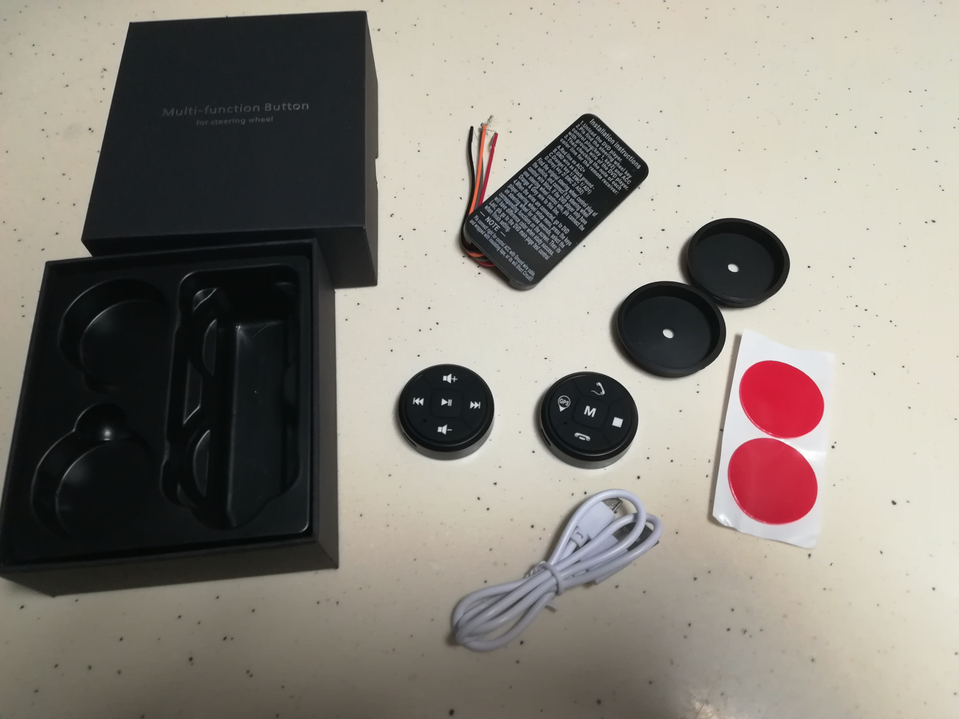 Кнопки клеятся в любое удобное место. Заряжаются по USB, зарядки хватает — не знаю, пока неделю катаюсь, держат. Каждую кнопку независимо от изображенного символа можно привязать к любой из доступных команд, из там довольно много.