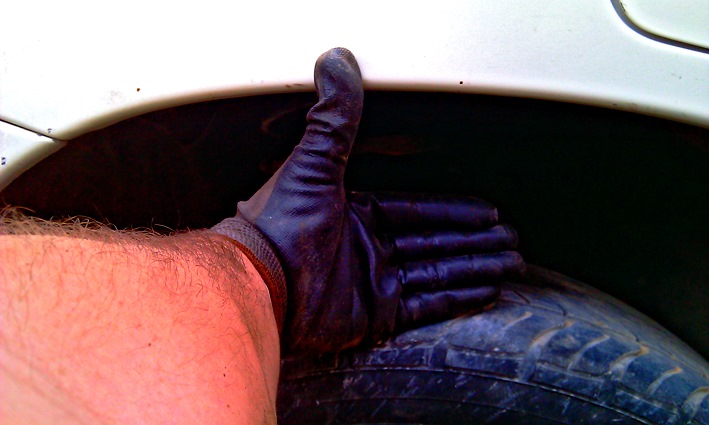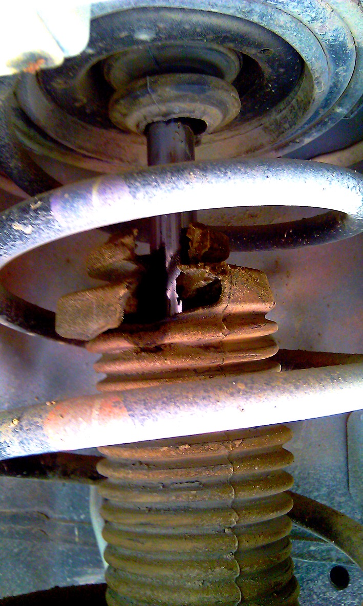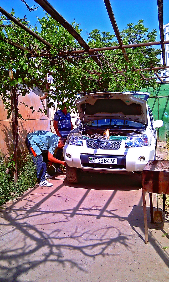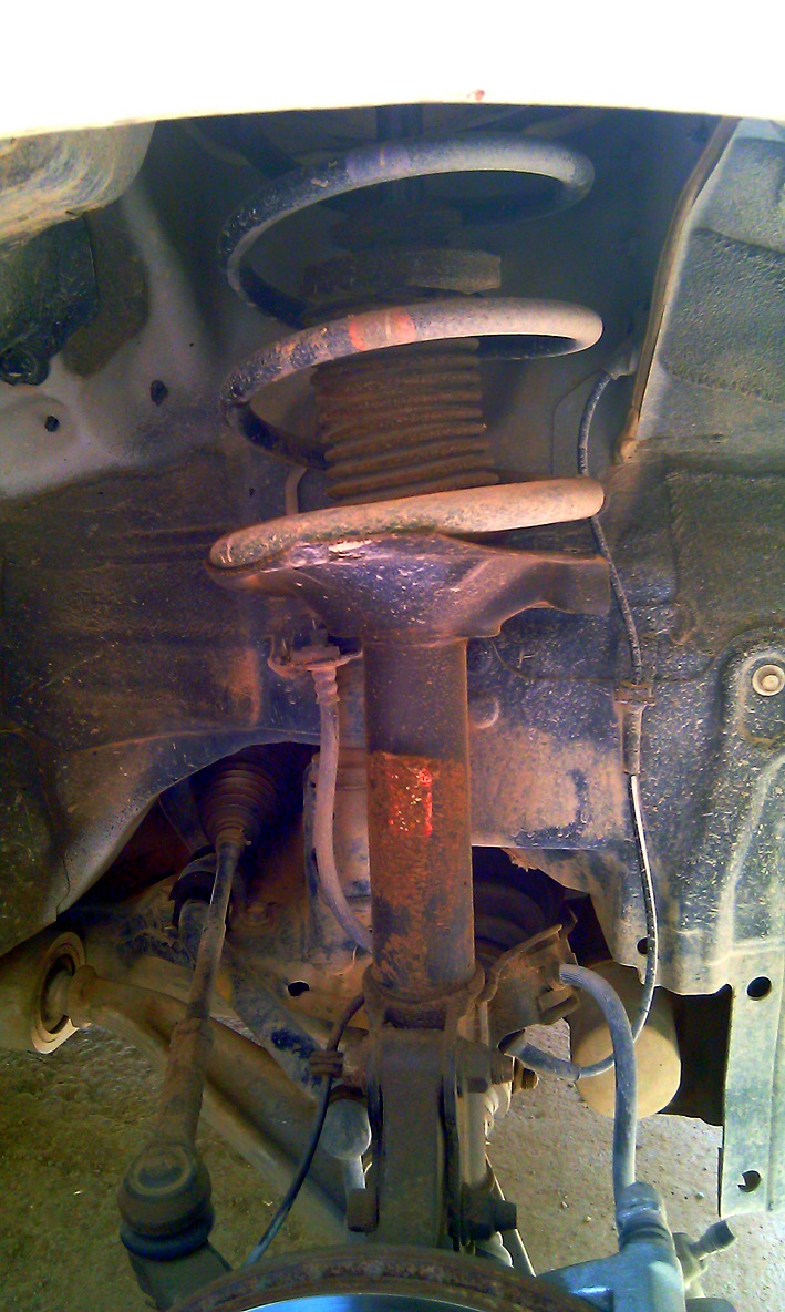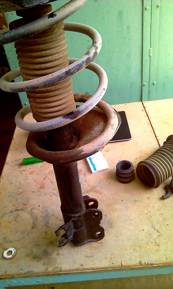 Упоры под колёса, ослабляем колёсные гайки, домкратим.В подкапотке, откручиваем 3 гайки удерживающие стойку сверху, Володя откручивает самую весёлую дальнюю гайку )))Головки 17 и 19 откручиваем стойку от ступичного кулака, аккуратно снимаем провод датчика АБС и расшплинтовываем тормозной шланг.По ходу выясняем источник страшнейших лязгающих звуков из-под машины, любимый линк стабилизатора откручен! Резьбу похавало, шайба здесь, шайба там, затянул. Поживём посмотрим как себя чувствует…Дальше как обычно, тиски, головка на 17, ослабляем гайку штока, сжимаем пружину, меняем пыльник и стойку. Собираем.После сборки-установки, наводим красоту!+35… Я уже больше не мог, и пошёл пить кофе ))) Ребята за работой… Спасибо Сашка и Володька!К вопросу о пыльниках, вот раздолбаный оригинал…Оригинал в хлам…Закончили!Похоже на жып!Вот такой теперь просвет, машина поднялась! Стуки бряки скрипы и раскачка кончились!