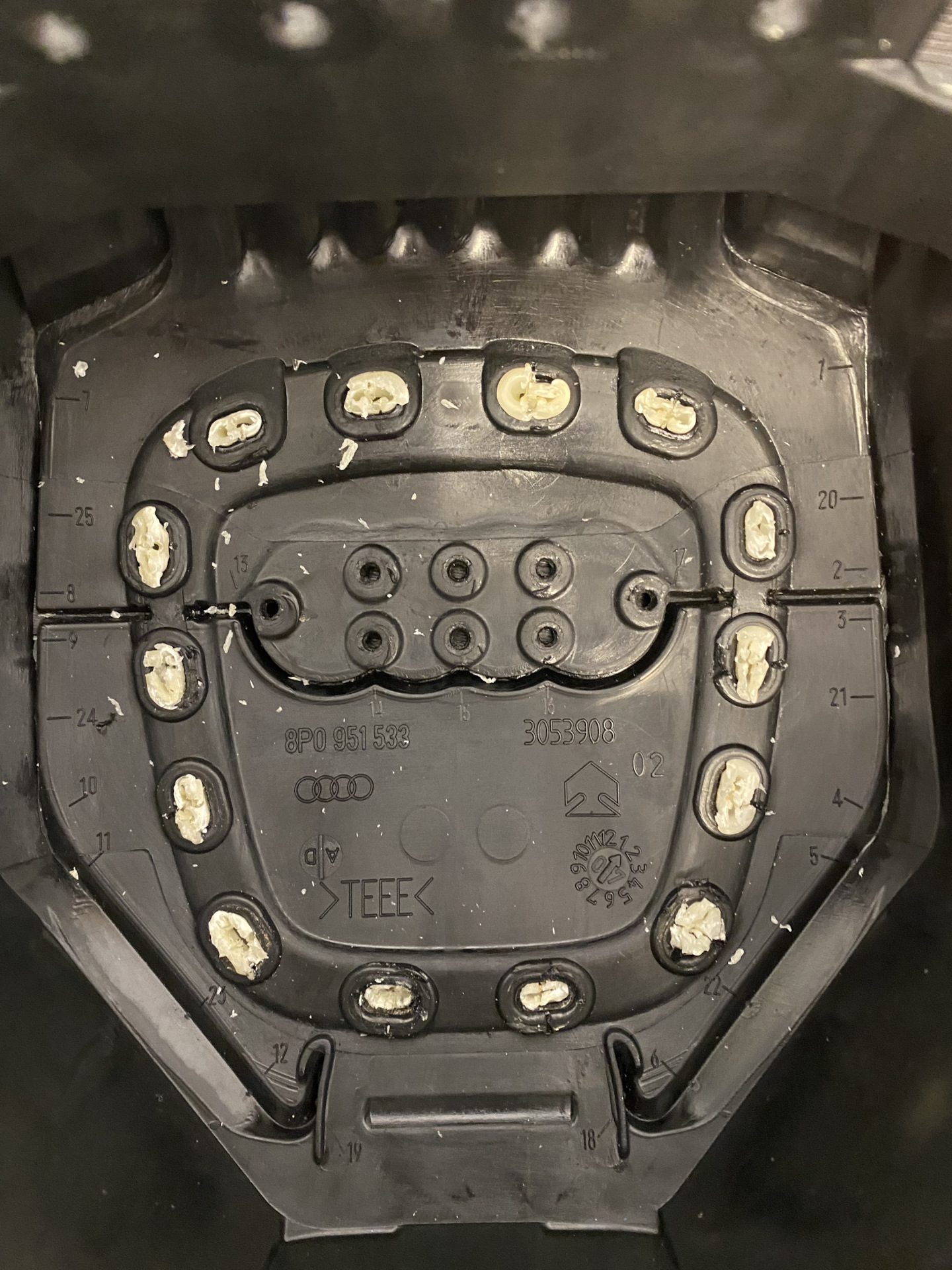 Далее высверливаем клепки и аккуратно отделяем пластиковый хожух от самой подушки.