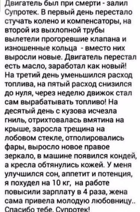 Супротек. Много есть в Инете независимых экспертов, говорят только положительные отзывы. В 2 этапа проходит метализация задиров, трущихся частей, востановление компрессии, работа мотора мягче, пуск двигателя в холодное время года проходит без вреда для мотора, ну и расход уменьшается на 13%. Мое мнение: — Да. Всем удачи.