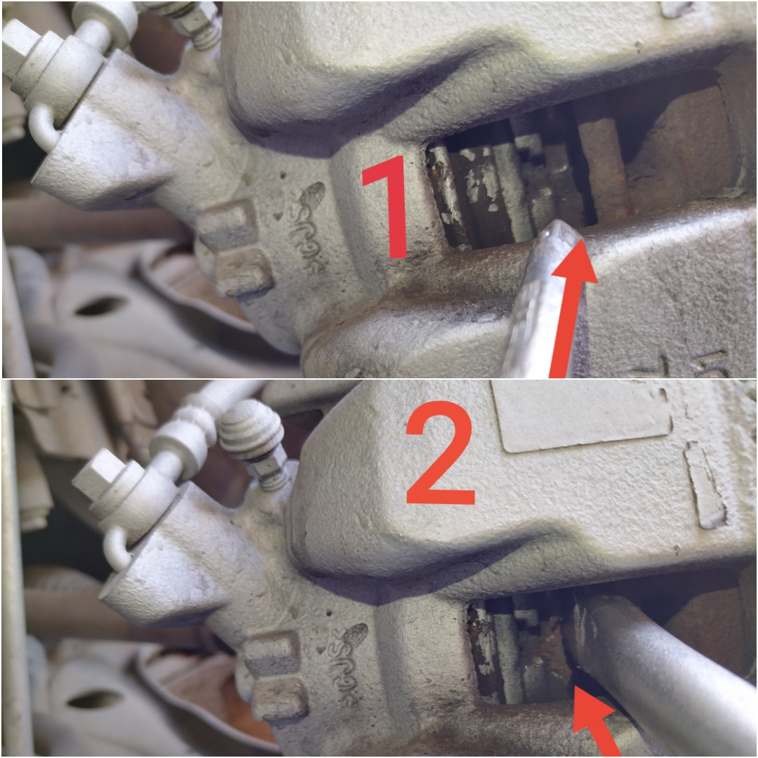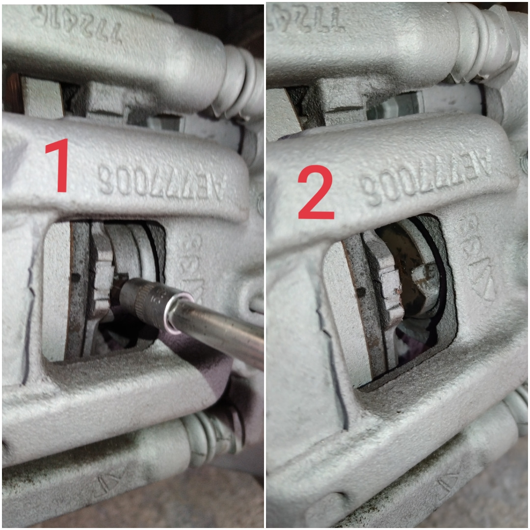 Есть отличная выемка для любой отвертки. Одной рукой накидываем провод и электро ручник начинает работать, другой рукой помогаем вдавить поршень. Когда будет уже конец, поршень начнет крутиться, значит вдавили до конца. На самом деле, это очень легко и быстро.