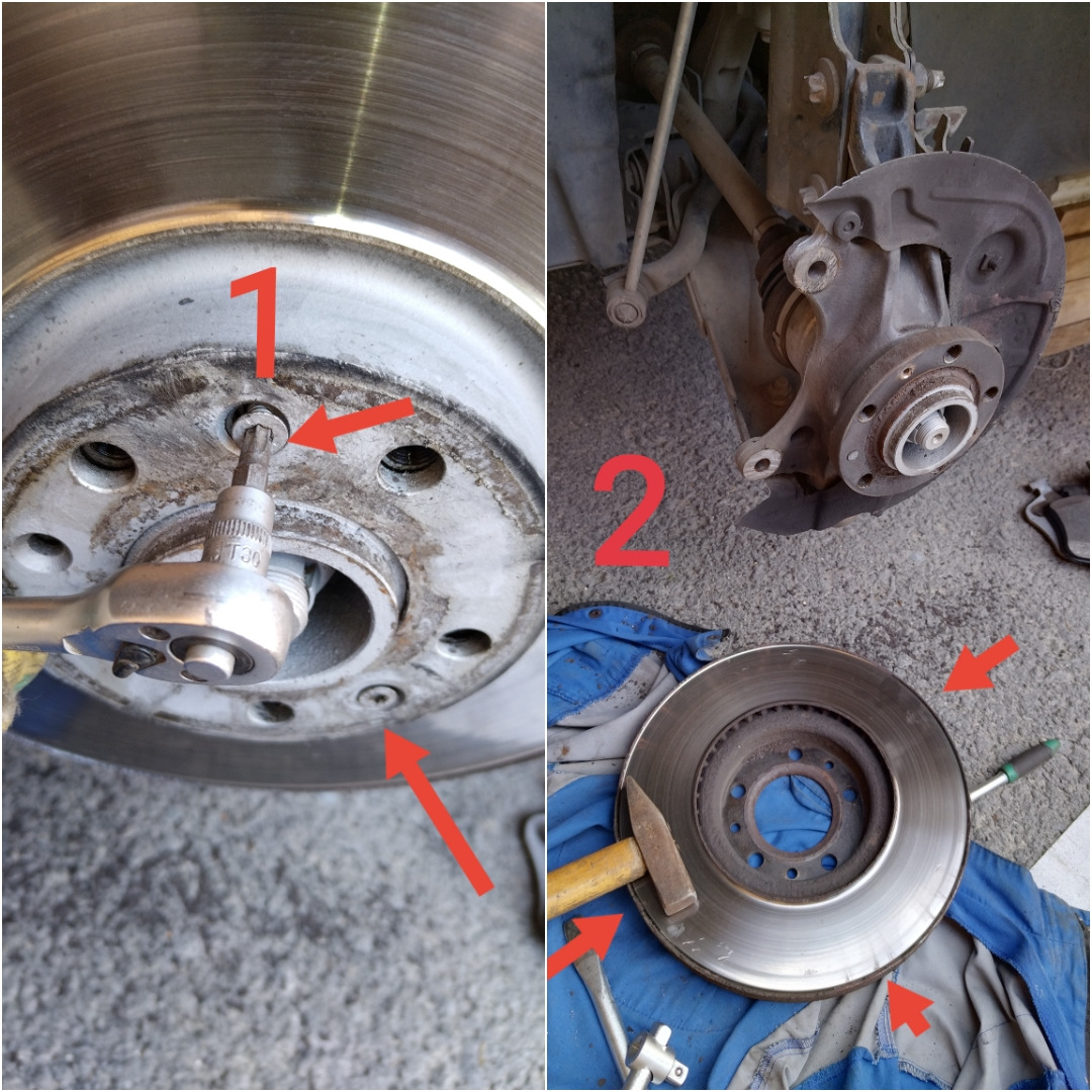 Имея полный доступ к диску, откручиваем 2 болта головкой ТОРКС Т30. Затем стаим машину на N-ейтралку, что бы крутить ступицу. Аккуратно молотком постукивая с обратной стороны, крутим ступицу, что бы диск равномерно выходил. Достаточно 3-4 ударов и диск на асфальте.