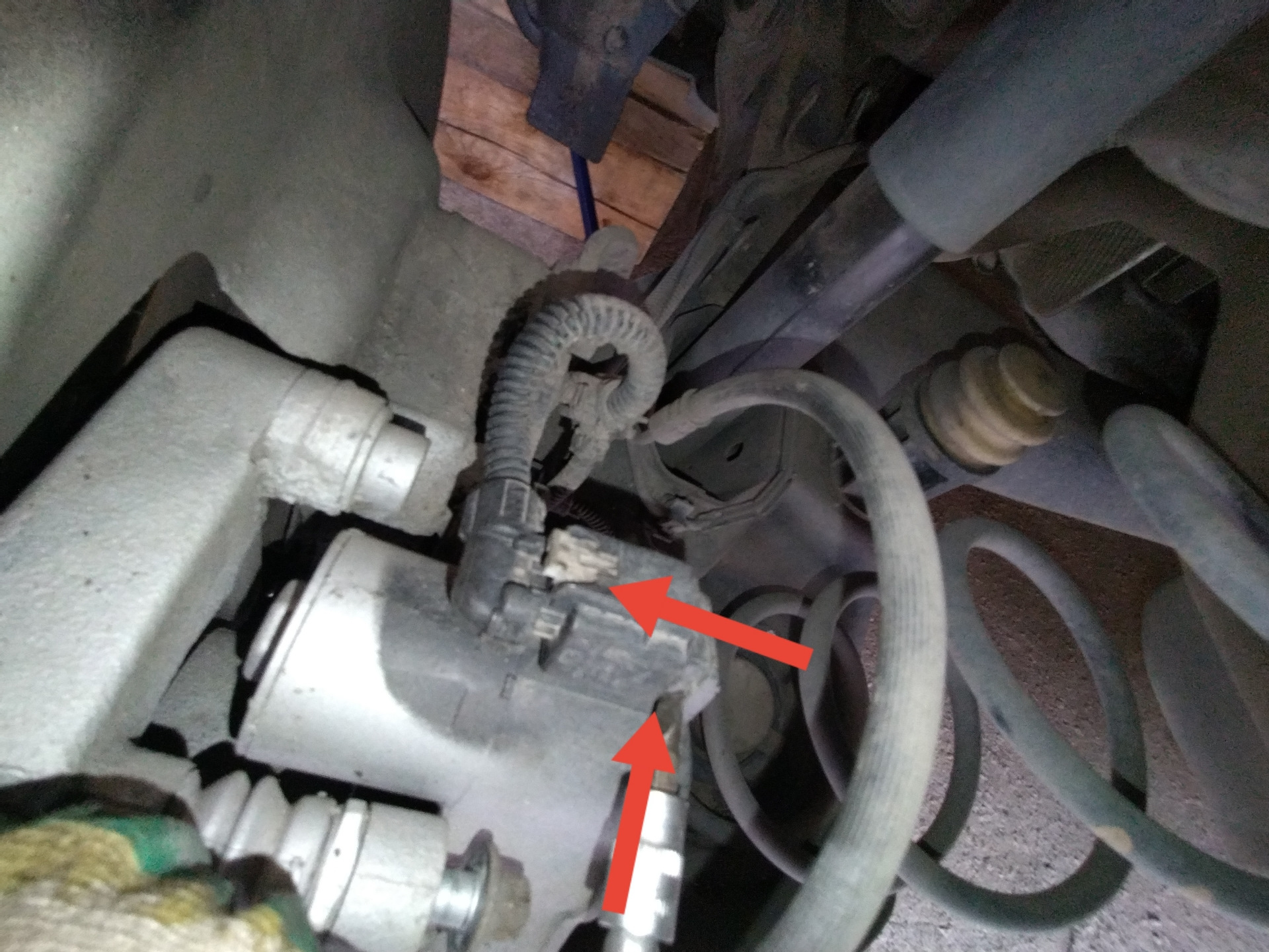 Снимаем фишку с электро ручника. Серую защиту с фишки отводим в сторону и одновременно нажимая на неё, другой рукой помогаем отверткой отщелкнуть фишку. Снимать и ставить оказалось тяжелее, чем вдавить поршень! Просто там грязь и песок…
