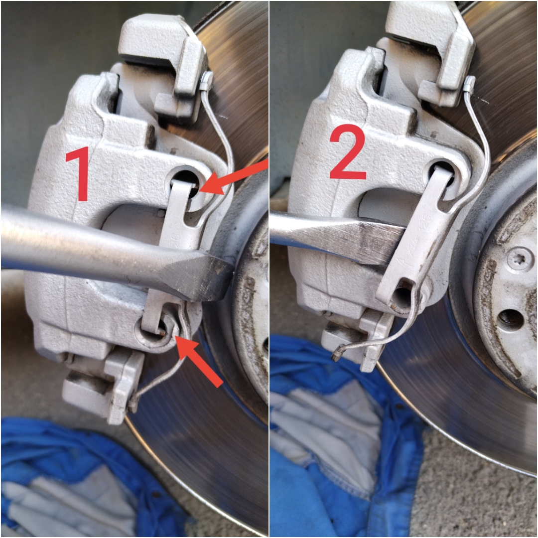 Данные скобы, упруго держат задние колодки, так что колодки вытаскиваются вместе с ними, снимаем скобы со старых и ставим на новые.