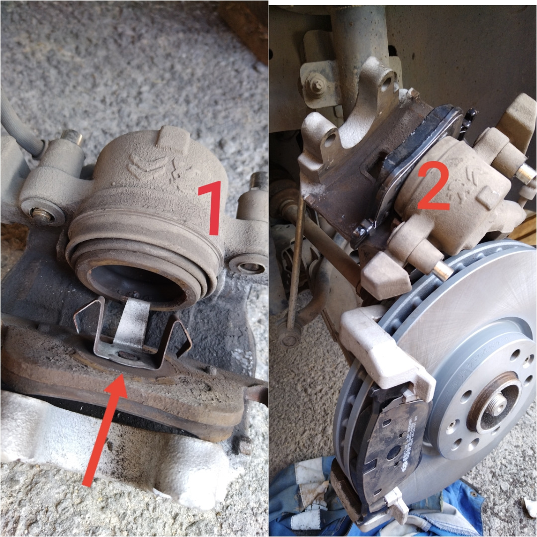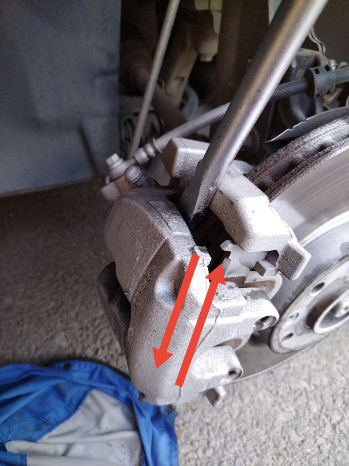 Снимаем скобу с суппорта. Оттягиваем вверх, что бы крепление скобы вылезло из отверстий (как показано стрелками), что бы потом как на рисунке 2, отвести в сторону эту скобу и снять её.