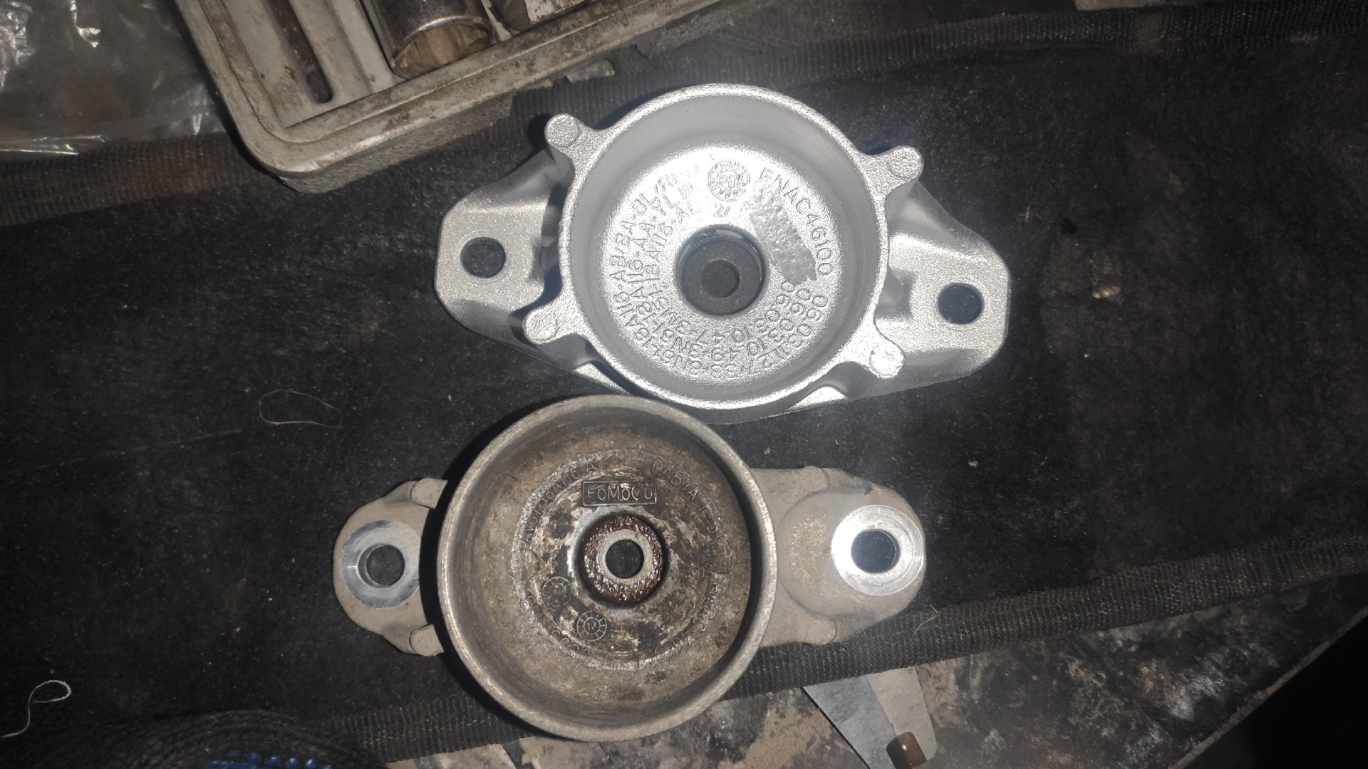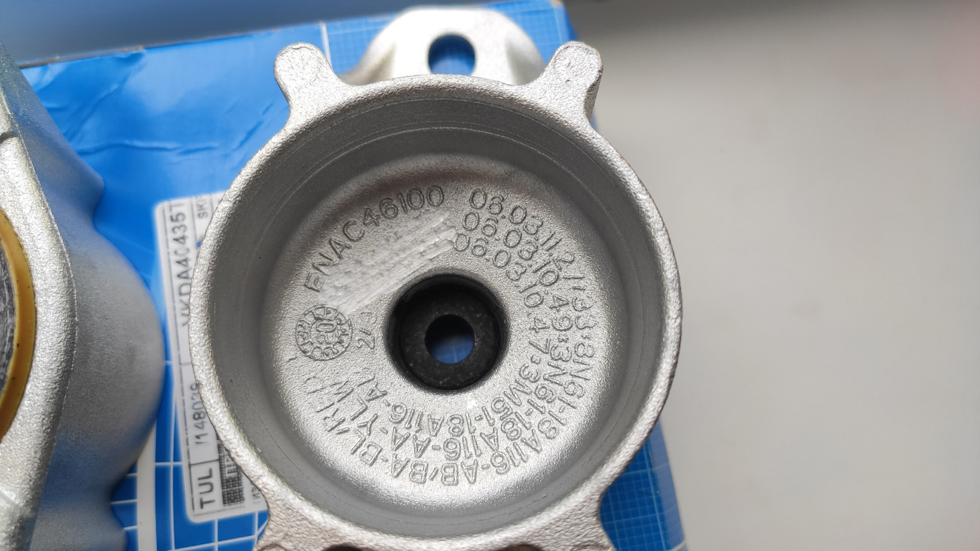 Комплект опор стоек взял фирмы SKF VKDA 40435T Вот с задними опорами я долго не мог разобраться что брать. По отдельности ценник конь, надо было найти именно комплект. Чаще всего натыкался на номера комплектов от Focus 2, а вот на Focus 3 артикул надо было еще найти, что я и сделал. На опорах видно место где затёрто клеймо Fomoco.