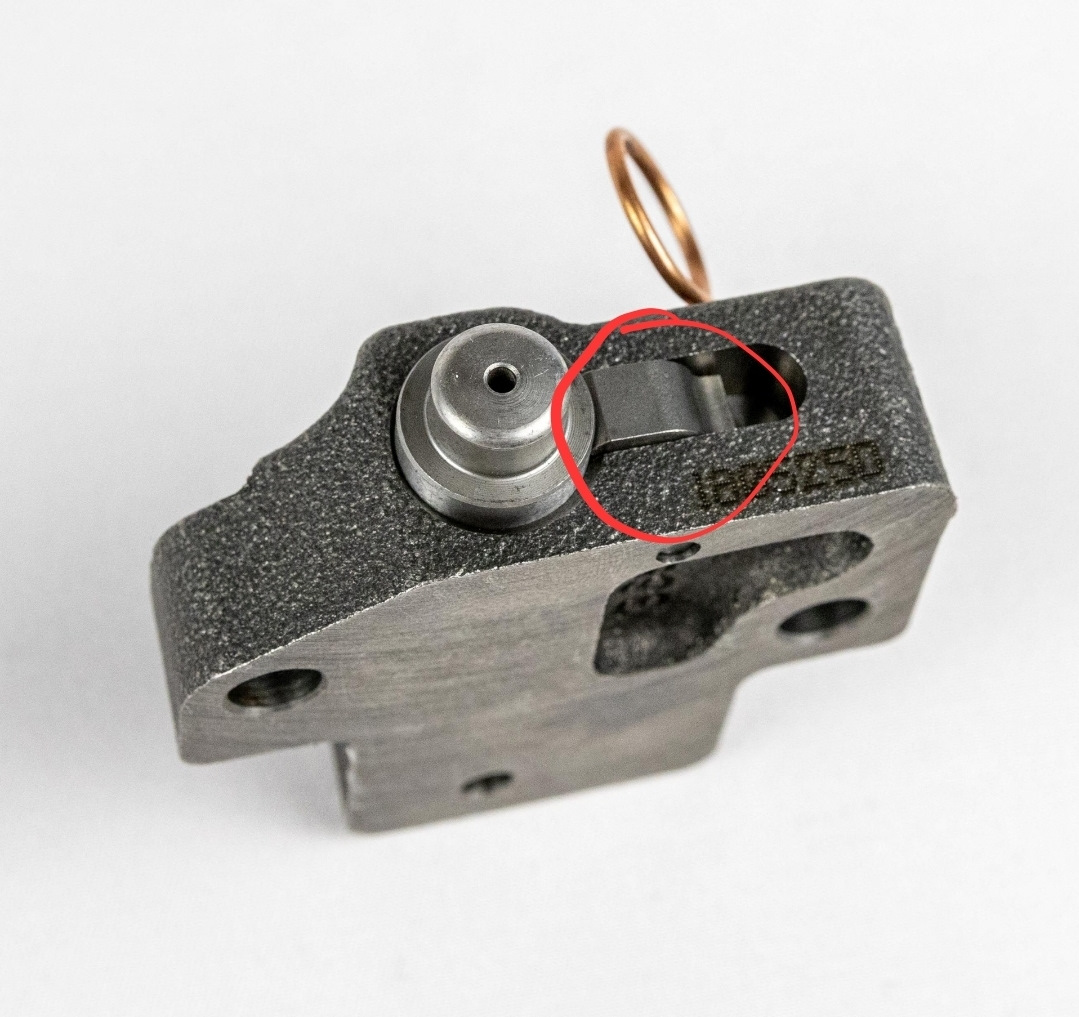 Однако, например, в других двигателях Kia Hyundai, таких как G4KD Ix35 были внедрены натяжители иной конструкциии, которые препятствуют провисанию цепи после остановки двигателя (смотрите обведенное красным) и мне кажется используется другой материал корпуса.