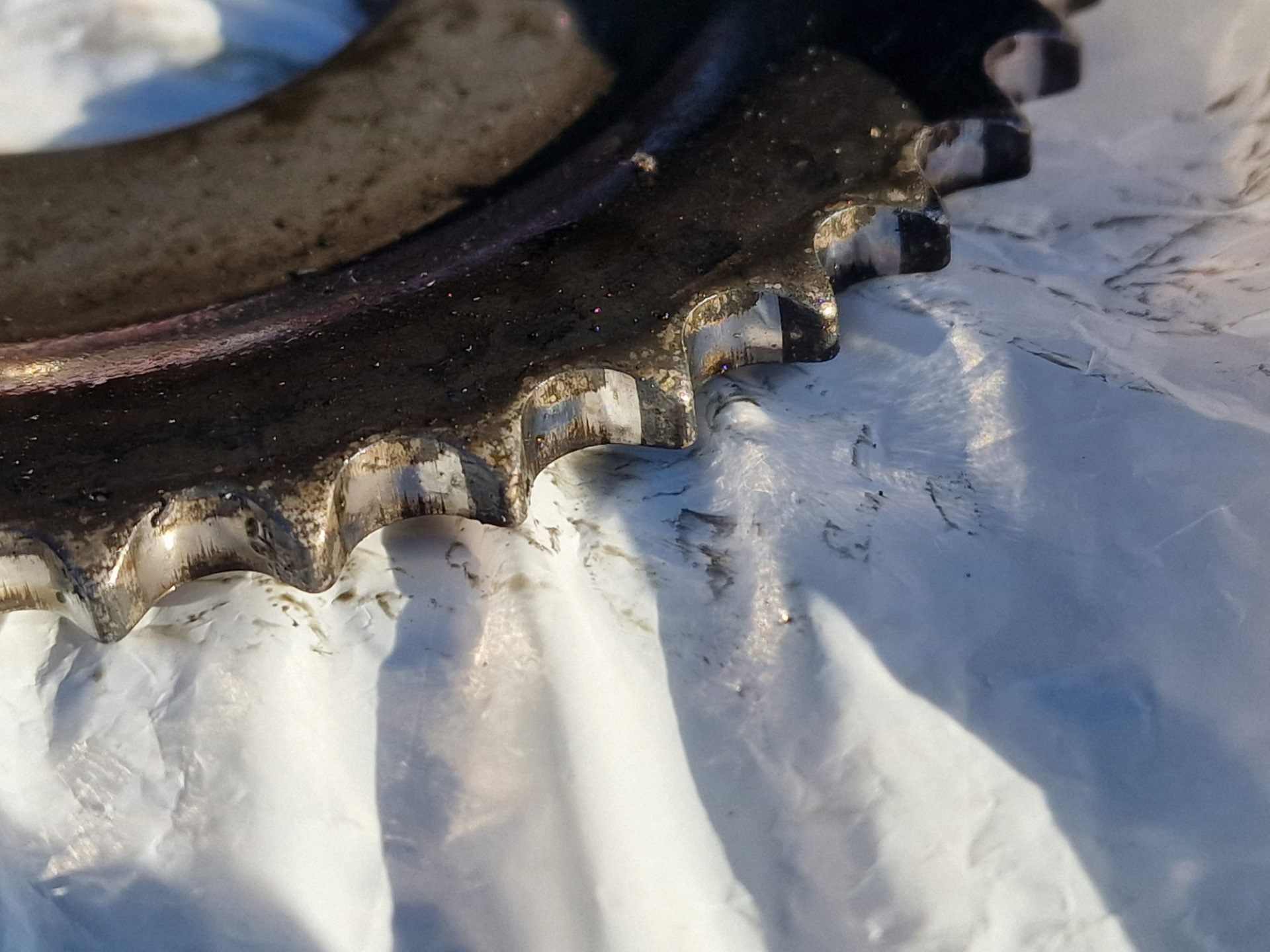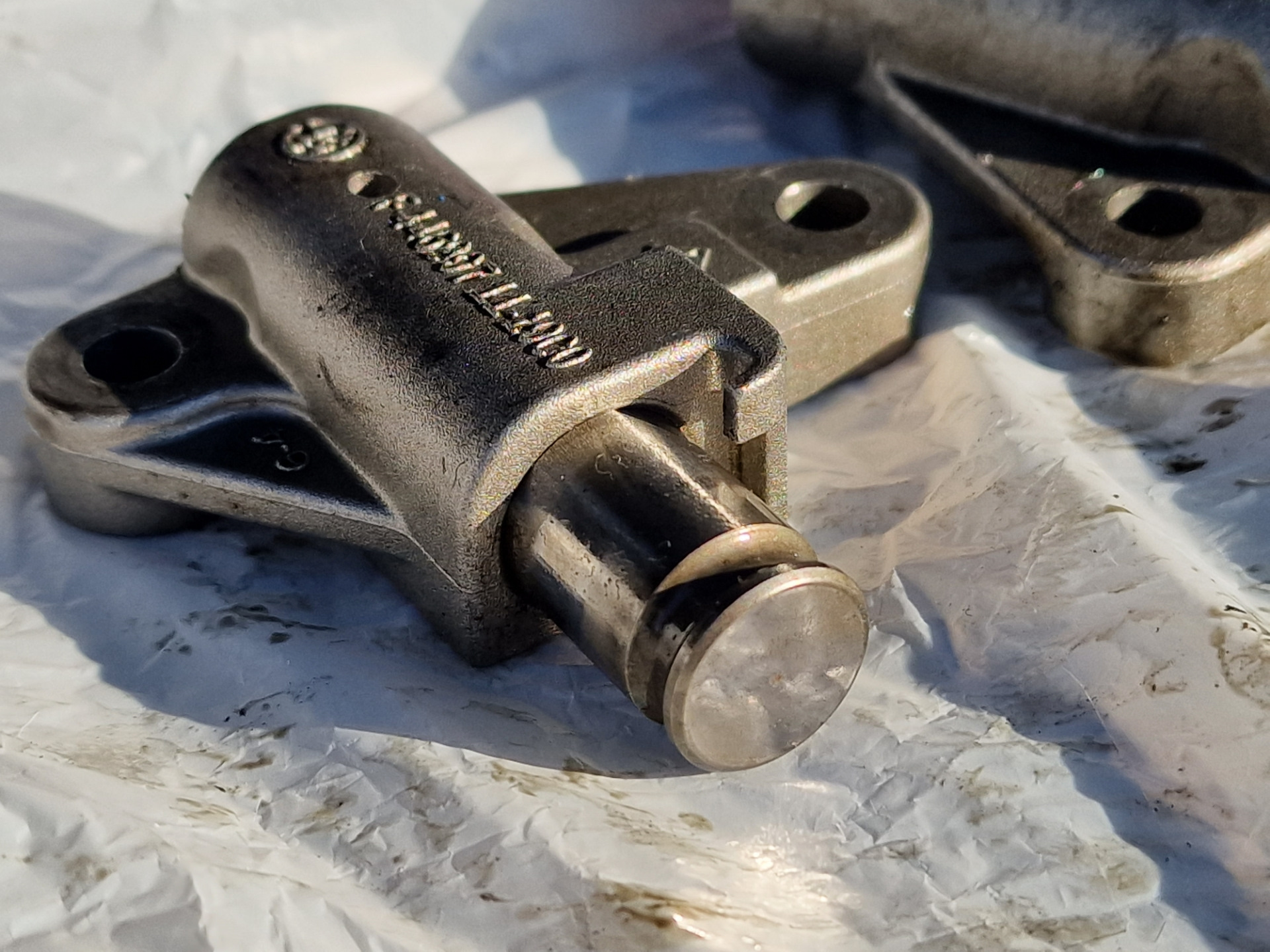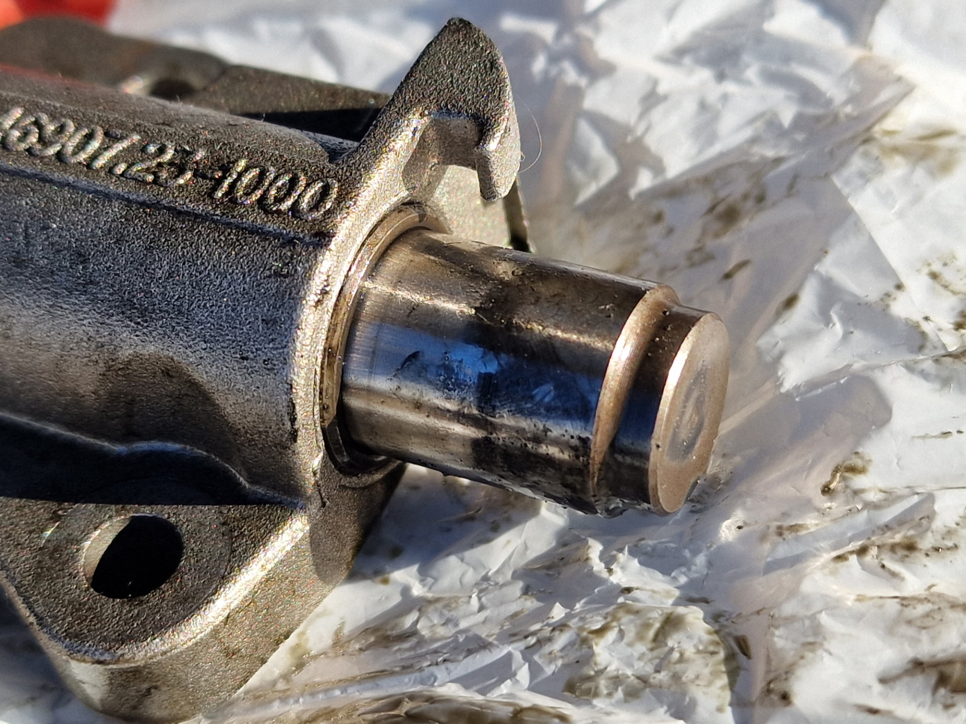 Разбор снятых заводских натяжителей показал, что как и под передней крышкой двигателя при замене цепей (потом было замыто до блеска) были следы переката масла и его отложений из-за редких ТО первого владельца. Эти отложения внутри натяжителей, на цепях и на звёздочках. В целом по мотору частыми ТО раз в 7.5ткм за 70ткм после покупки внутри мотор отмыл хорошо. Но натяжители и звезды в налете и заменены на новые.