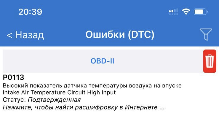 В итоге как до гаража добрался решил махнуть их сразу. Поменял, запустил двигатель и после перегазовки выскочил service engine soon (check engine). Хорошо под рукой был obd сканер, подключил и увидел что вылетела ошибка Intake Air temperature Circuit High Input 🤔.