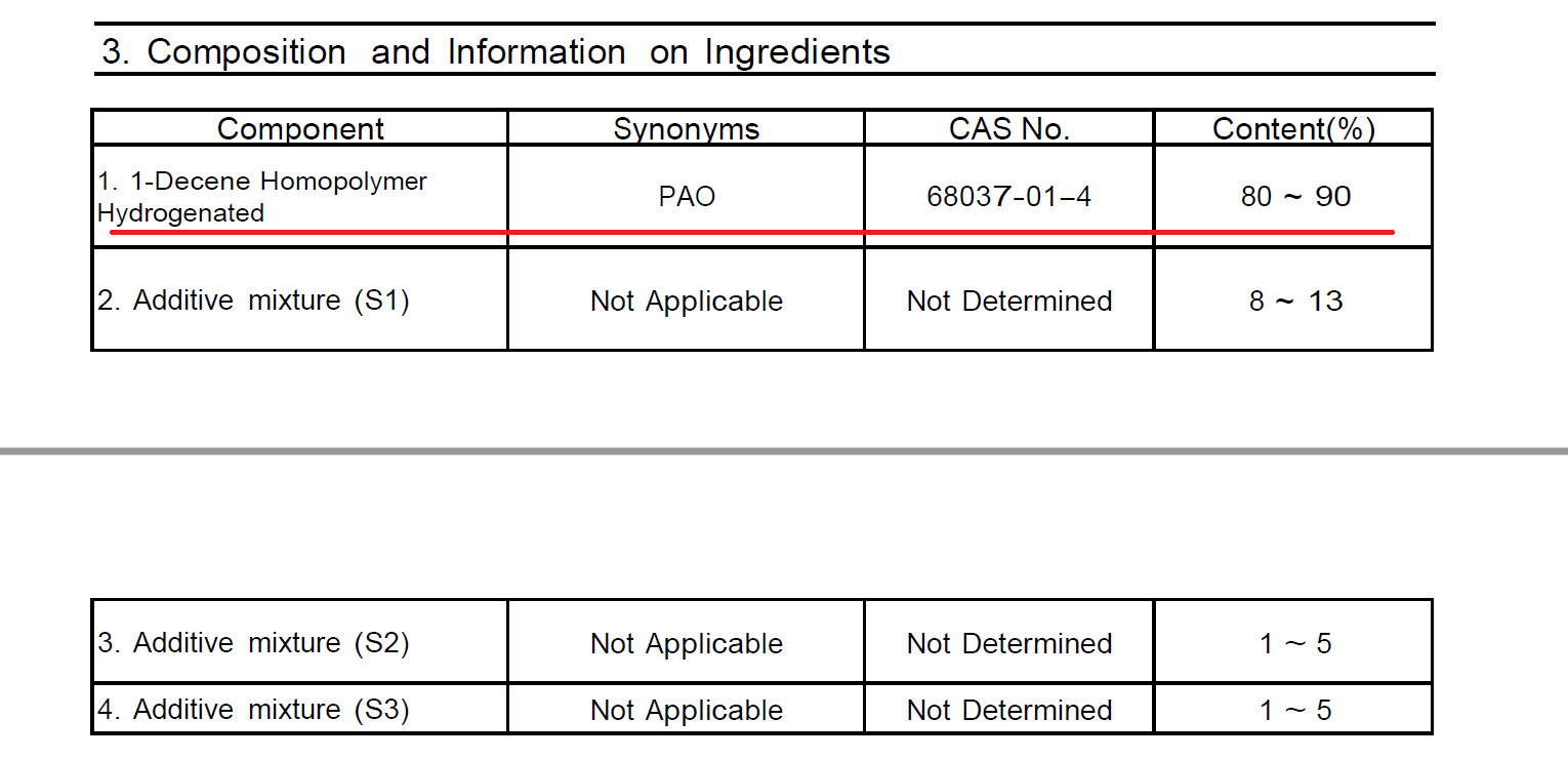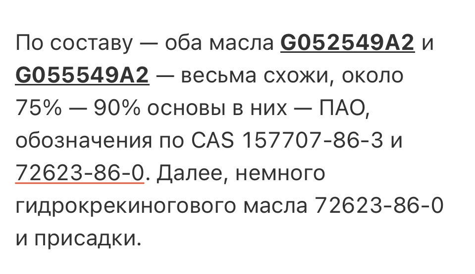 По составу — оба масла G052549A2 и G055549A2 — весьма схожи, около 75% — 90% основы в них — ПАО, обозначения по CAS 157707-86-3 и 68037-01-4. Далее, немного гидрокрекиногового масла 72623-86-0 и присадки.