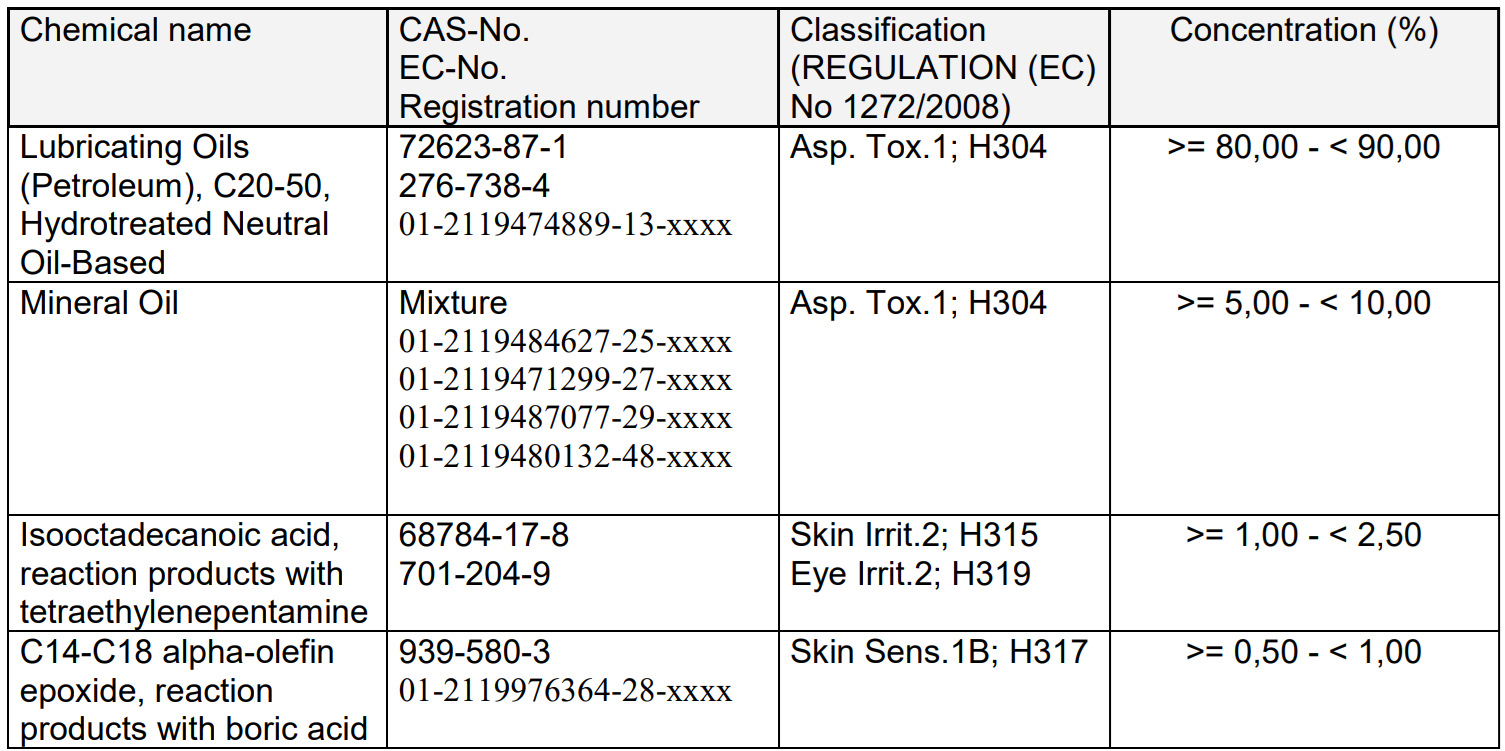 Самое интересное в этих документиках — это состав продукта c примерными пропорциями. Компания ни за что добровольно не выдаст рецепт, но государственный регулятор их заставляет. После продолжительных поисков нашел VAG-ские даташиты на масла, на польском языке на всю линейку VAG-овских масел для DSG, вытянул оттуда заявленные параметры масел и свёл их в табличку: