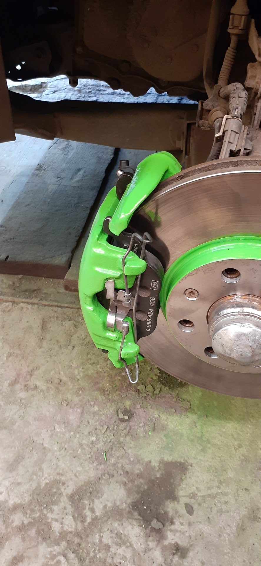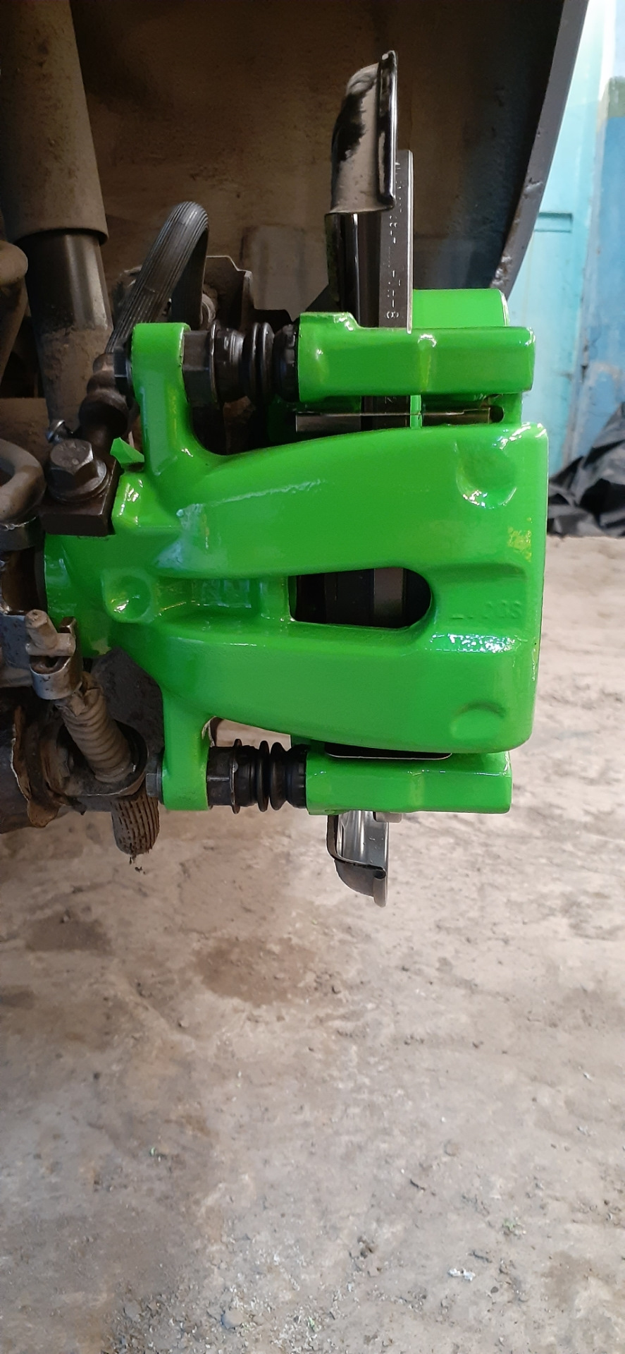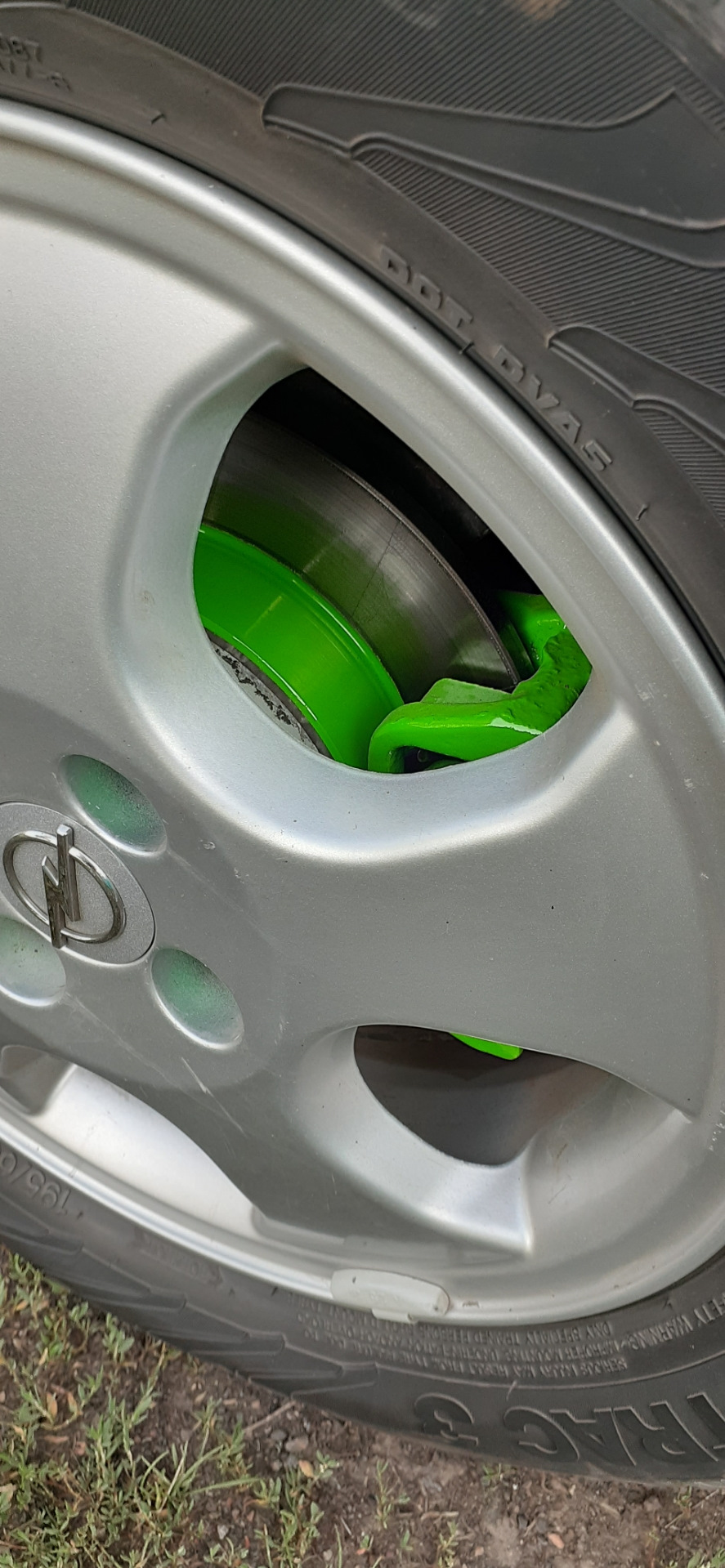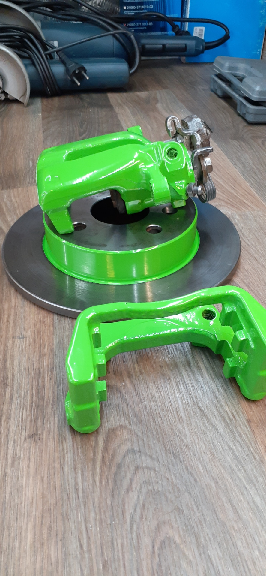Вообщем на каждое колесо это один световой день, чистка, переборка, обклейка и покраска в 3 — 4 слоя, если делать меньше слоёв то эфекта ноль, краску брал на OZON для супортов ( 350 р за болончик ) на 1 колесо 1 балончик, цвет захотел яркий ( яблоко ) но это дело вкуса, в живую гораздо сочнее выглядит, ну и за одно колпачки на болты почти в цвет, результатом доволен, супорта как новые как внутри так и снаружи, в ближайшее время заменю тормозную жидкость на ( Моноловскую ) и порядок !