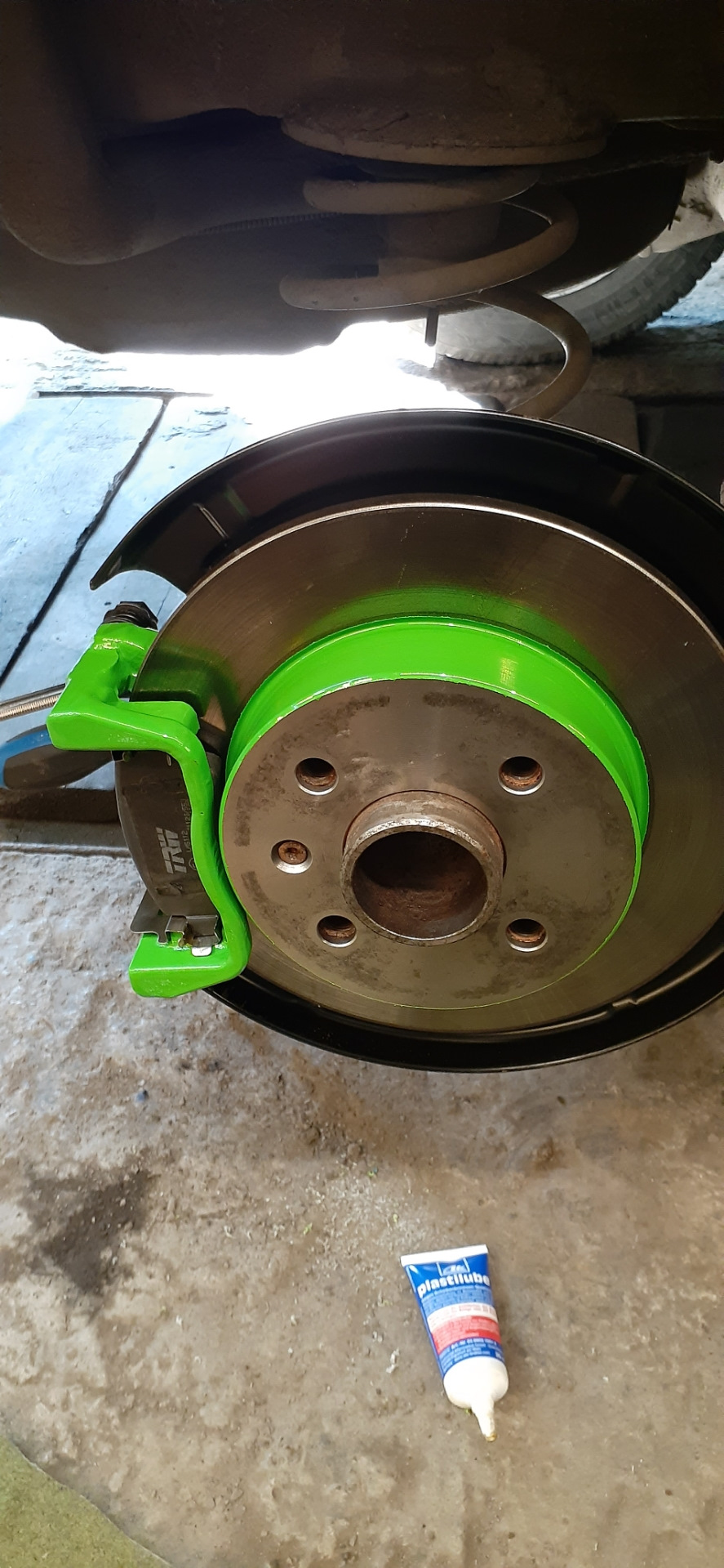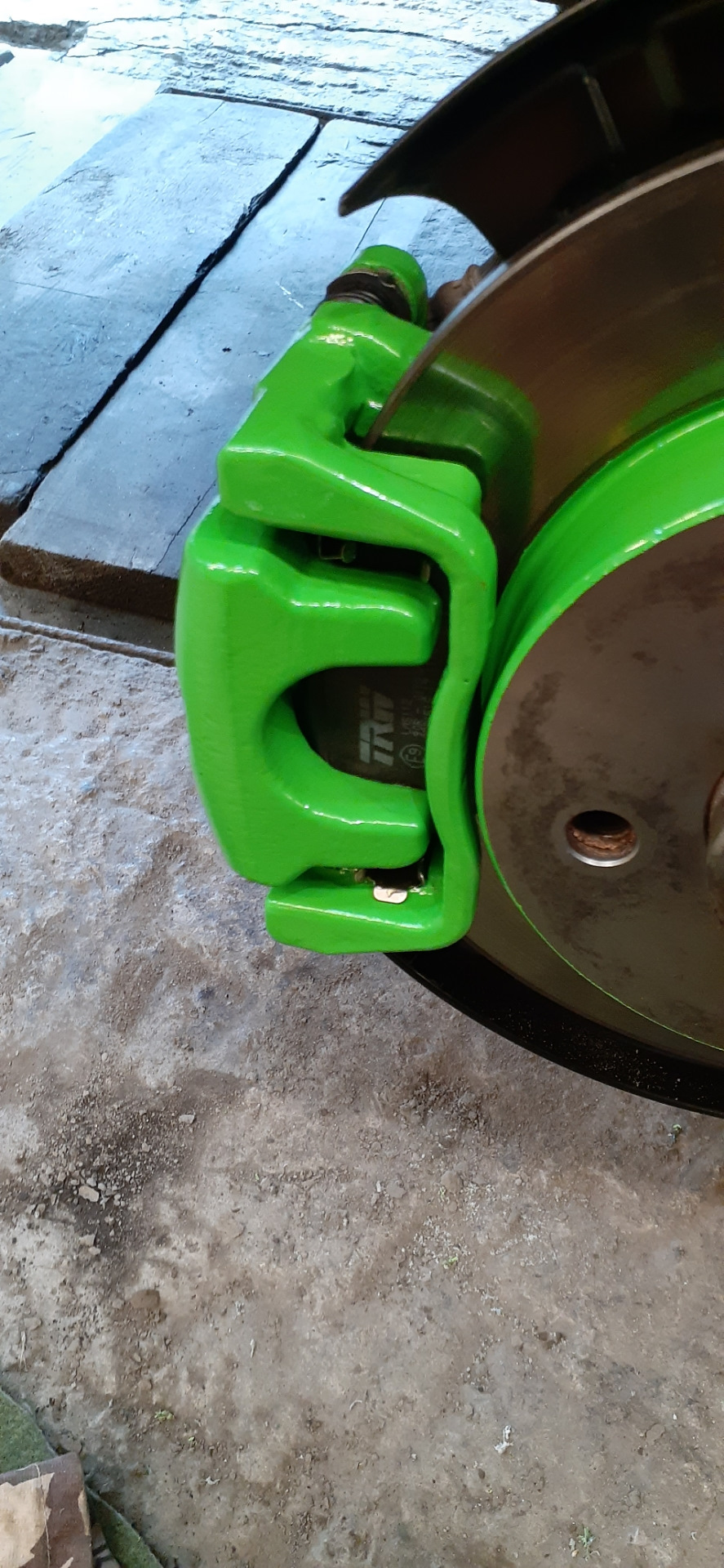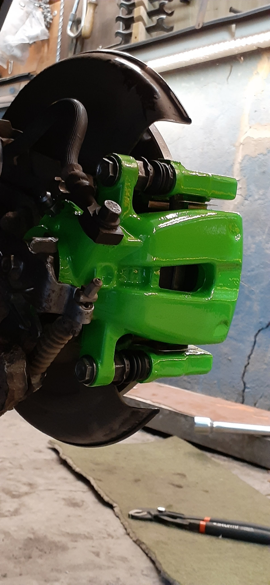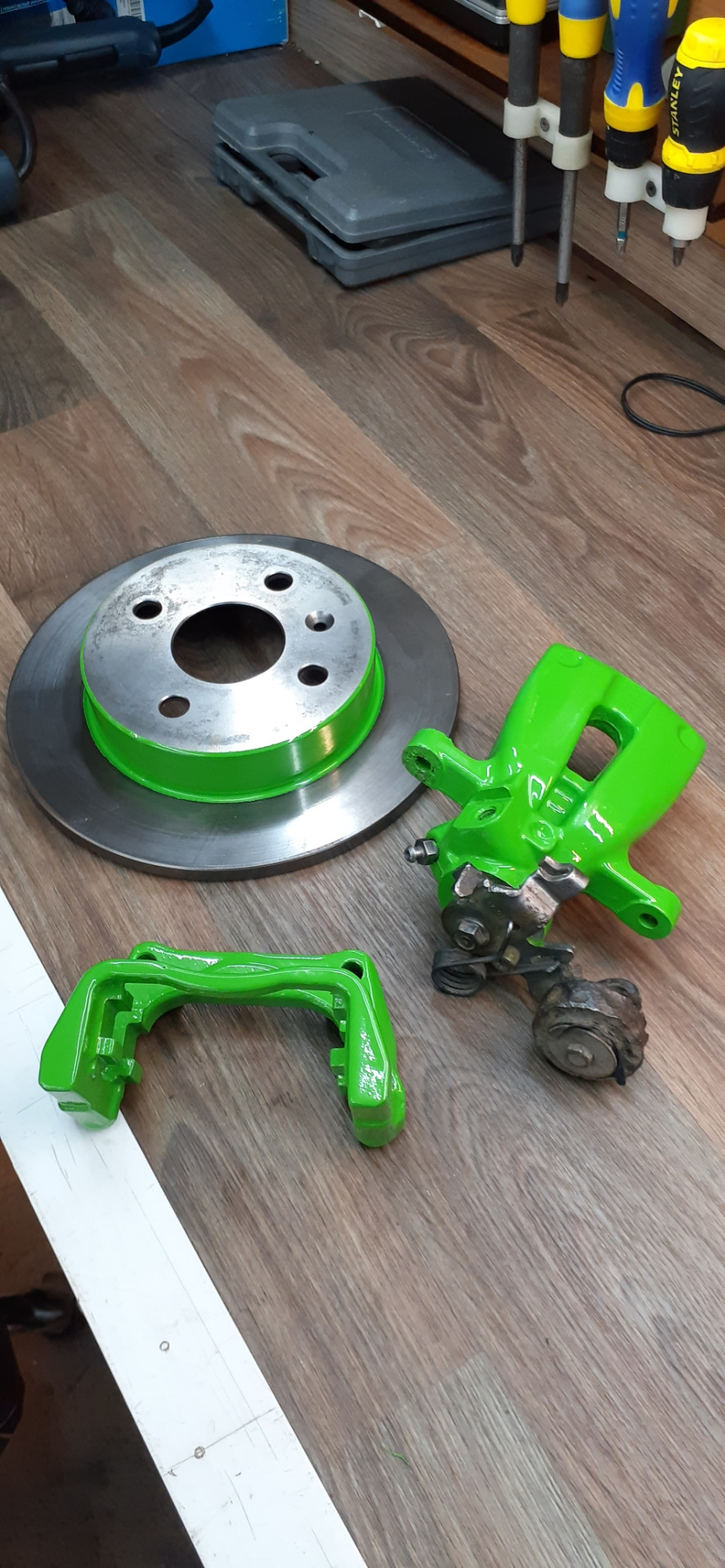 Вообщем на каждое колесо это один световой день, чистка, переборка, обклейка и покраска в 3 — 4 слоя, если делать меньше слоёв то эфекта ноль, краску брал на OZON для супортов ( 350 р за болончик ) на 1 колесо 1 балончик, цвет захотел яркий ( яблоко ) но это дело вкуса, в живую гораздо сочнее выглядит, ну и за одно колпачки на болты почти в цвет, результатом доволен, супорта как новые как внутри так и снаружи, в ближайшее время заменю тормозную жидкость на ( Моноловскую ) и порядок !